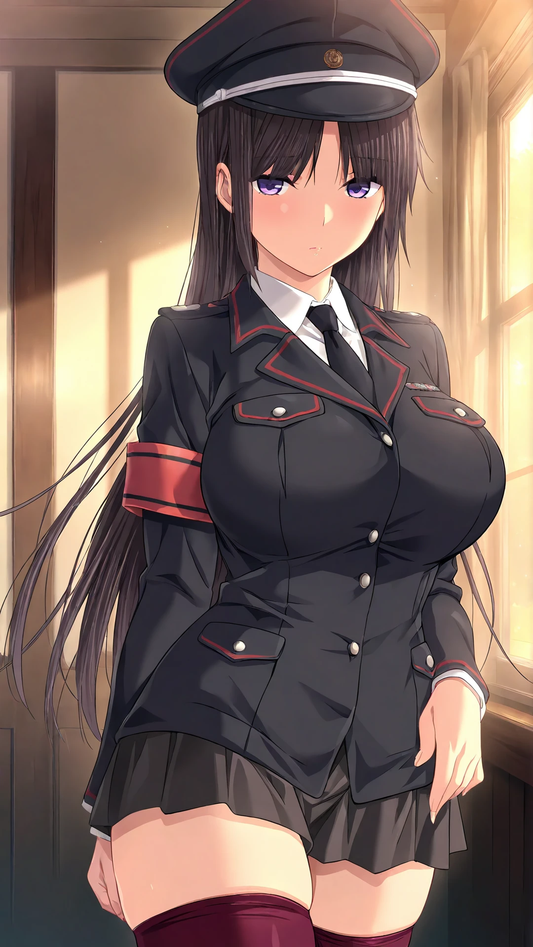 ,Kurotaki Rin,1girl,solo,hat,uniform,long hair,black hair,military uniform,military,purple eyes,skirt,necktie,armband,breasts,large breasts,peaked cap,thighhighs,