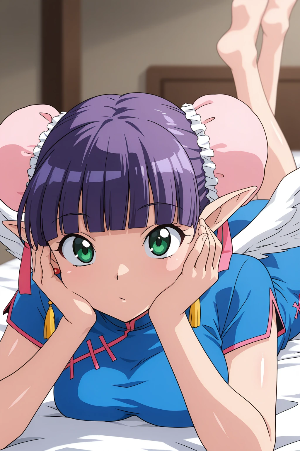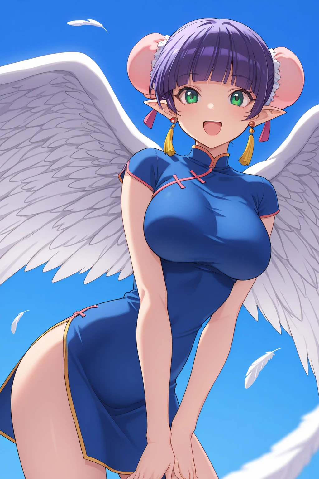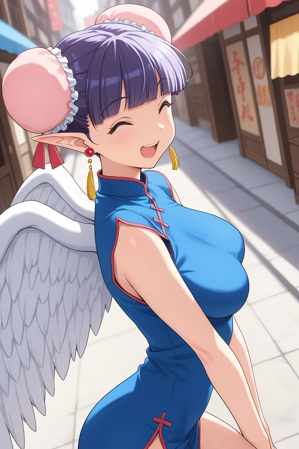 DABH, purple hair, double bun, blue hair, blunt bangs, green eyes, pointy ears, wings, pink bun cover, hair ribbon, tassel earrings, blue china dress, impossible dress, short sleeves, microdress, side slit, white footwear