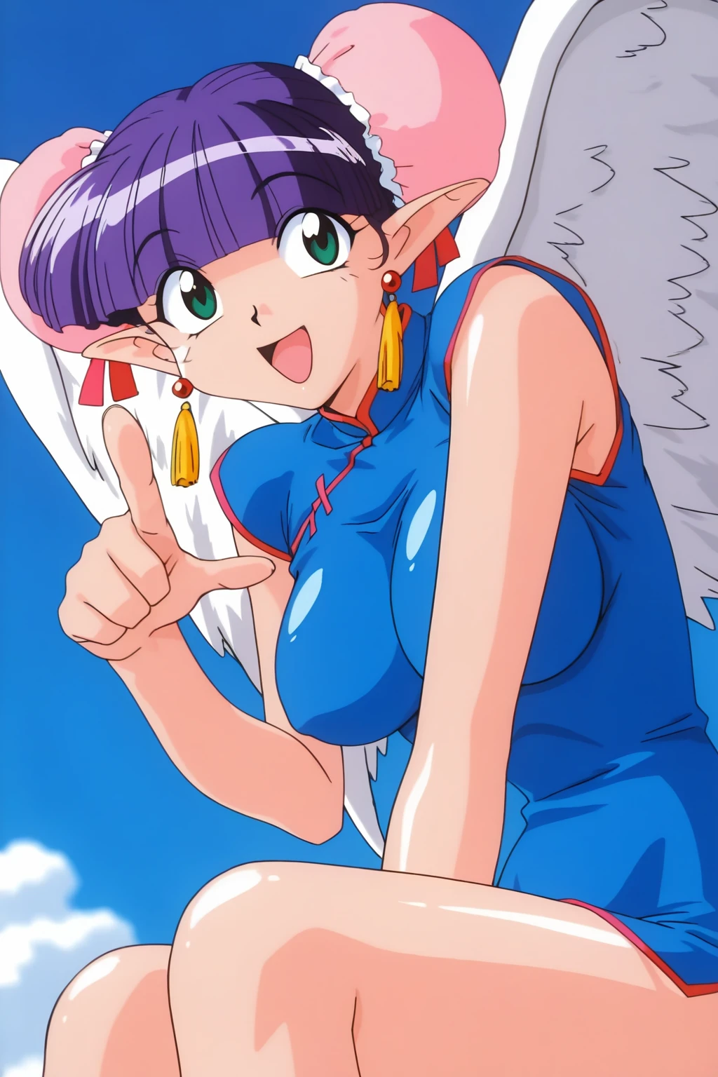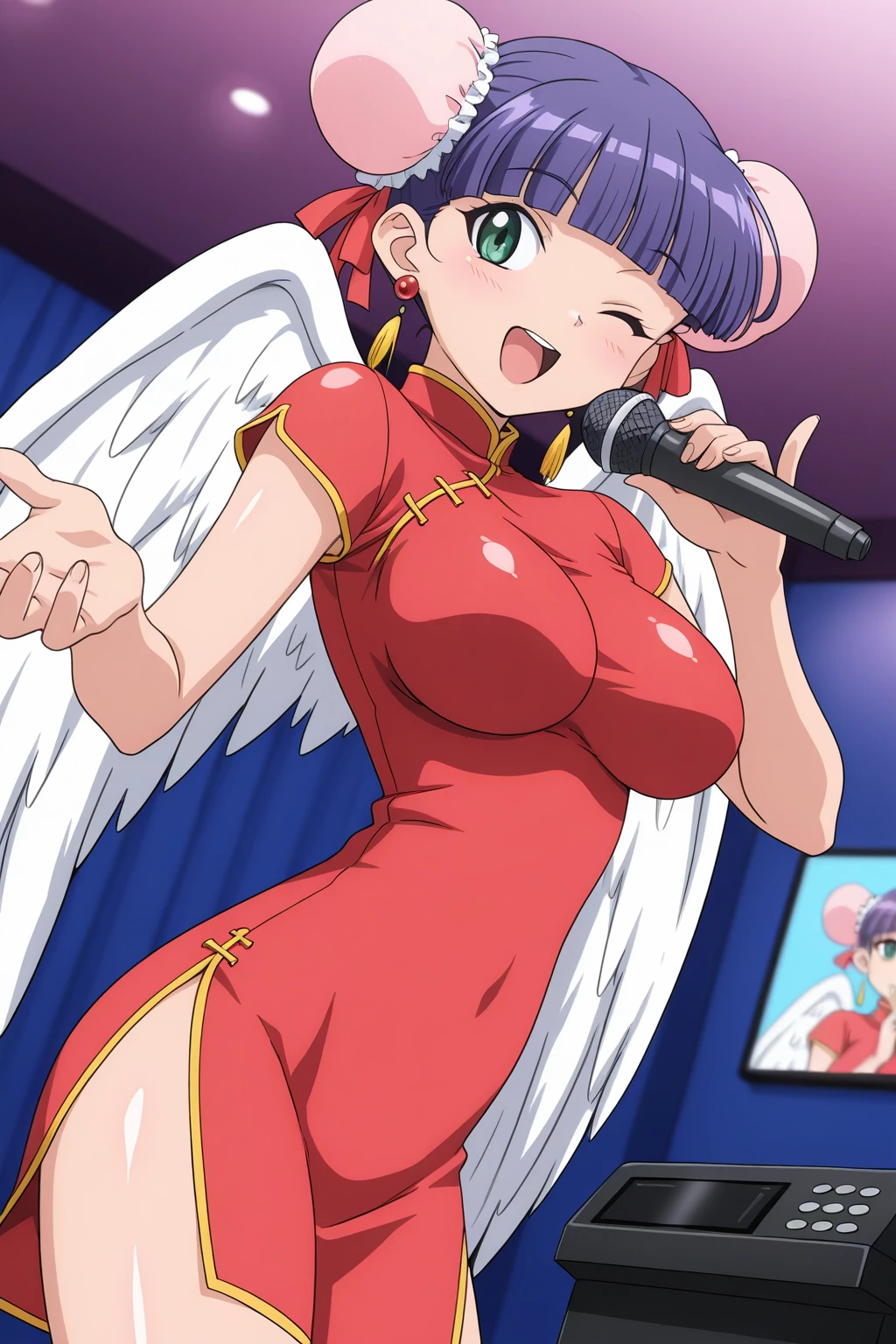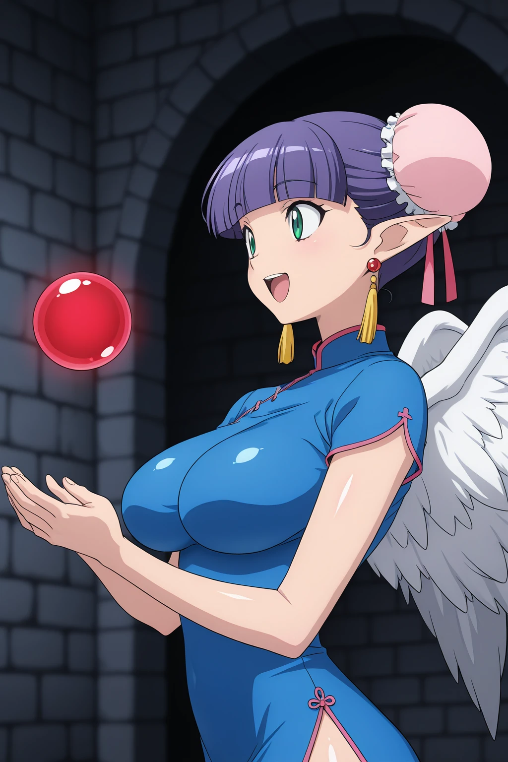 DABH, purple hair, double bun, blue hair, blunt bangs, green eyes, pointy ears, wings, pink bun cover, hair ribbon, tassel earrings, blue china dress, impossible dress, short sleeves, microdress, side slit, white footwear