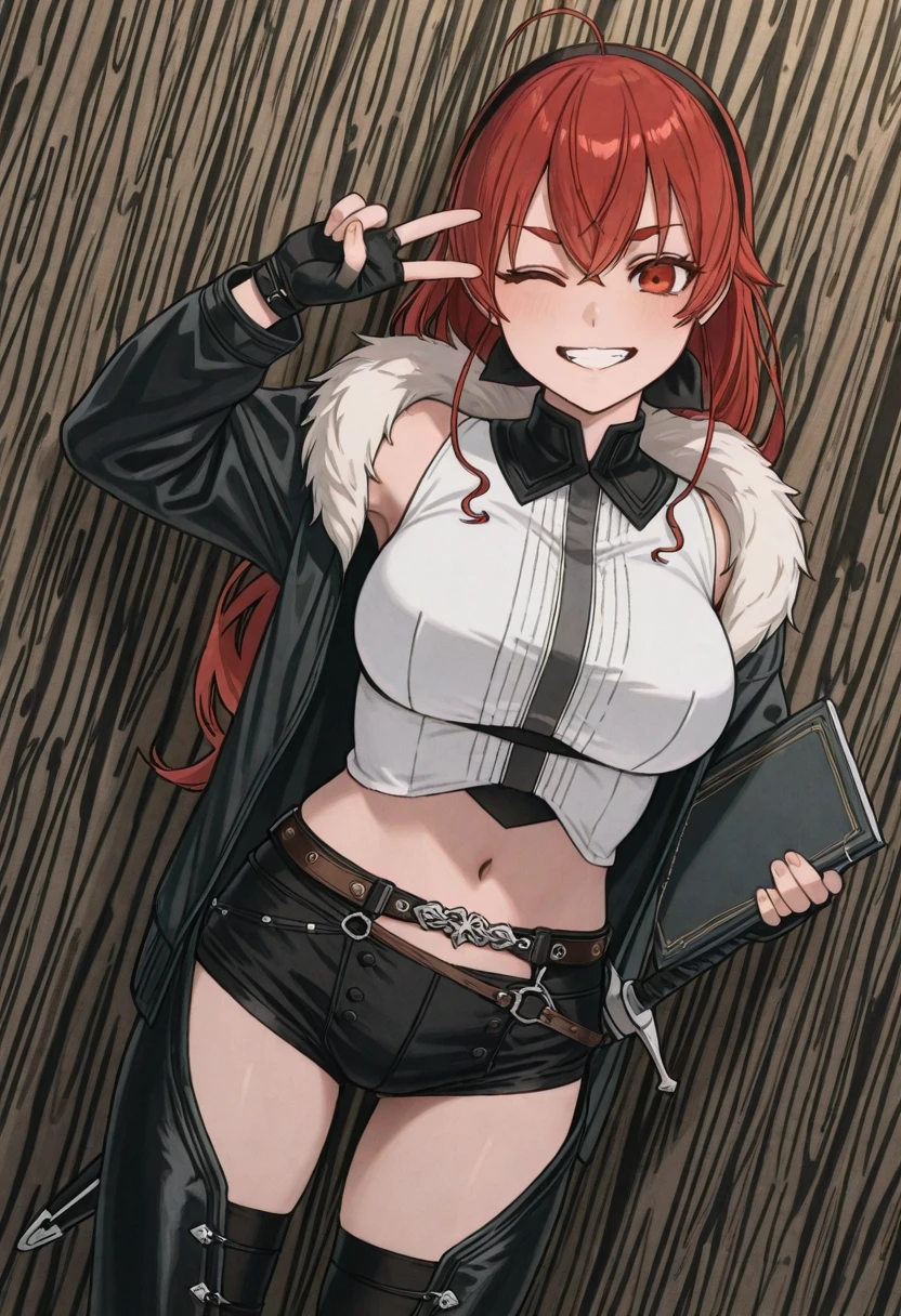 black hair band, open jacket, fur-trimmed jacket, midriff, collared shirt, sleeveless shirt, underbust, belt, short shorts, chaps, thighhighs, sheathed, fingerless gloves, black footwear,