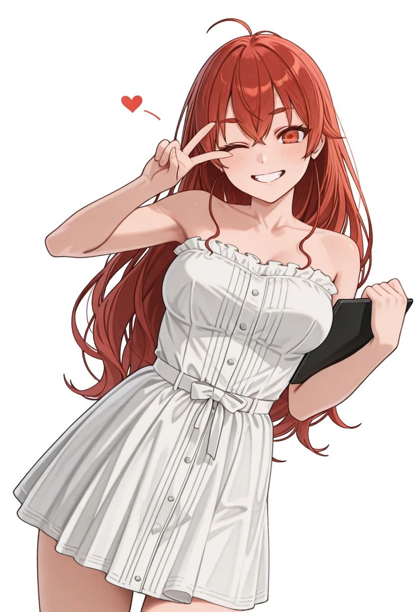 eg7nv, ahoge, breasts, hair between eyes, red hair, red eyes, thick eyebrows, crossed bangs