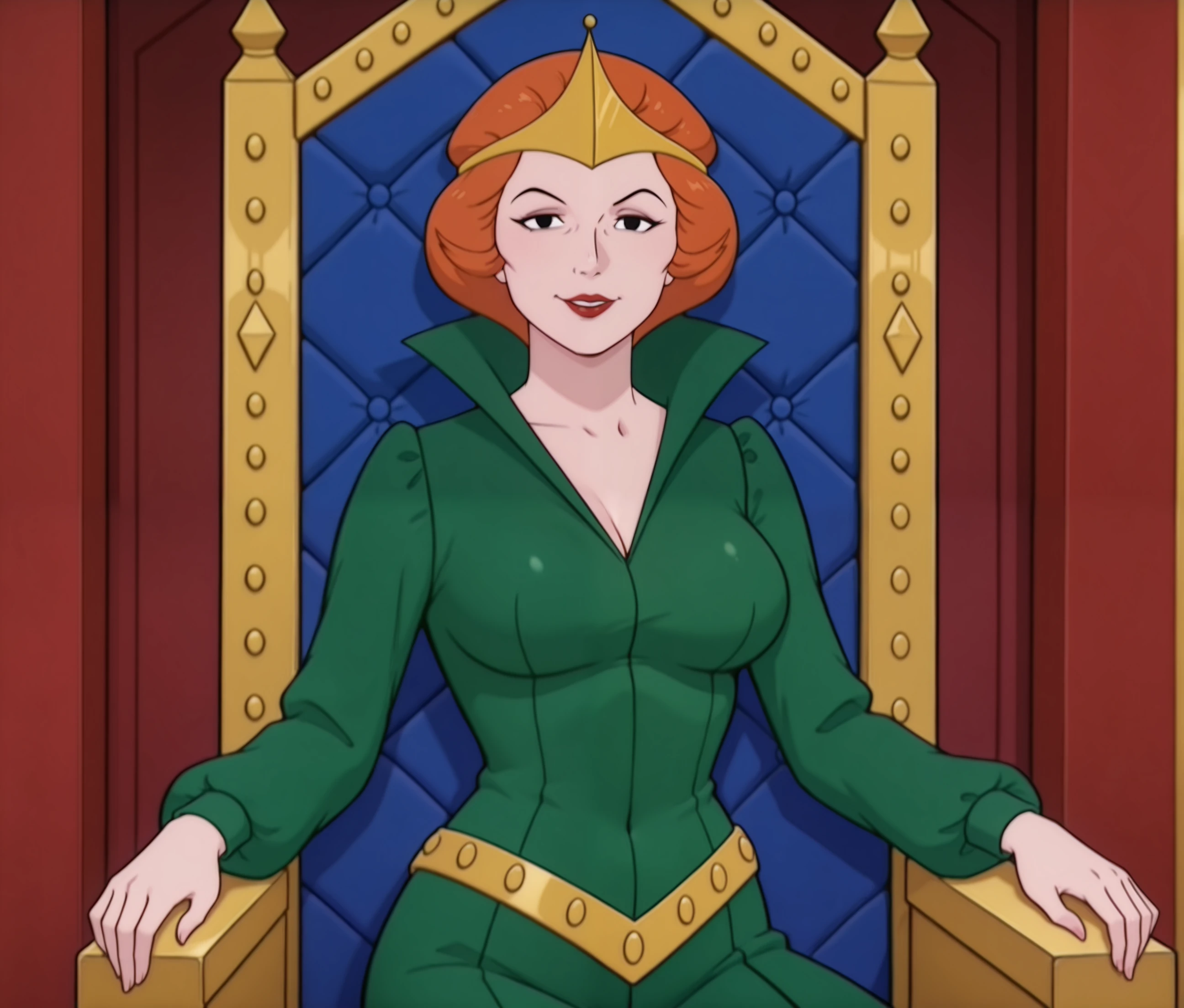 crown, green collared dress, gold belt