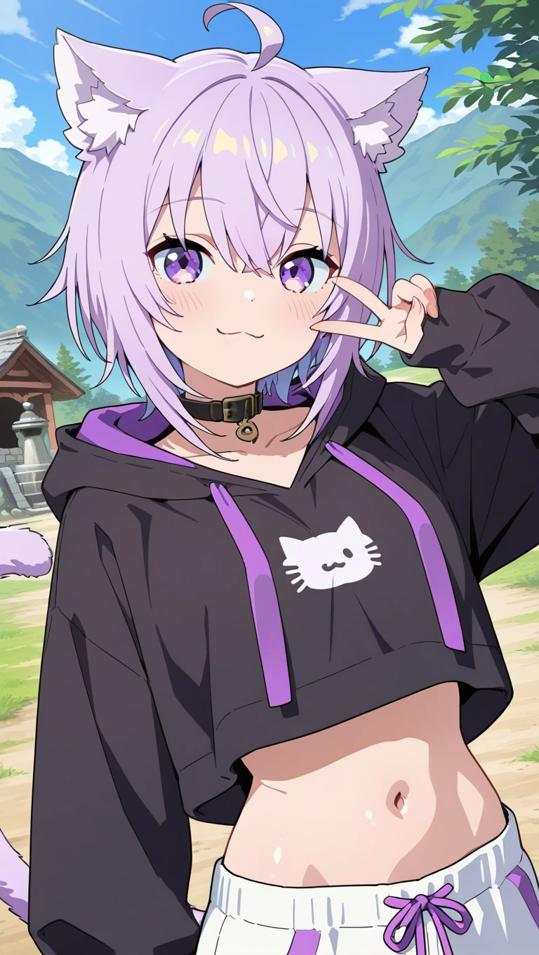 ahoge,cat ears,animal ear fluff,short hair,purple hair,hair between eyes,purple eyes,:3