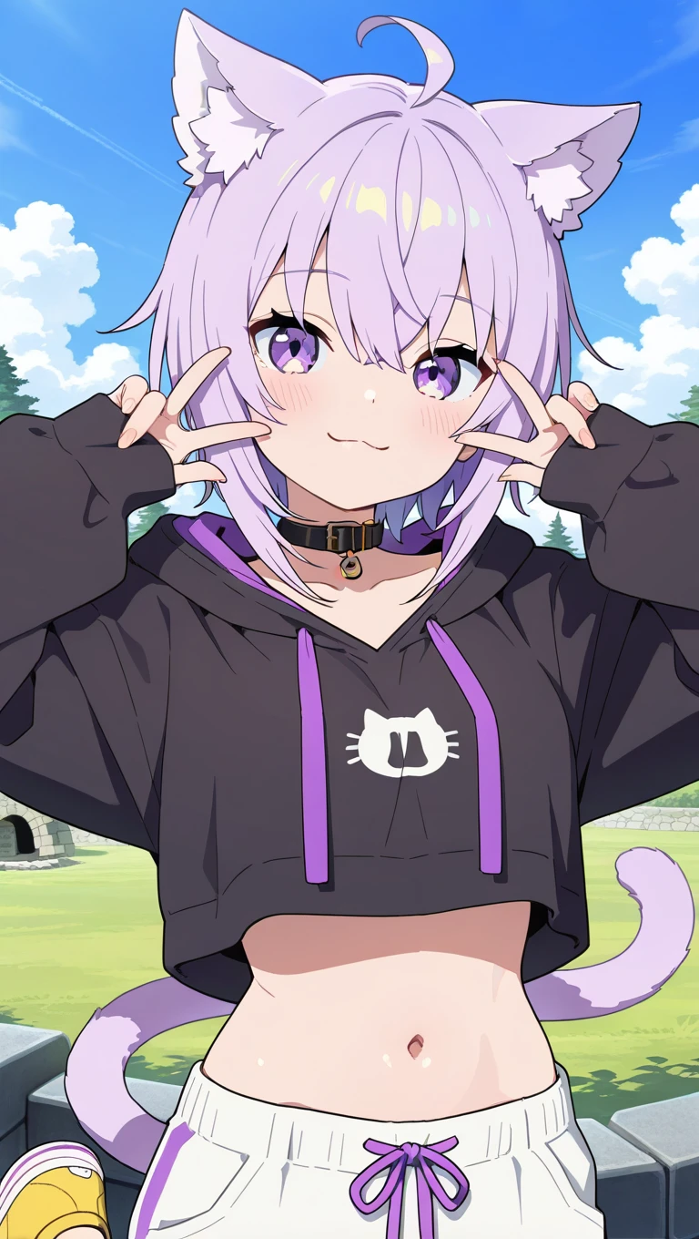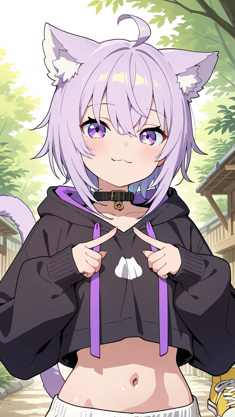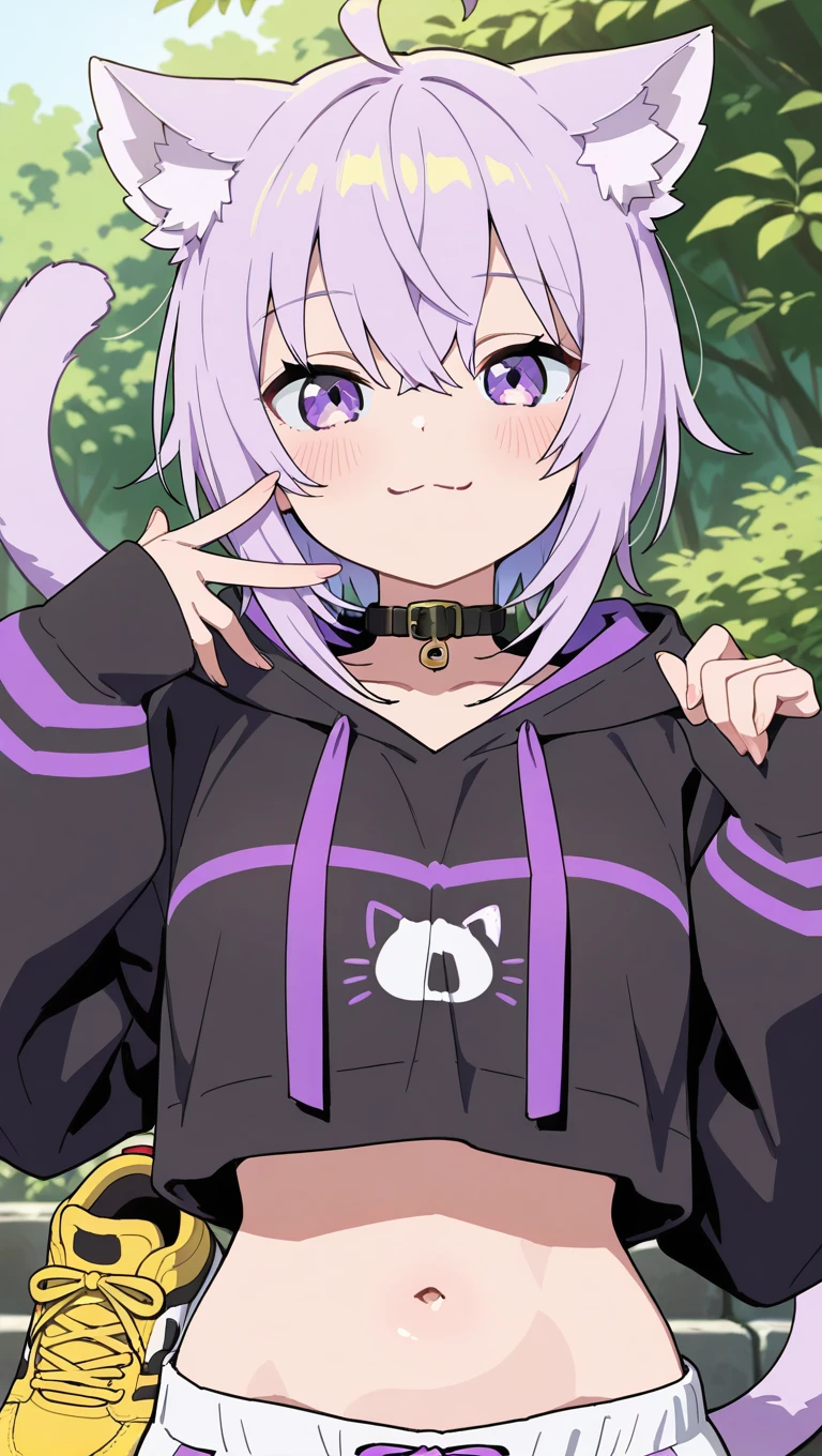 black collar,collarbone,black hoodie,cropped hoodie,hood down,drawstring,midriff,puffy long sleeves,sleeves past wrists,navel,white pants,cat tail,sneakers,yellow footwear