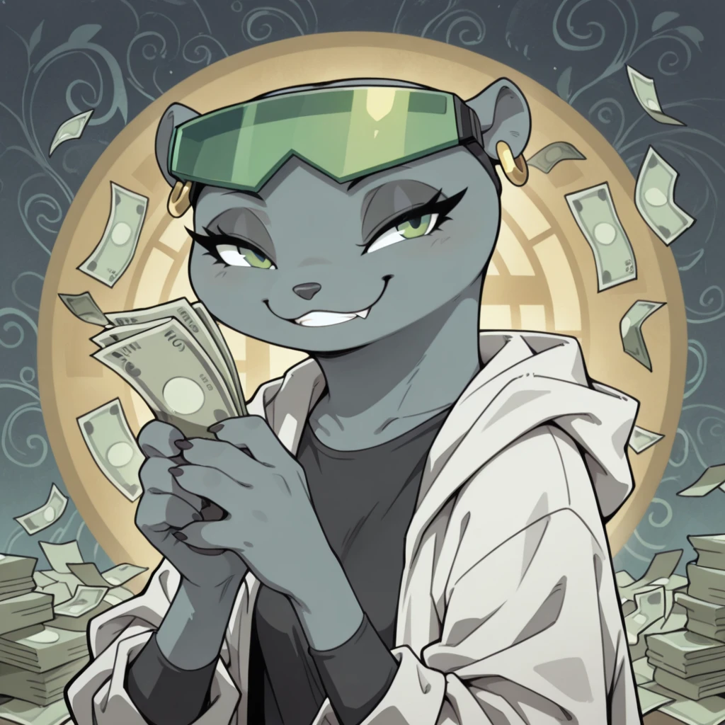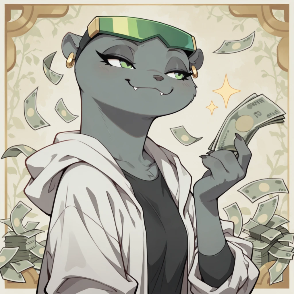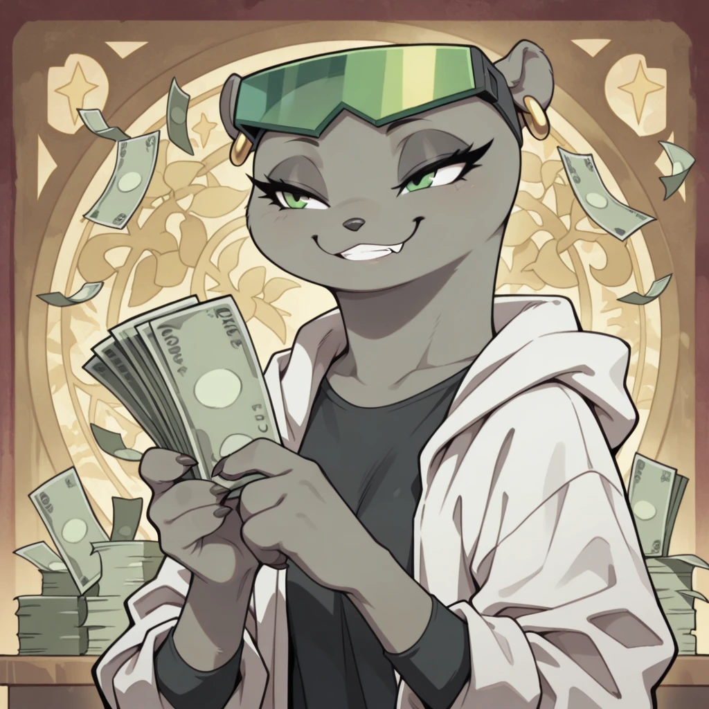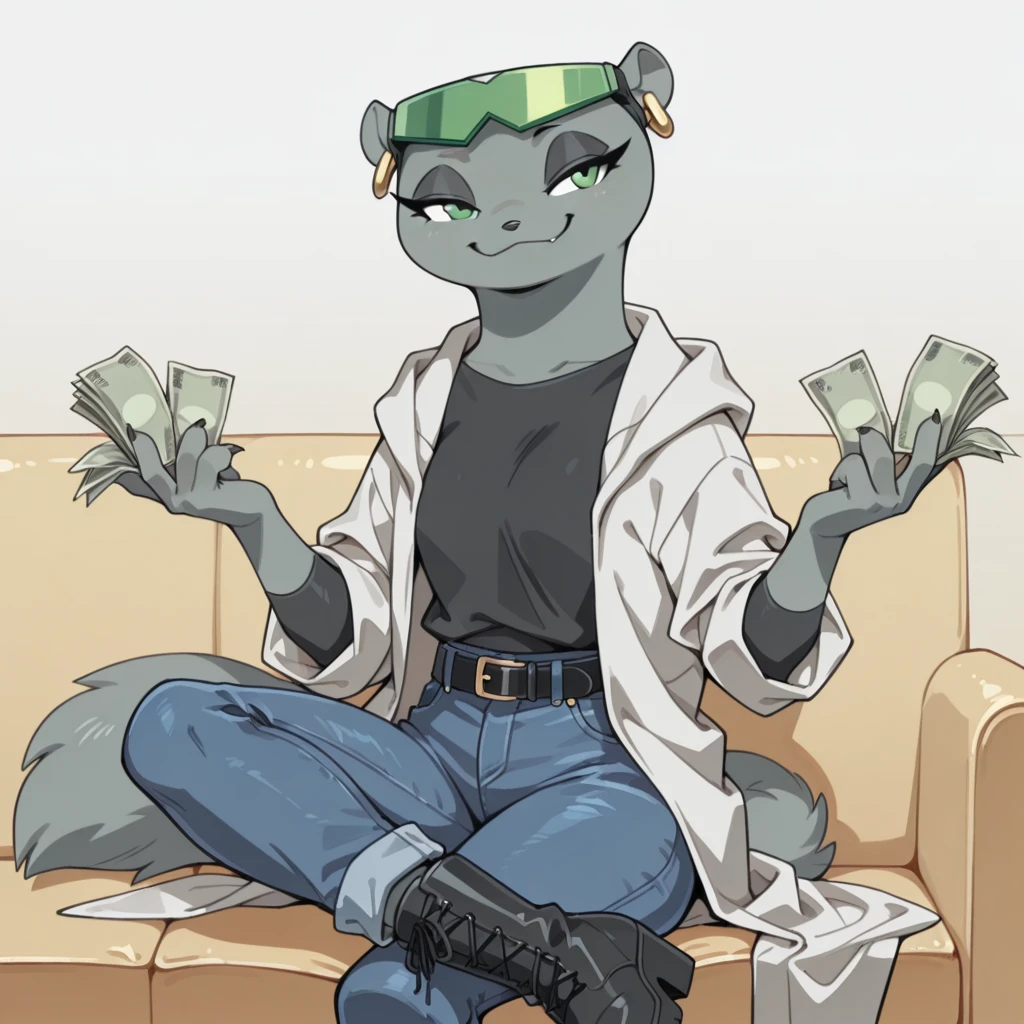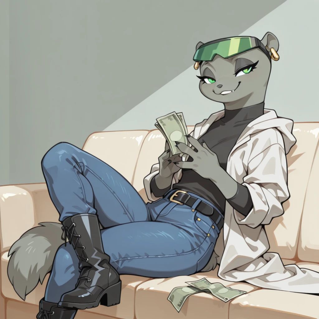 mink female, solo, gray fur, green eyes, black eyelashes, dark gray nose, green visor with black straps, mink ears with gold earrings, small gray mink tail, claws, black long sleeve shirt, large baggy white coat with rolled up sleeves, black belt, blue jeans, jeans, short black heeled boots,