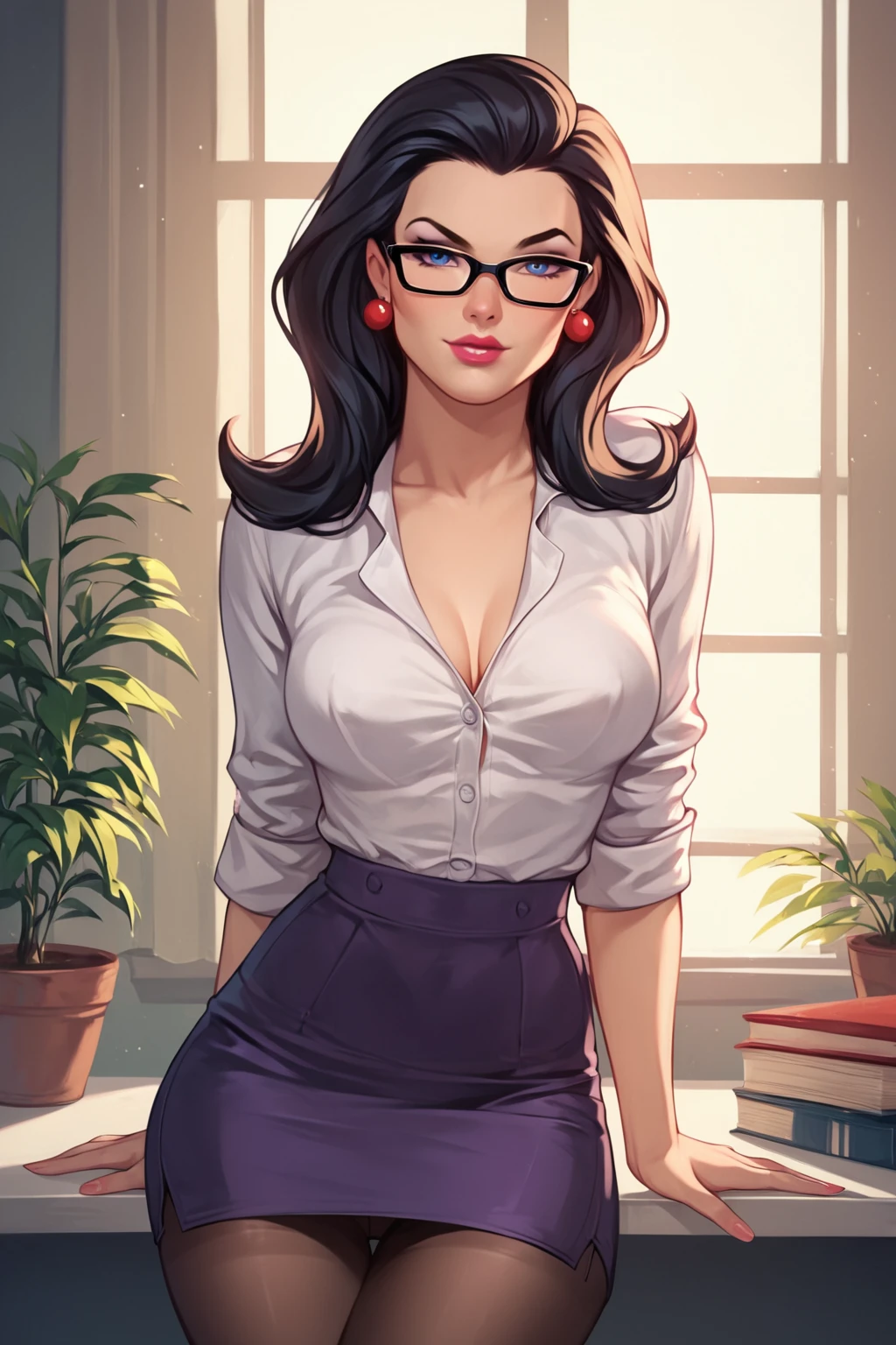 Casual Outfit: glasses, jewelry, earrings, purple suit jacket, white shirt, purple pencil skirt, pantyhose, formal, high heels
