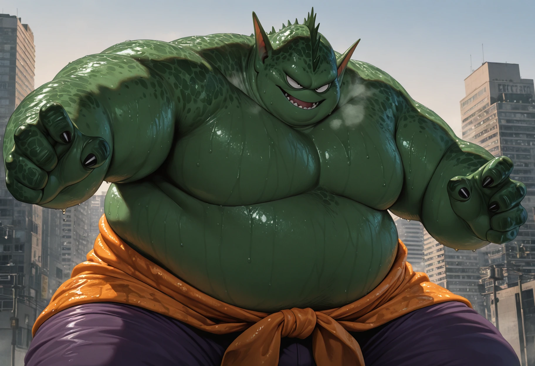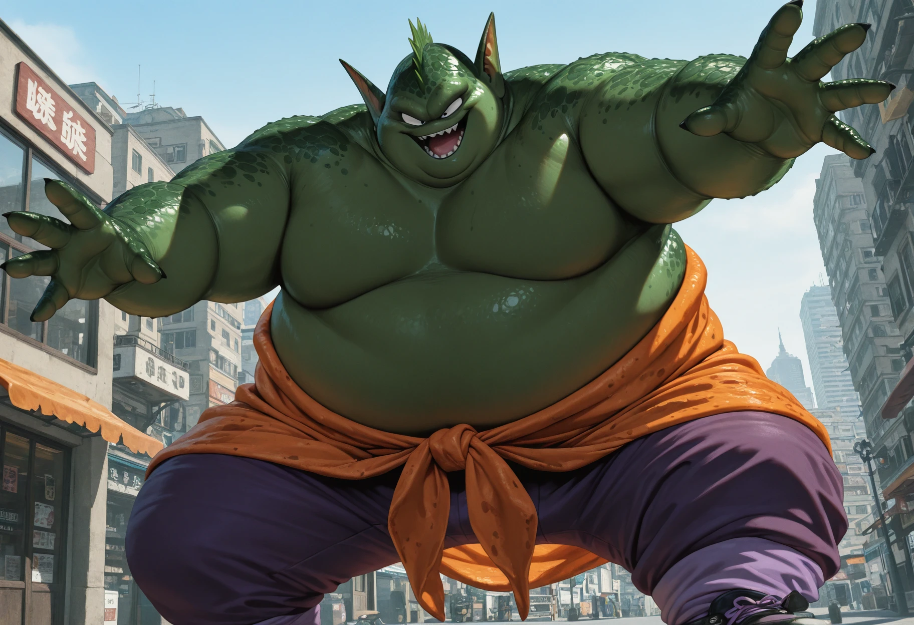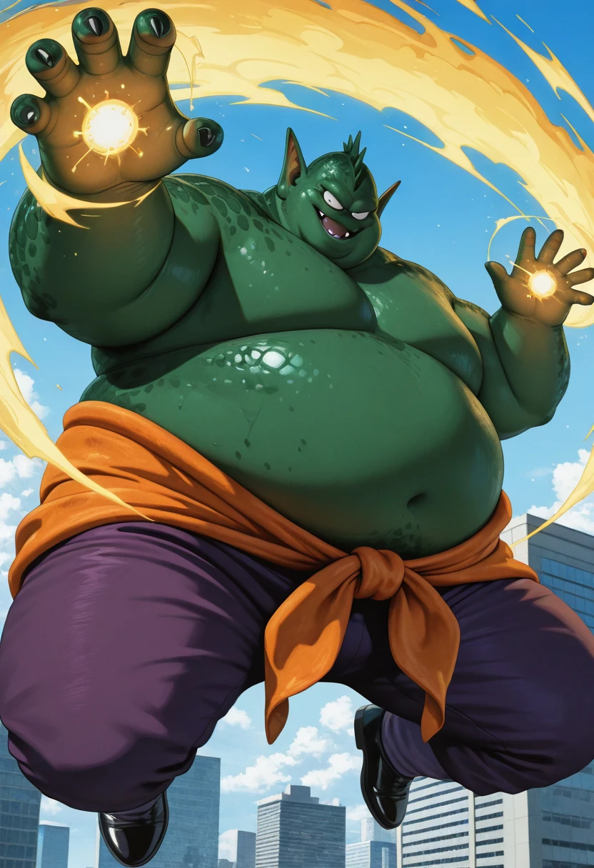 Tags: green skin, fat, male focus, pointy ears, head crest, monster boy,