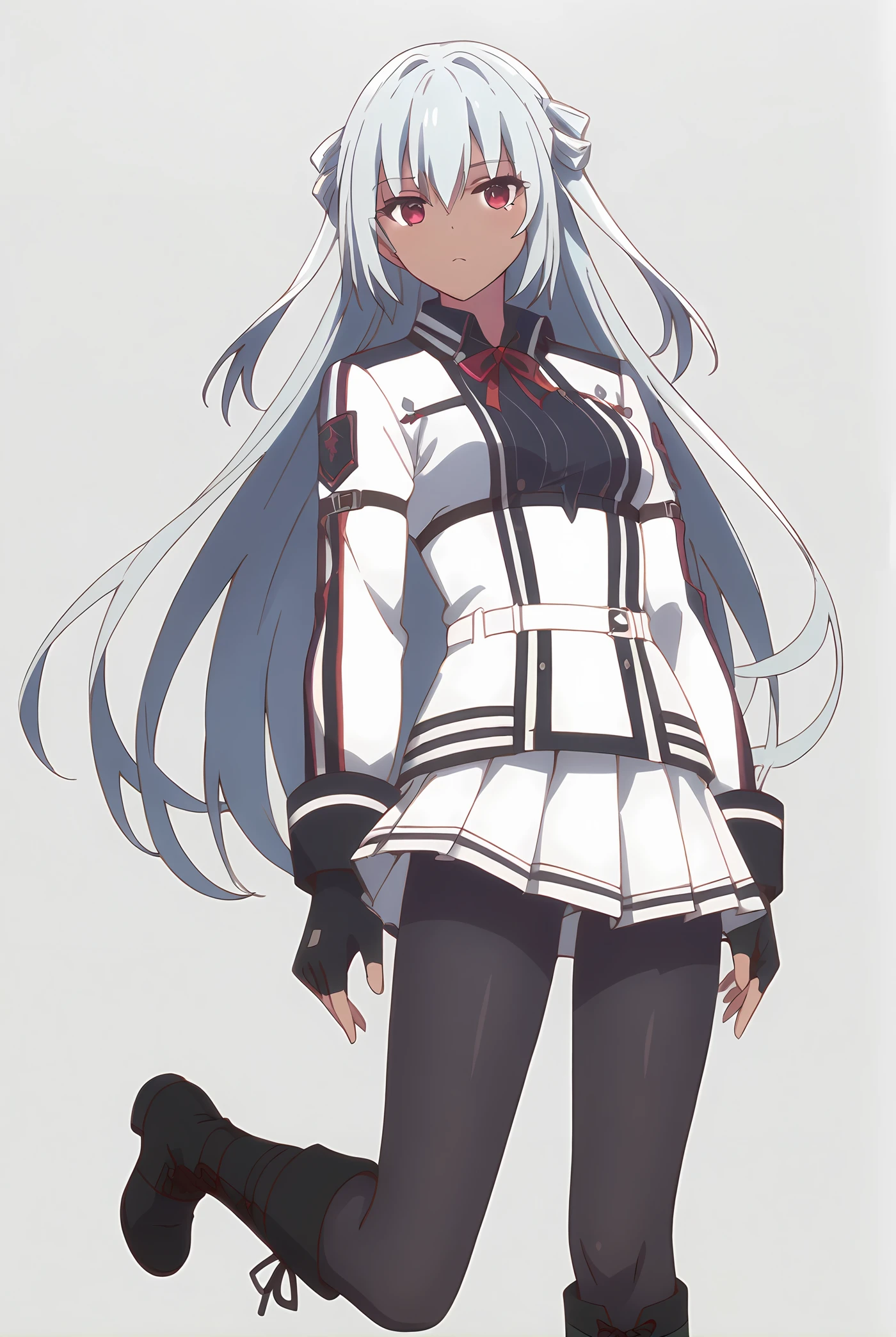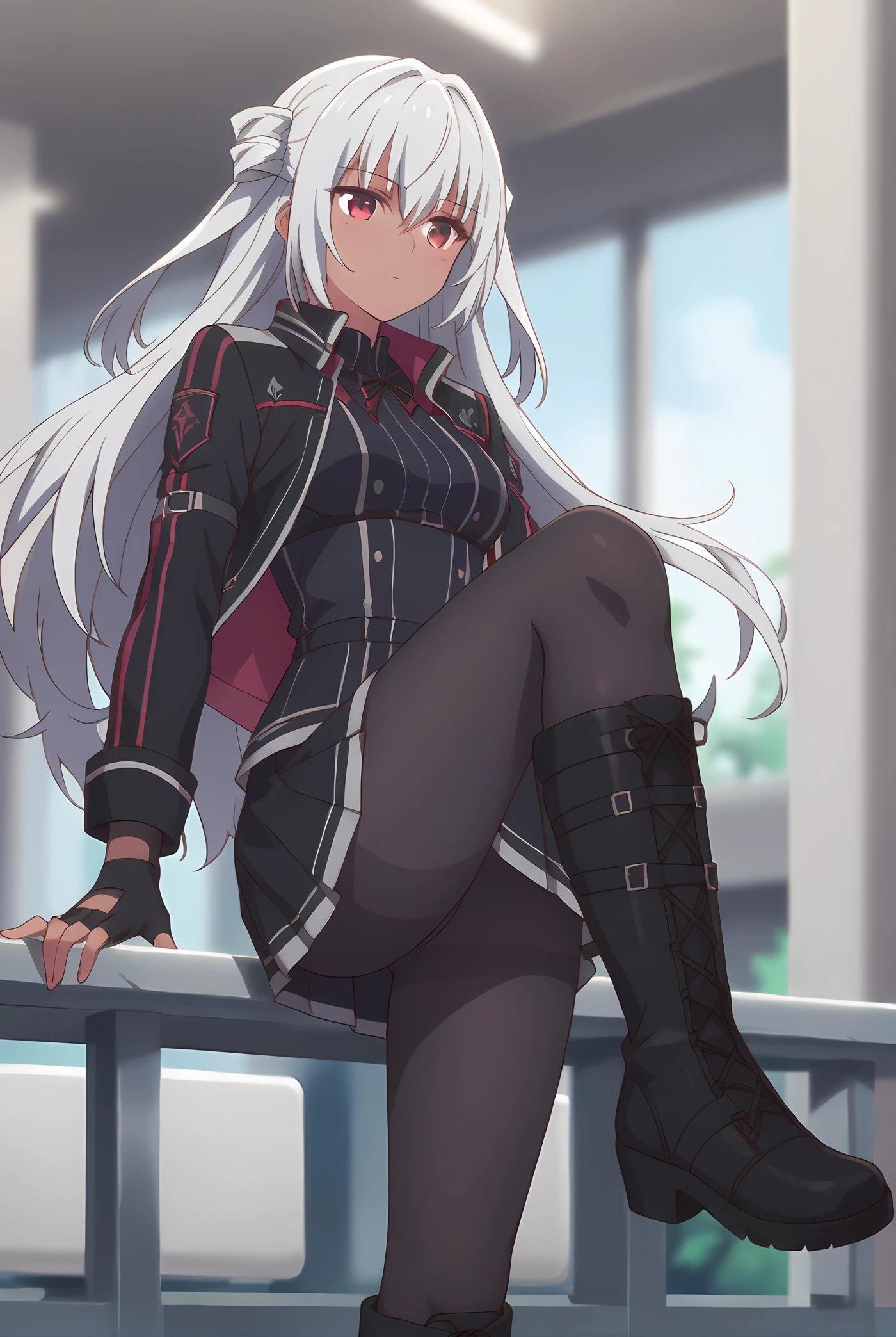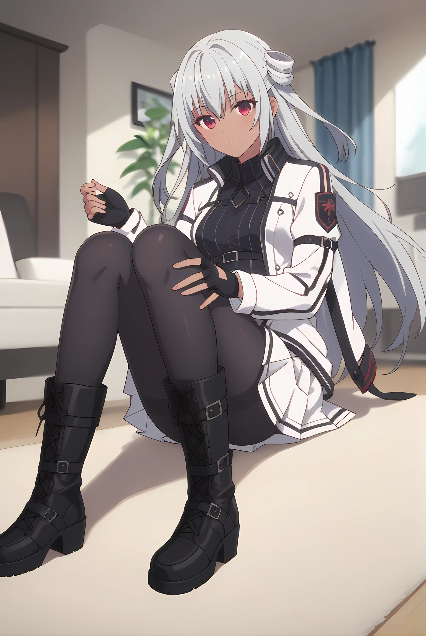 white jacket white skirt black pantyhose fingerless gloves black boots