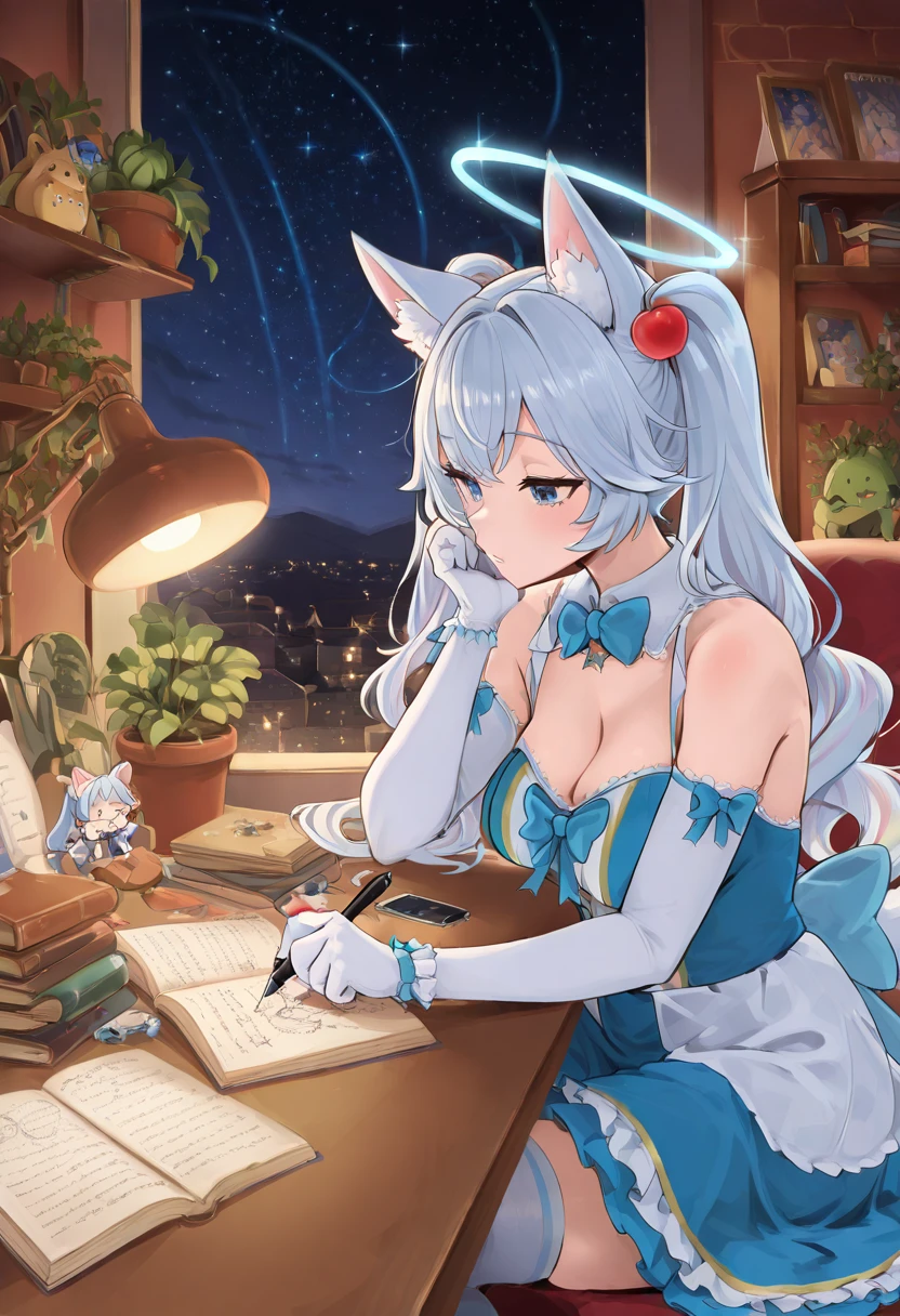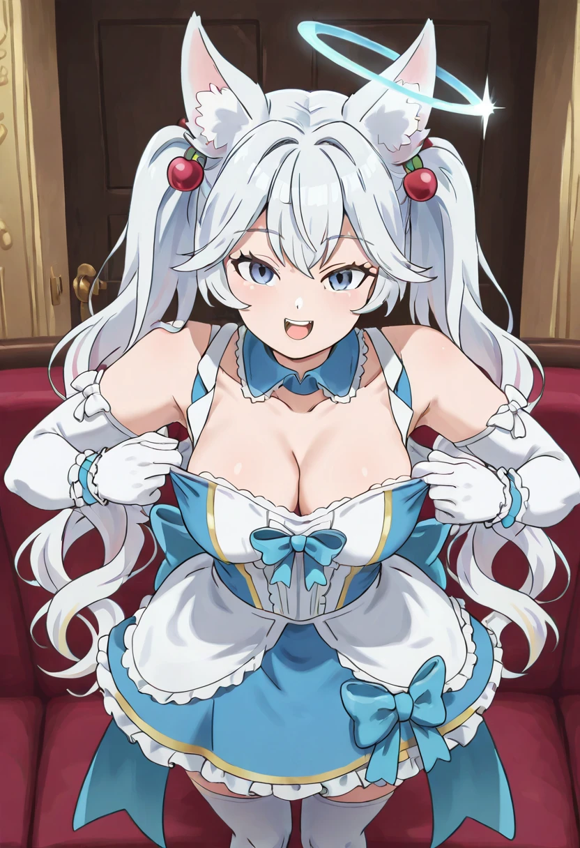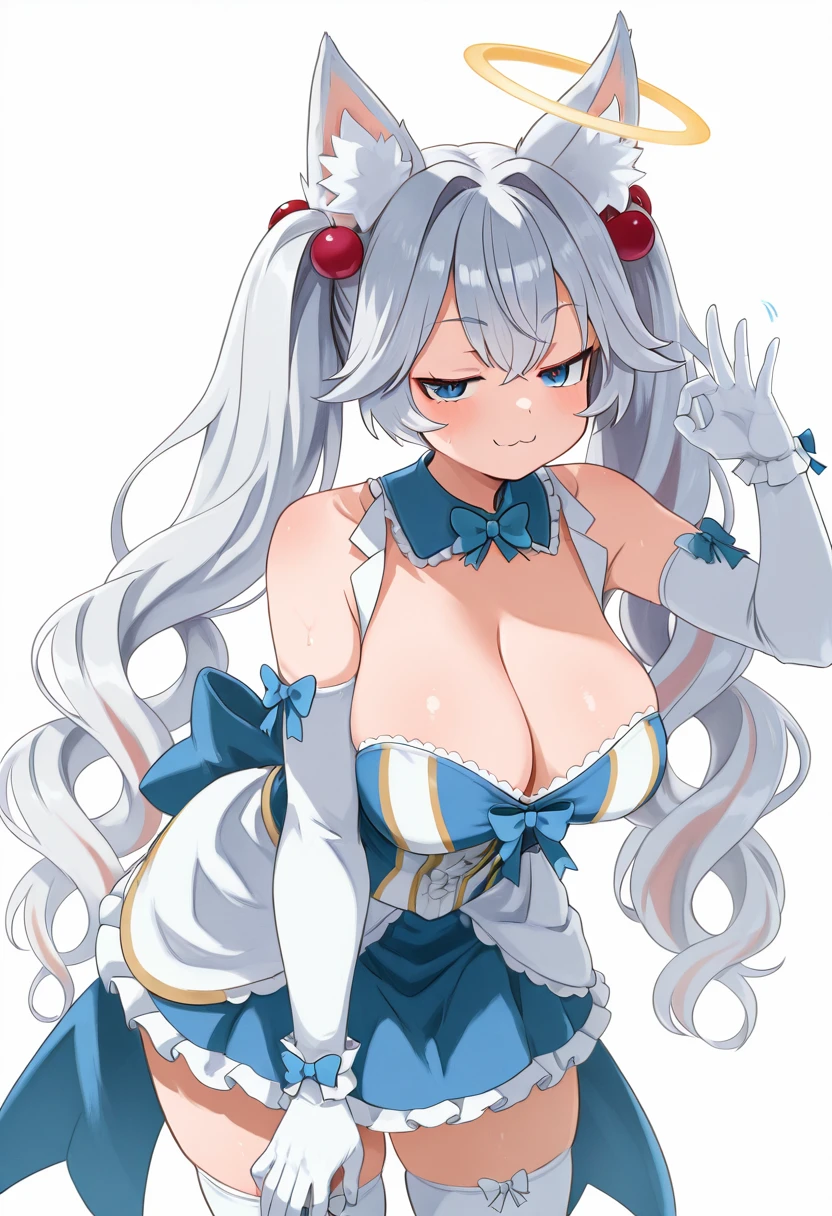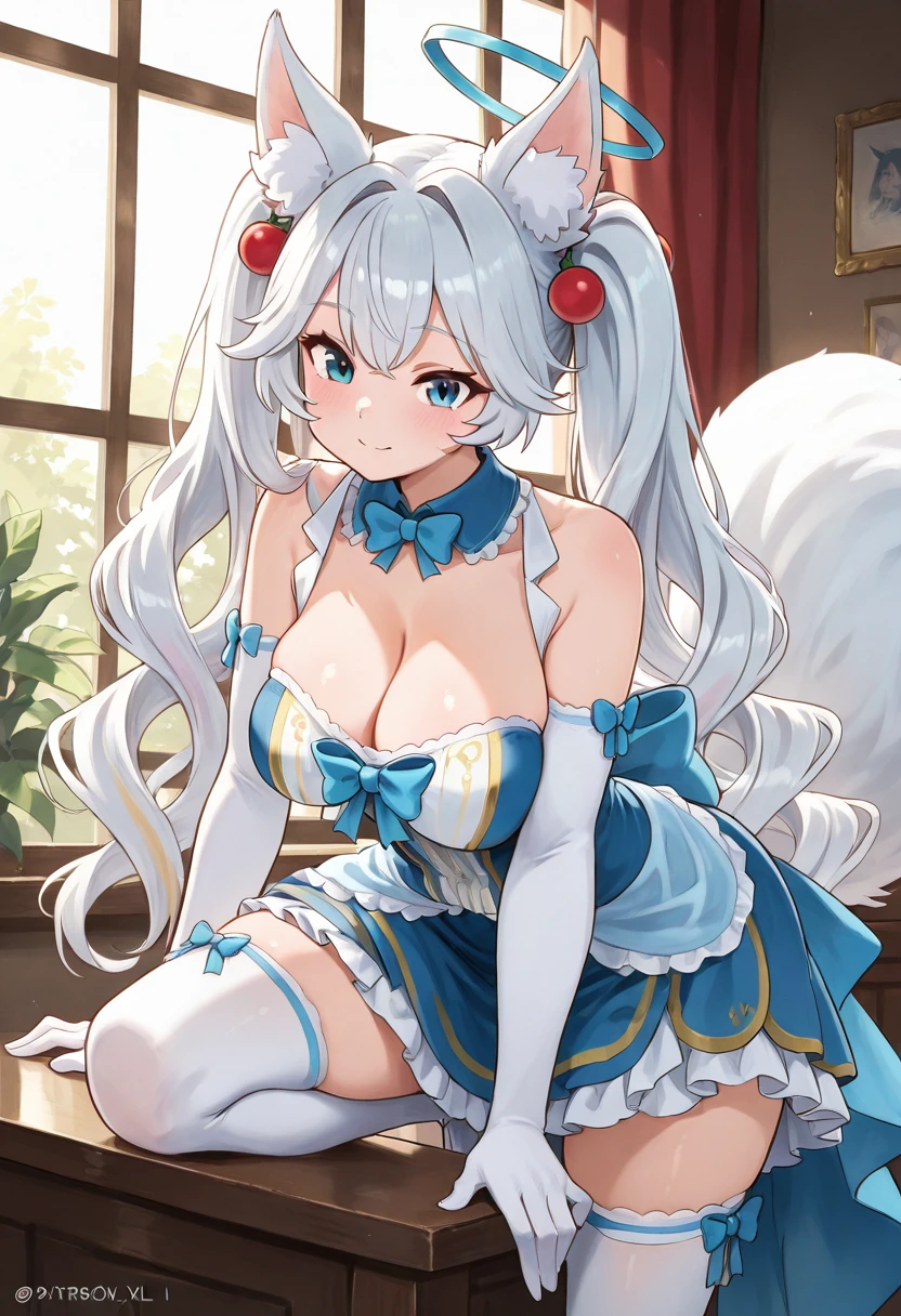 zzKirsche, blue eyes, long hair, white hair, fox ears, animal ear fluff, fox girl, halo, tail, detached collar, frilled collar, white elbow gloves, multicolored dress, blue dress, cleavage, blue bow, white thighhighs,
