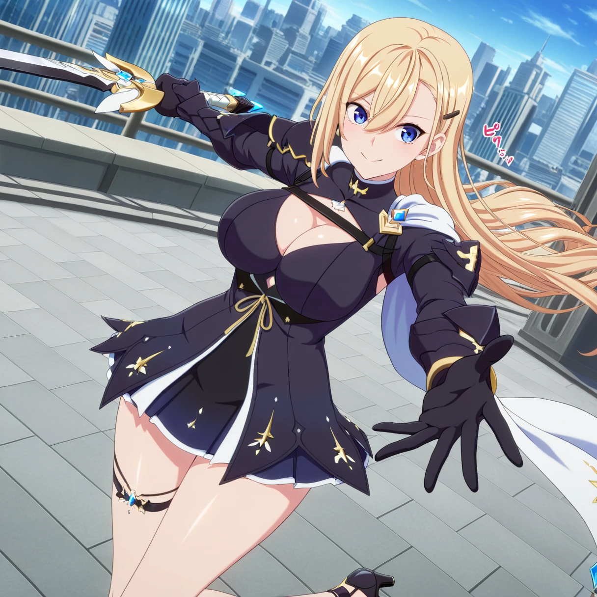 black dress, armored dress, white cape, high collar, microdress, long sleeves, cleavage cutout, black gloves, thigh strap, black footwear, high heels
