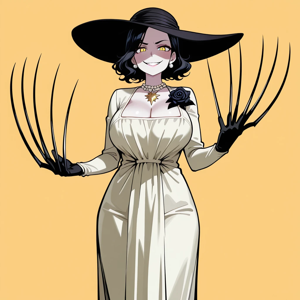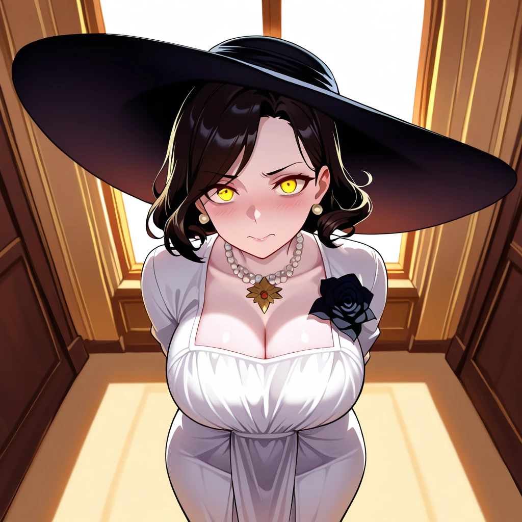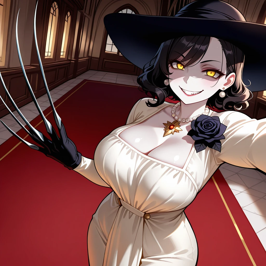 Dimitrescu, 1girl, solo, mature female, colored skin, pale skin, white skin, tall female, yellow eyes, large breasts, black hair, wavy hair, black gloves, sun hat, earrings, pearl necklace, scoop neck, white dress, long dress, bursting breasts, black rose
