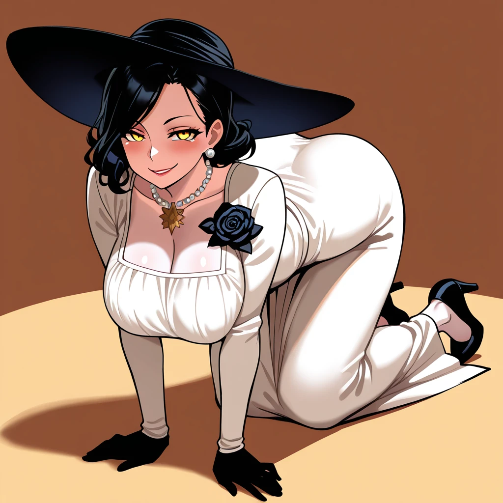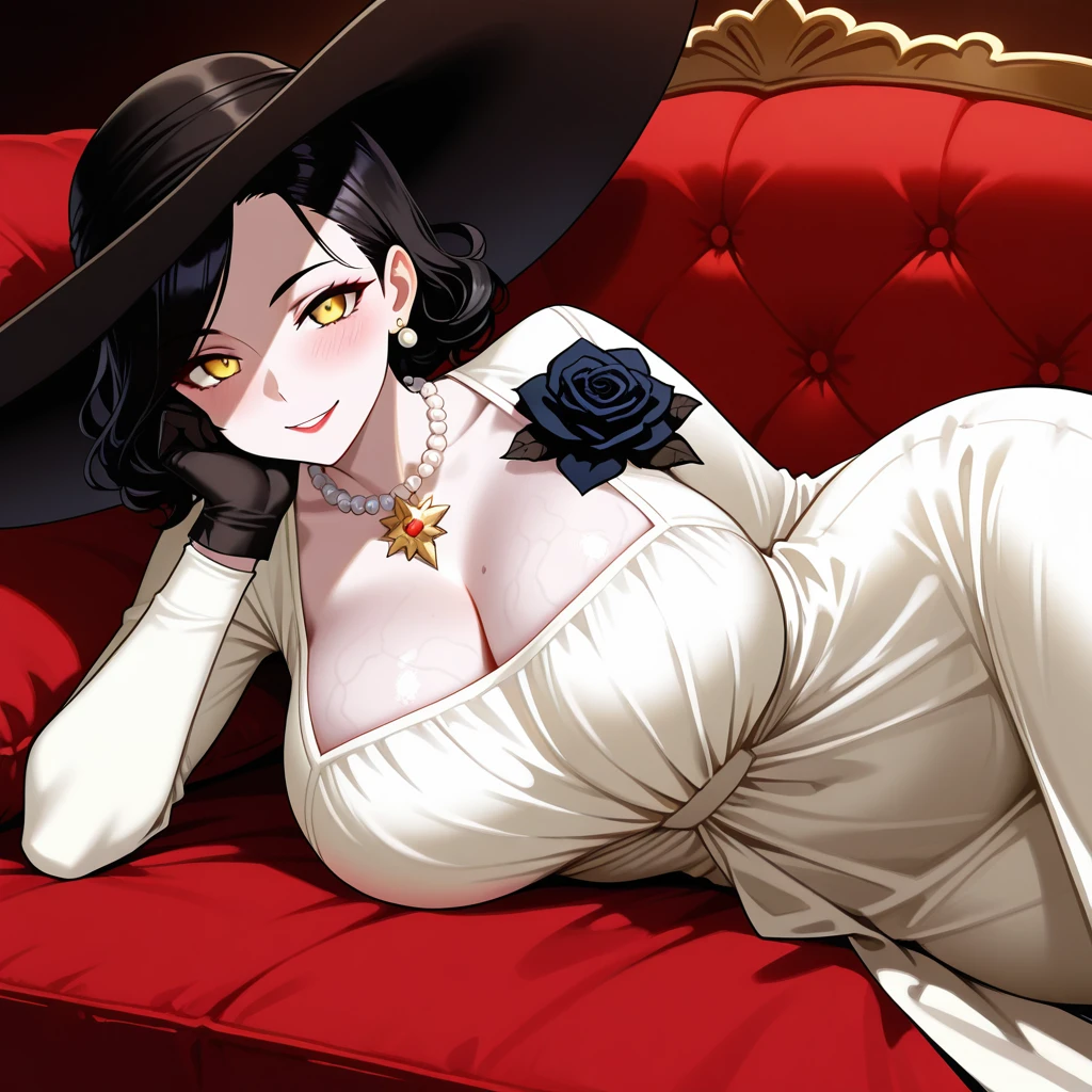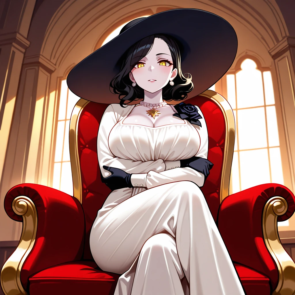 Dimitrescu, 1girl, solo, mature female, colored skin, pale skin, white skin, tall female, yellow eyes, large breasts, black hair, wavy hair, black gloves, sun hat, earrings, pearl necklace, scoop neck, white dress, long dress, bursting breasts, black rose