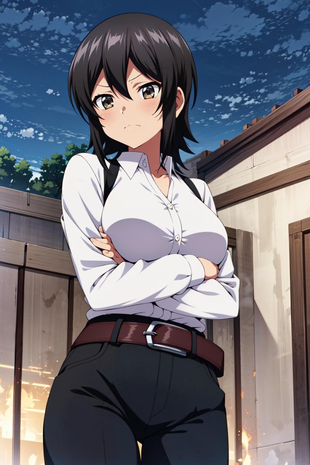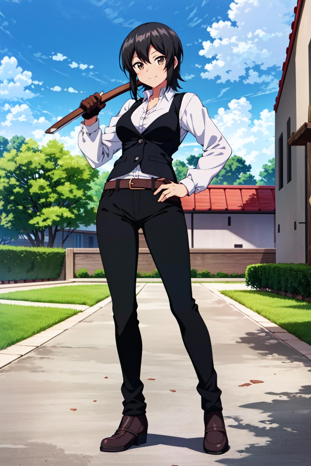Elna Stongs, 1girl, solo, black hair, pants, belt, shirt, day, short hair, white shirt, gloves, black pants, dress shirt, breasts, black eyes, black gloves