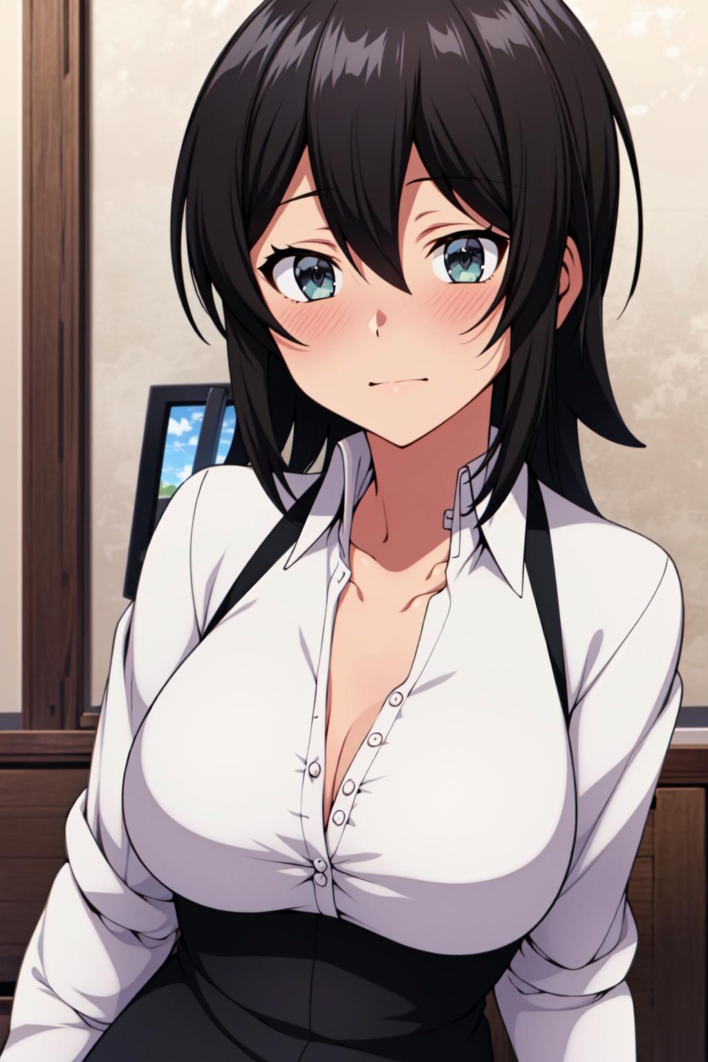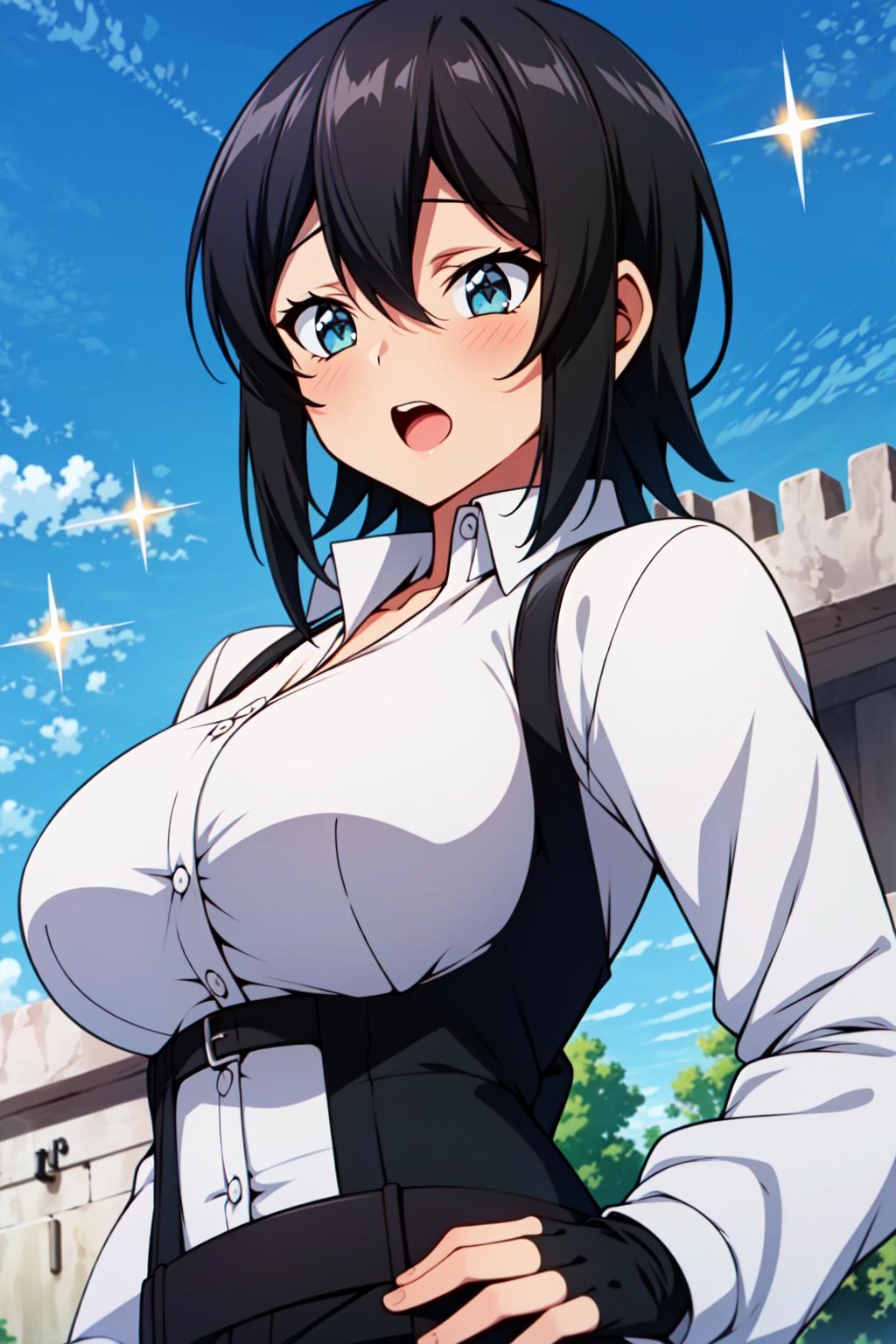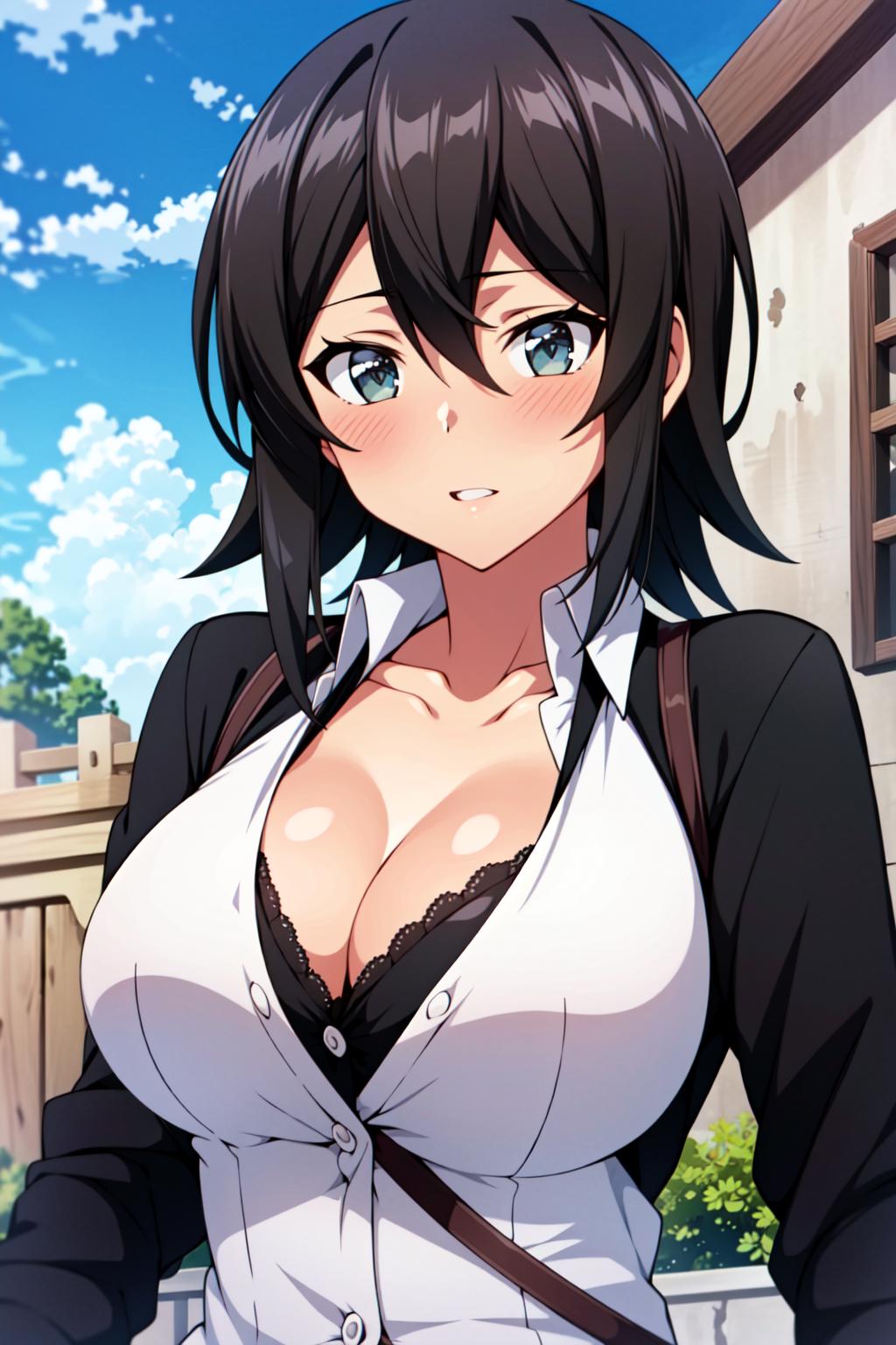 Elna Stongs, grey eyes, breasts, cleavage, fingerless gloves, gloves, shirt, black hair, medium breasts, white shirt, day, black gloves, collarbone, side bangs, bangs, hair between eyes,