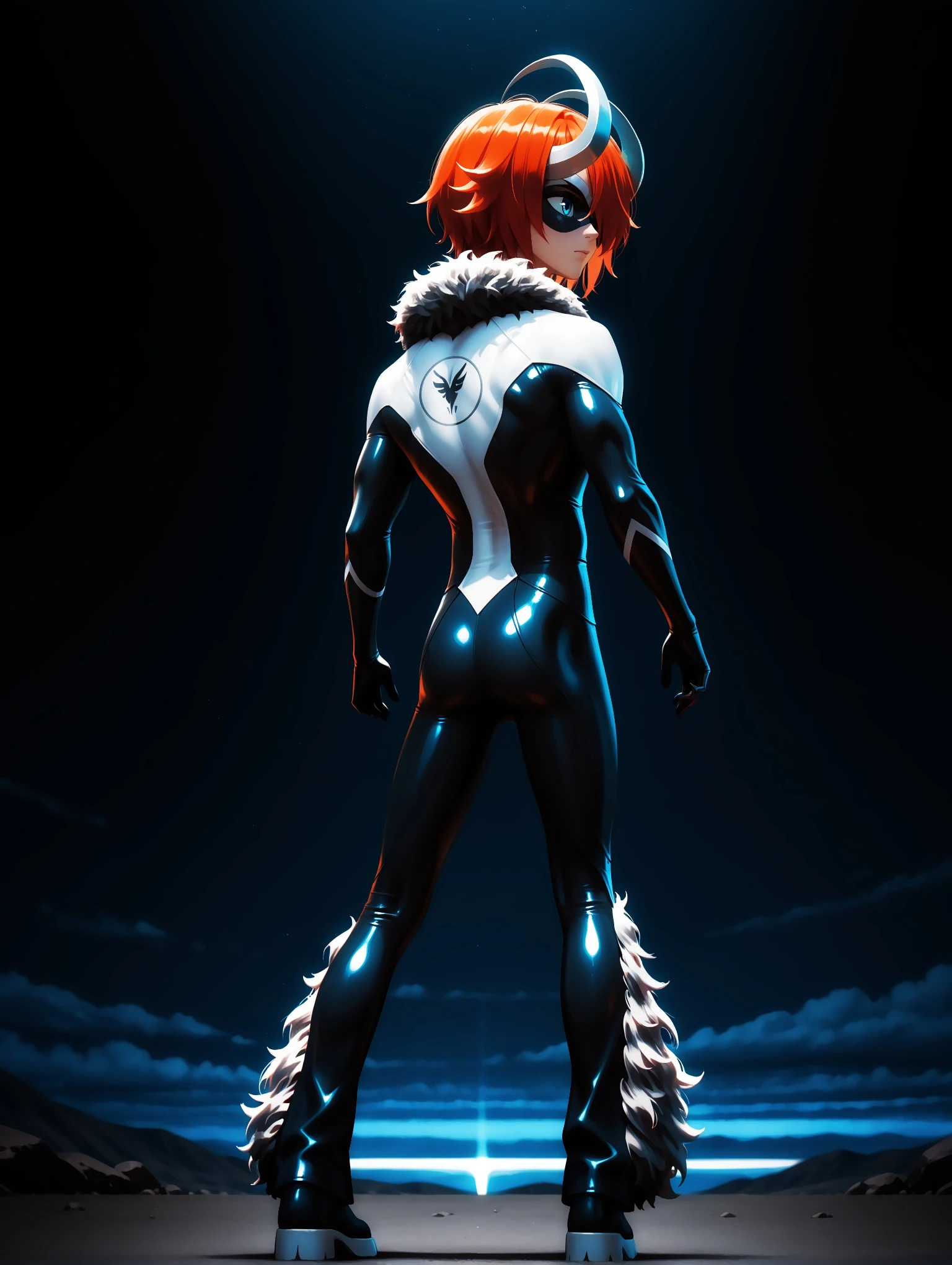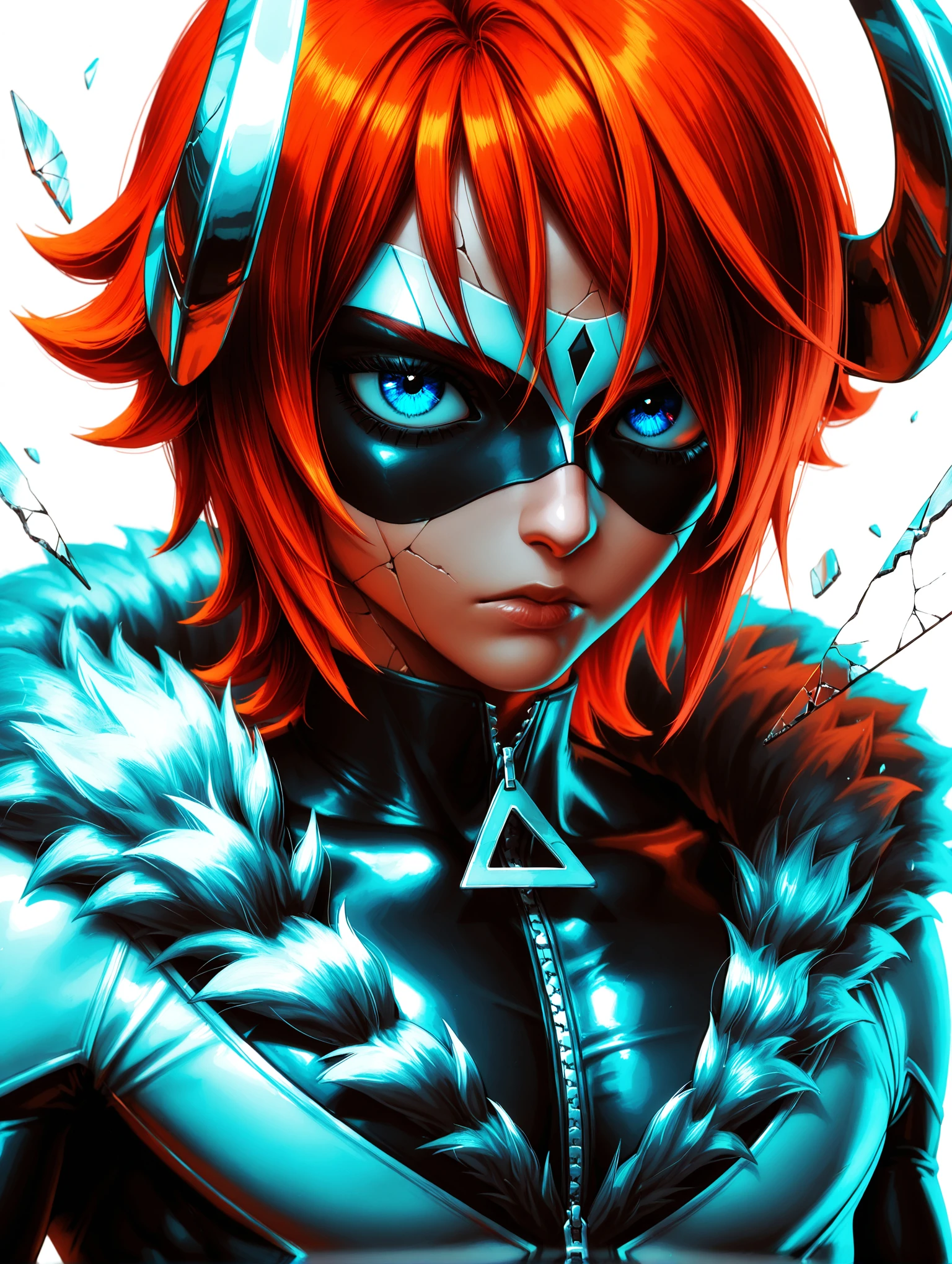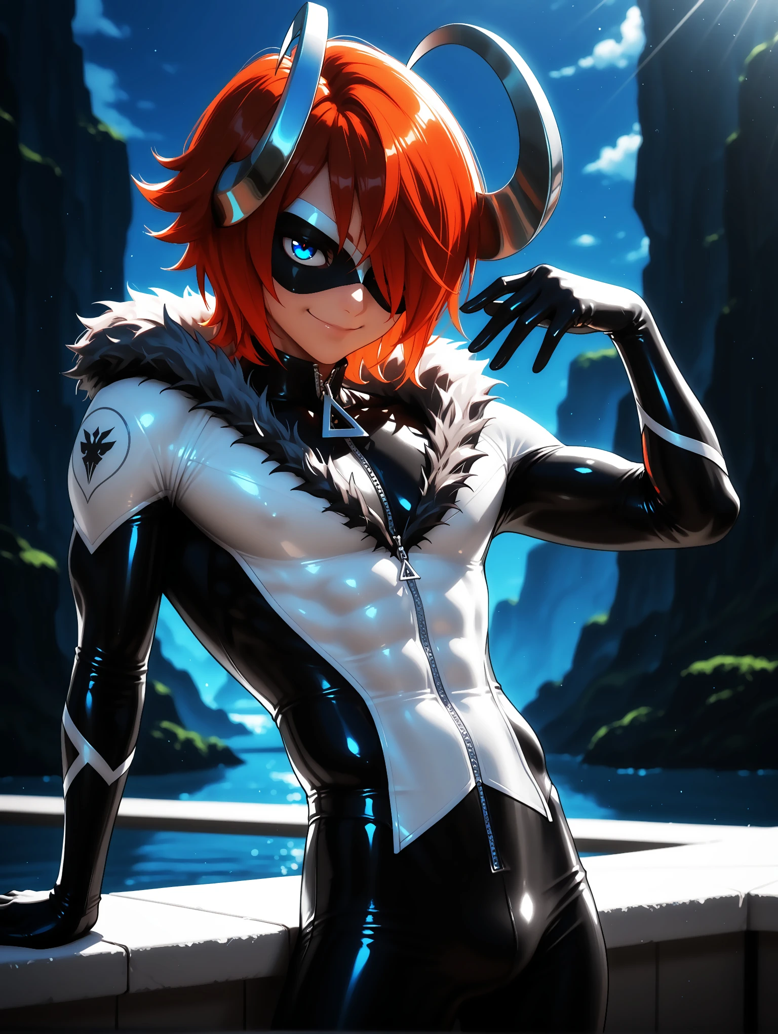 imtdcaprisix, 1boy, male, manly, toned male, horns, short hair, orange hair, red hair, blue eyes, hair over one eye, bodysuit, mask, gloves, fur trim, domino mask, zipper