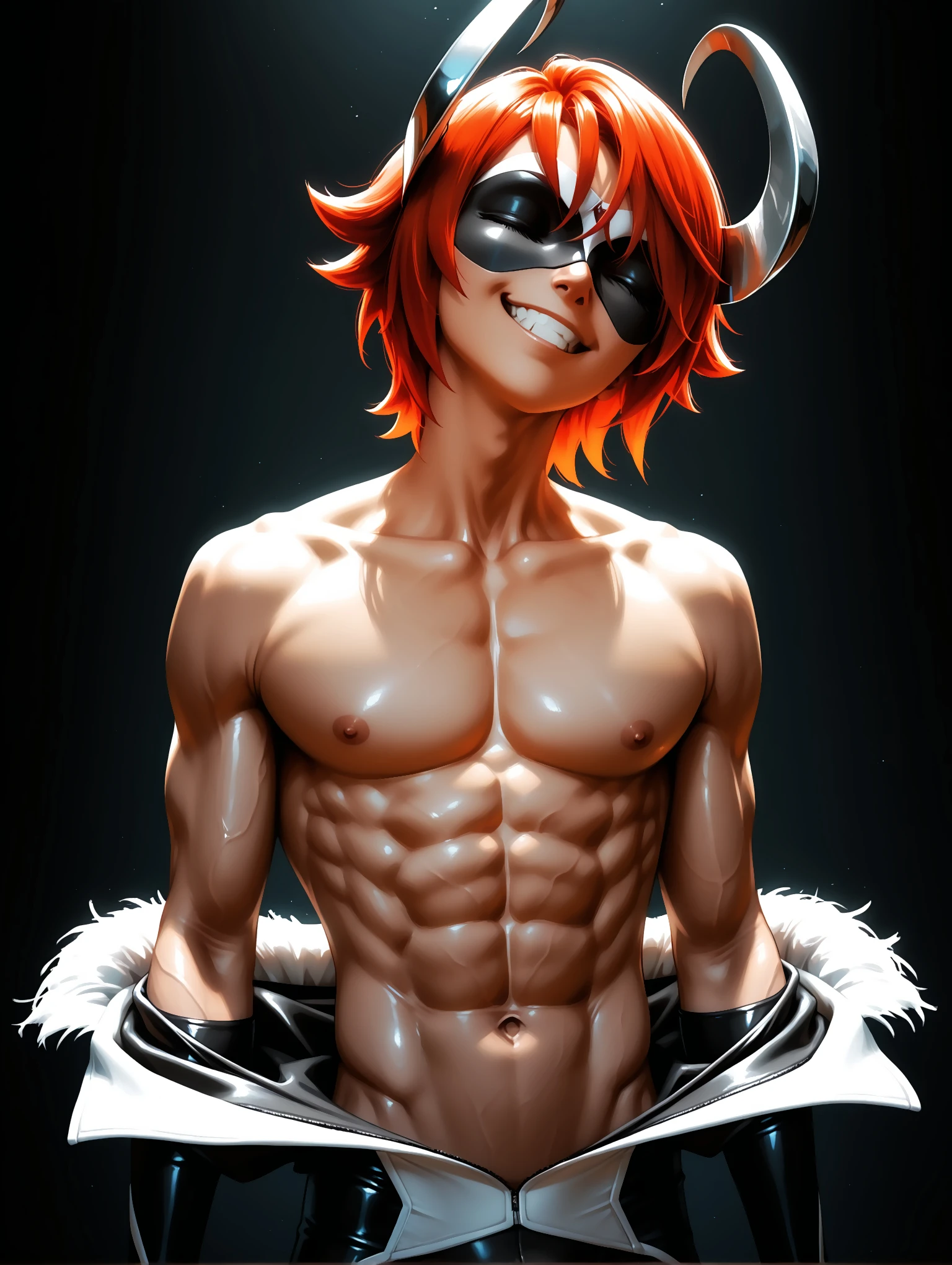 Trigger : imtdcaprikid, 1boy, red hair, horns, mask, domino mask, short hair, hair over one eye, gloves, blue eyes, bodysuit, fur trim, white gloves