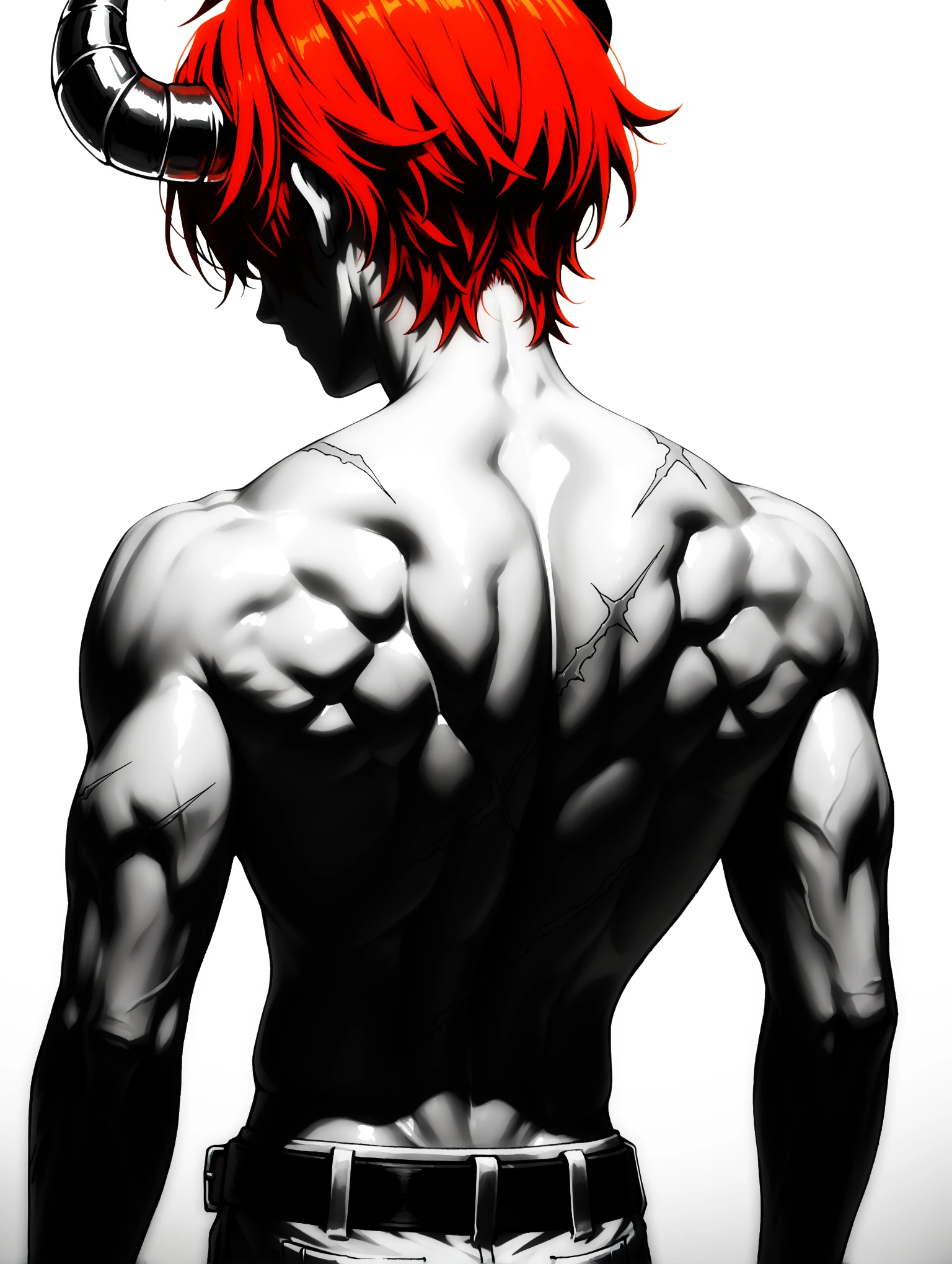 Caprikid S6 Prompts : 1boy, male, manly, toned male, horns, short hair, orange hair, red hair, blue eyes, hair over one eye