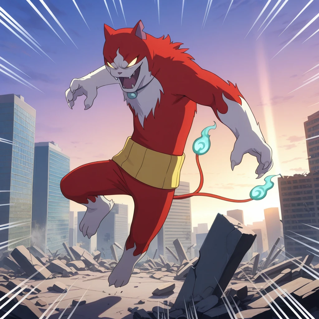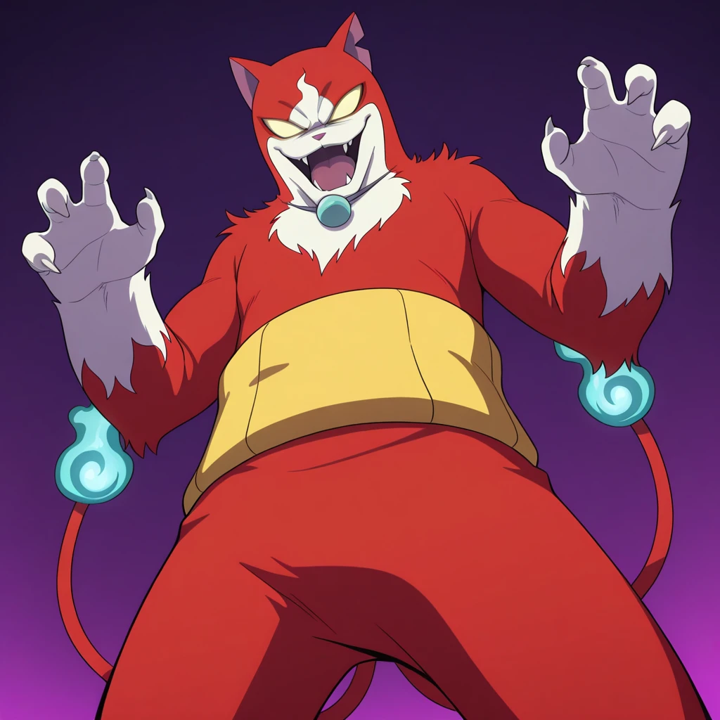 Tags (Shadowside): shadowside, traditional youkai, tall height, furry male, cat boy, cat, red fur, notched ear, cat ears, animal nose, white fur, two-tone fur, yellow sclera, no pupils, fangs, flame-tipped tail, two tails, yellow haramaki, collar, neckbell, claws, sharp teeth