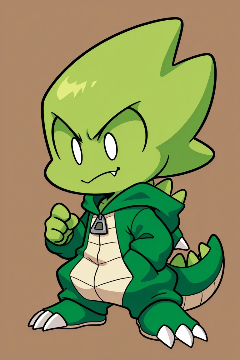 MinusPicoFNF, 1boy, green skin, white eyes, no sclera, spiky green hair, green reptilian hoodie with claws and a tail, short, chibi, cosplay