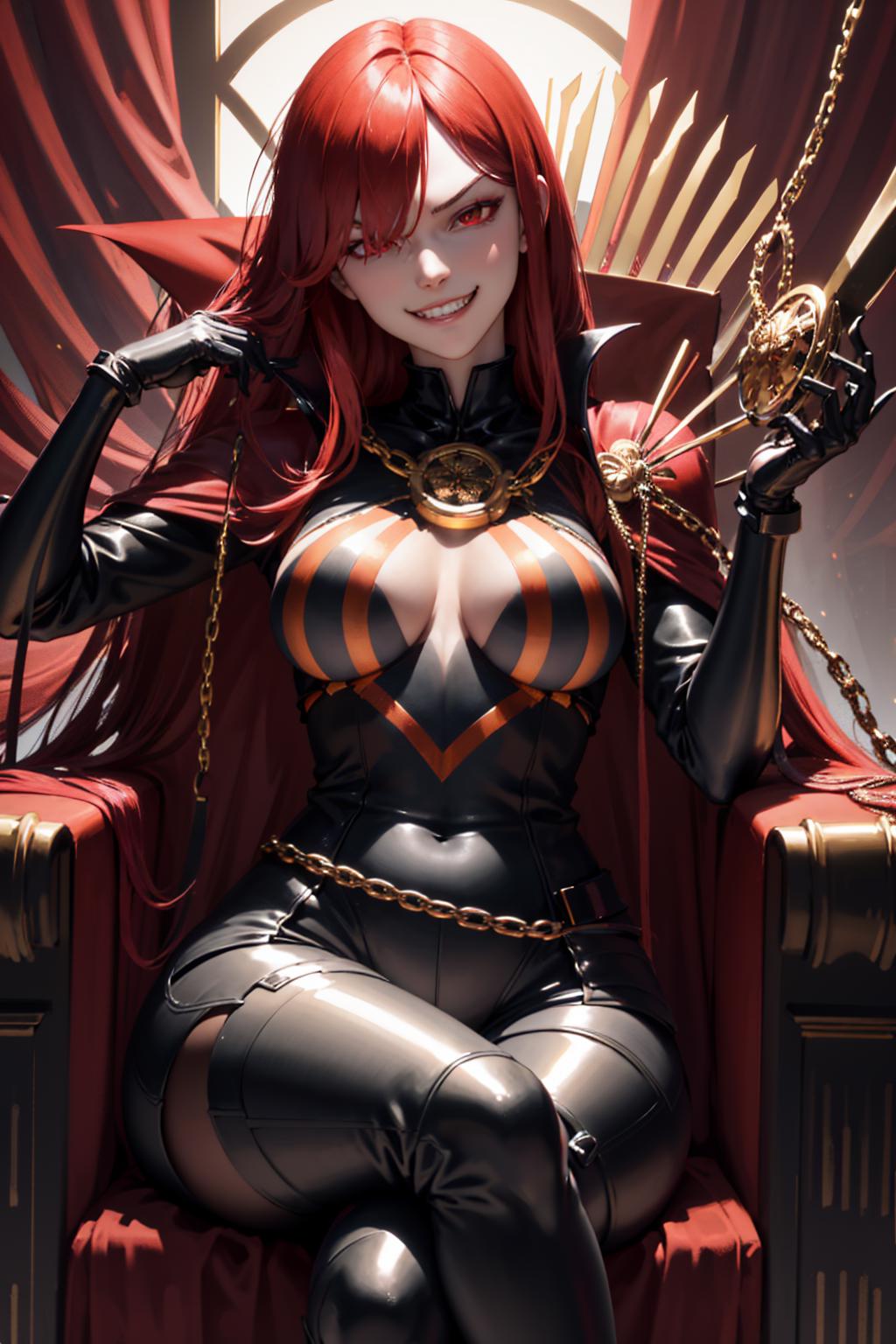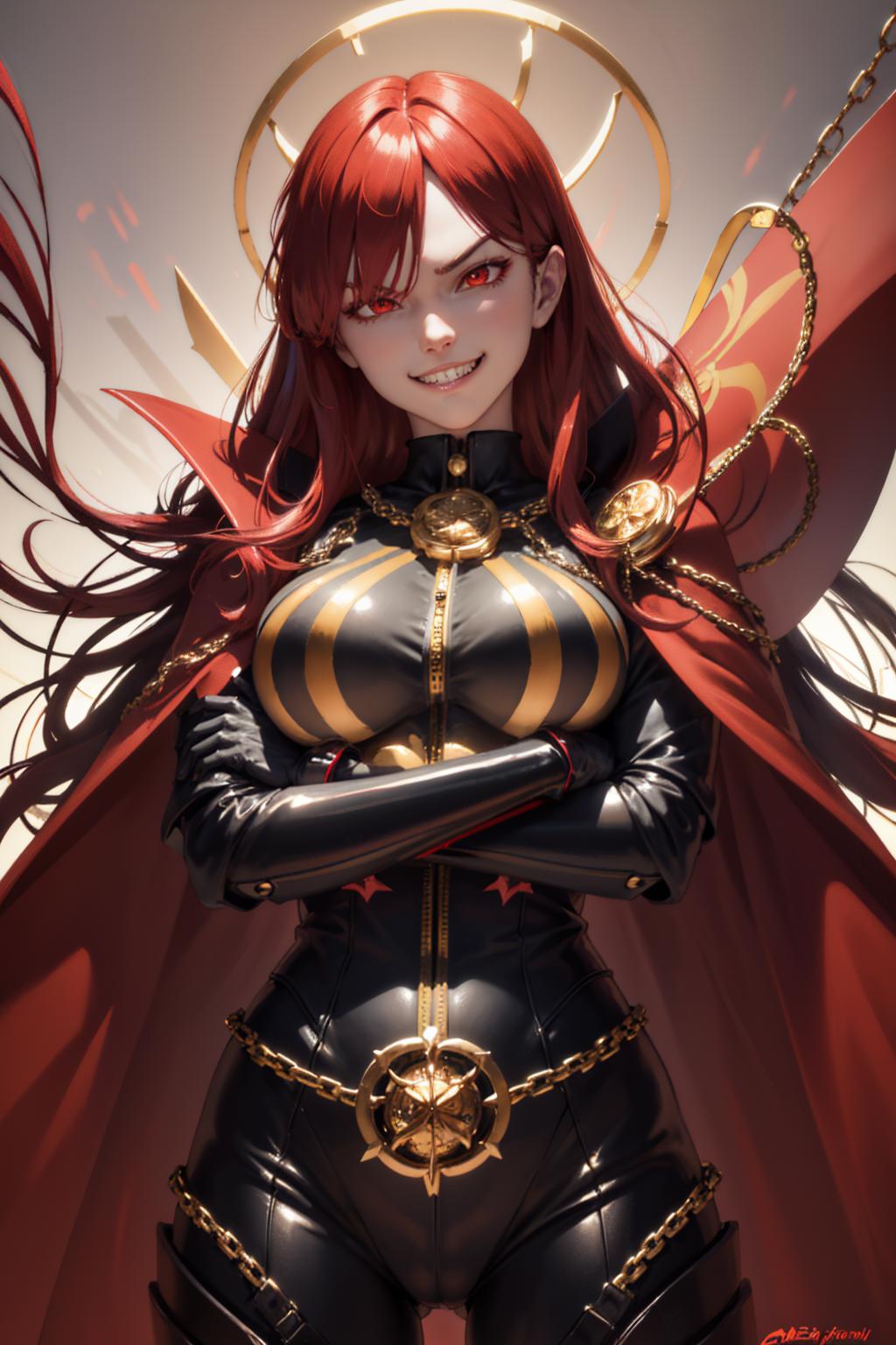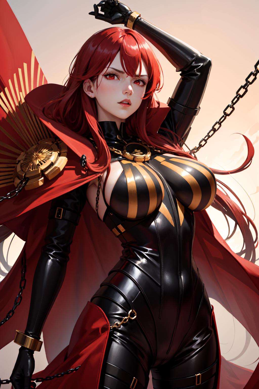oda_biig,large breasts,red eyes,black bodysuit,red hair,chain,collared cape,