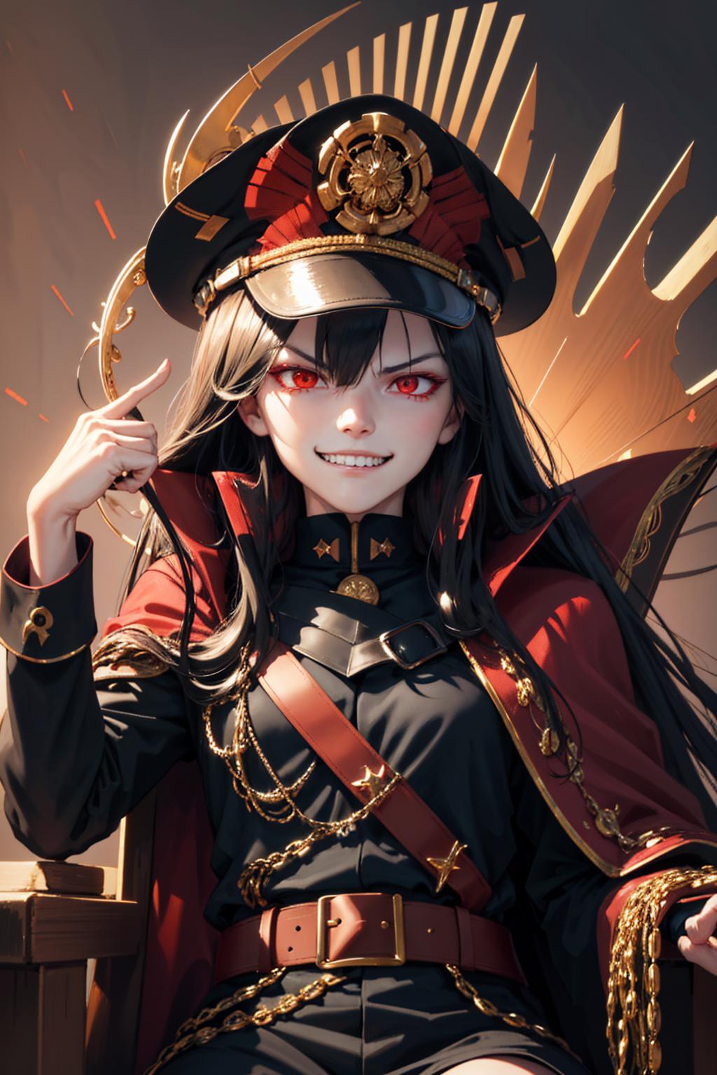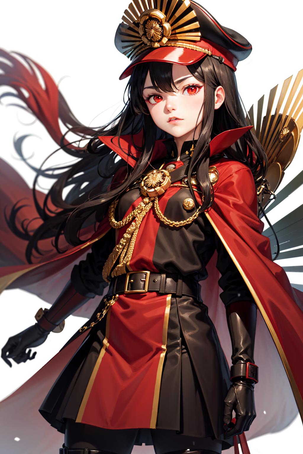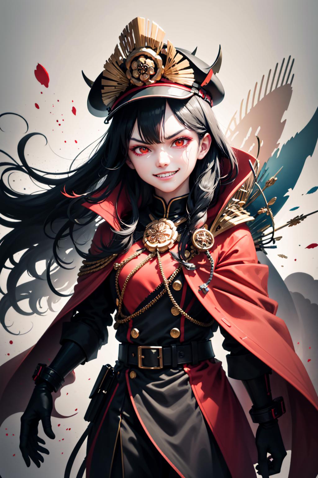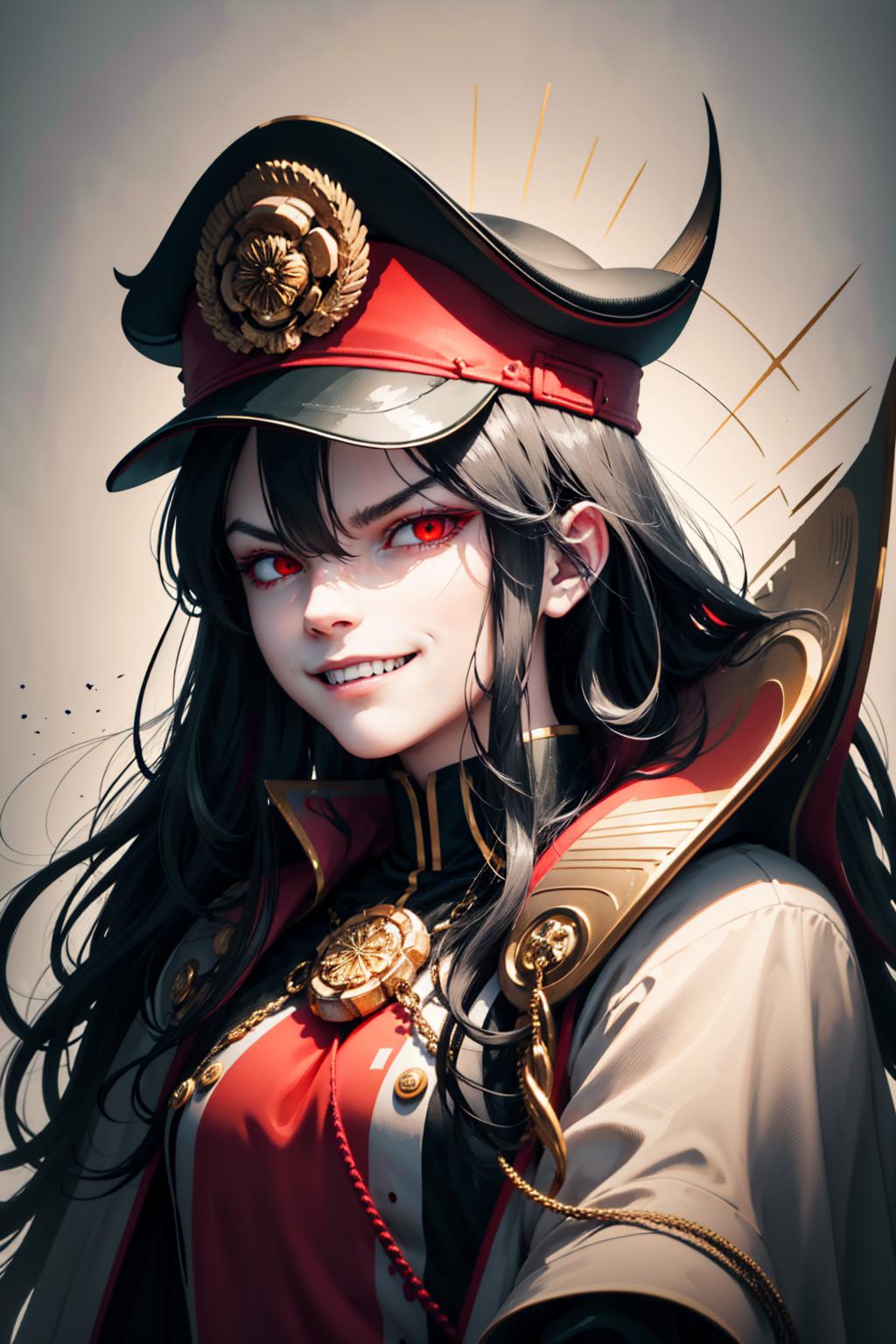 hat,cape, red eyes, military uniform,black hairDemon King Nobunaga: