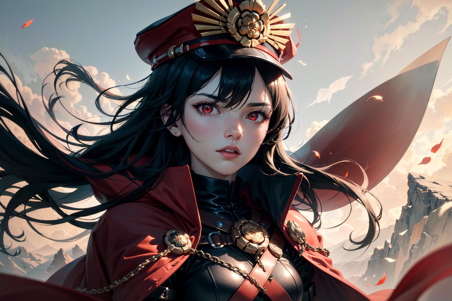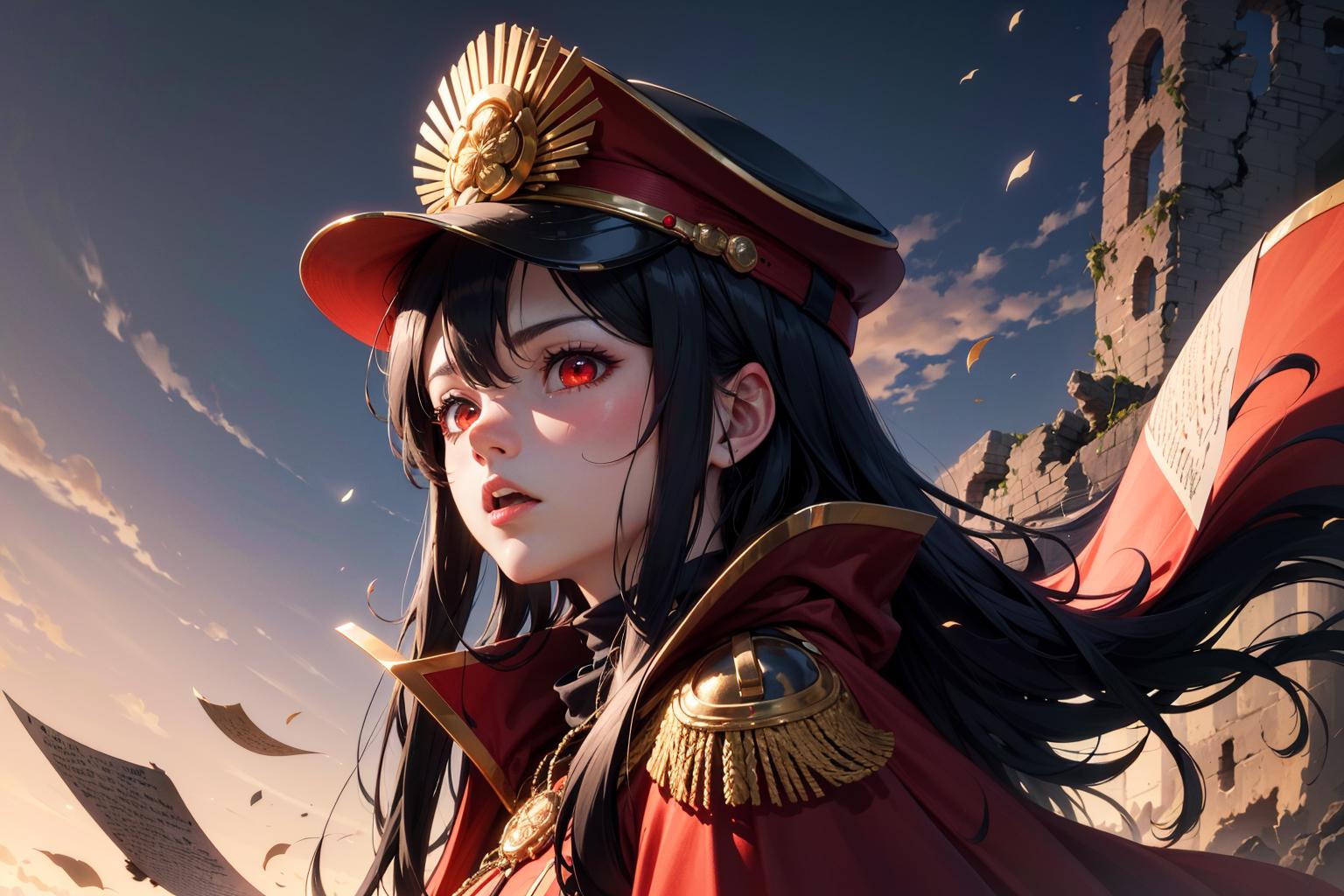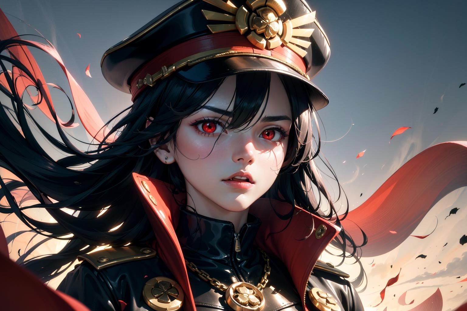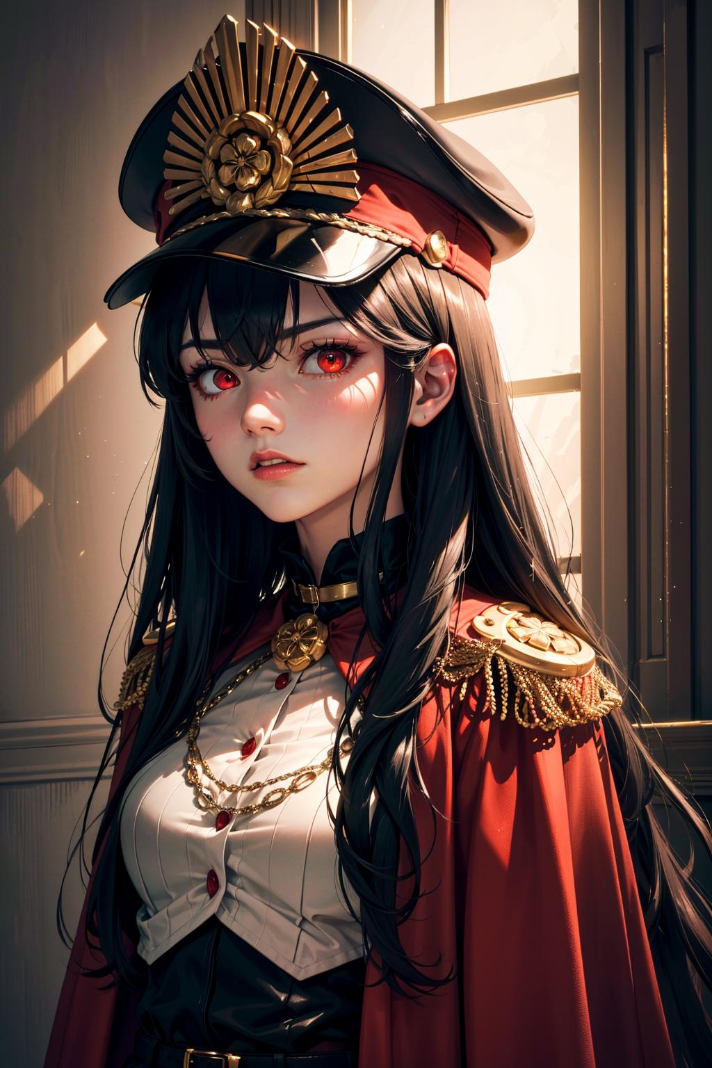 hat,cape, red eyes, military uniform,black hairDemon King Nobunaga: