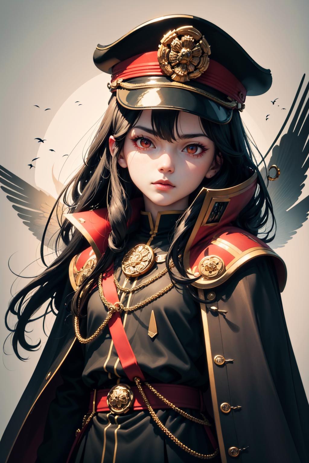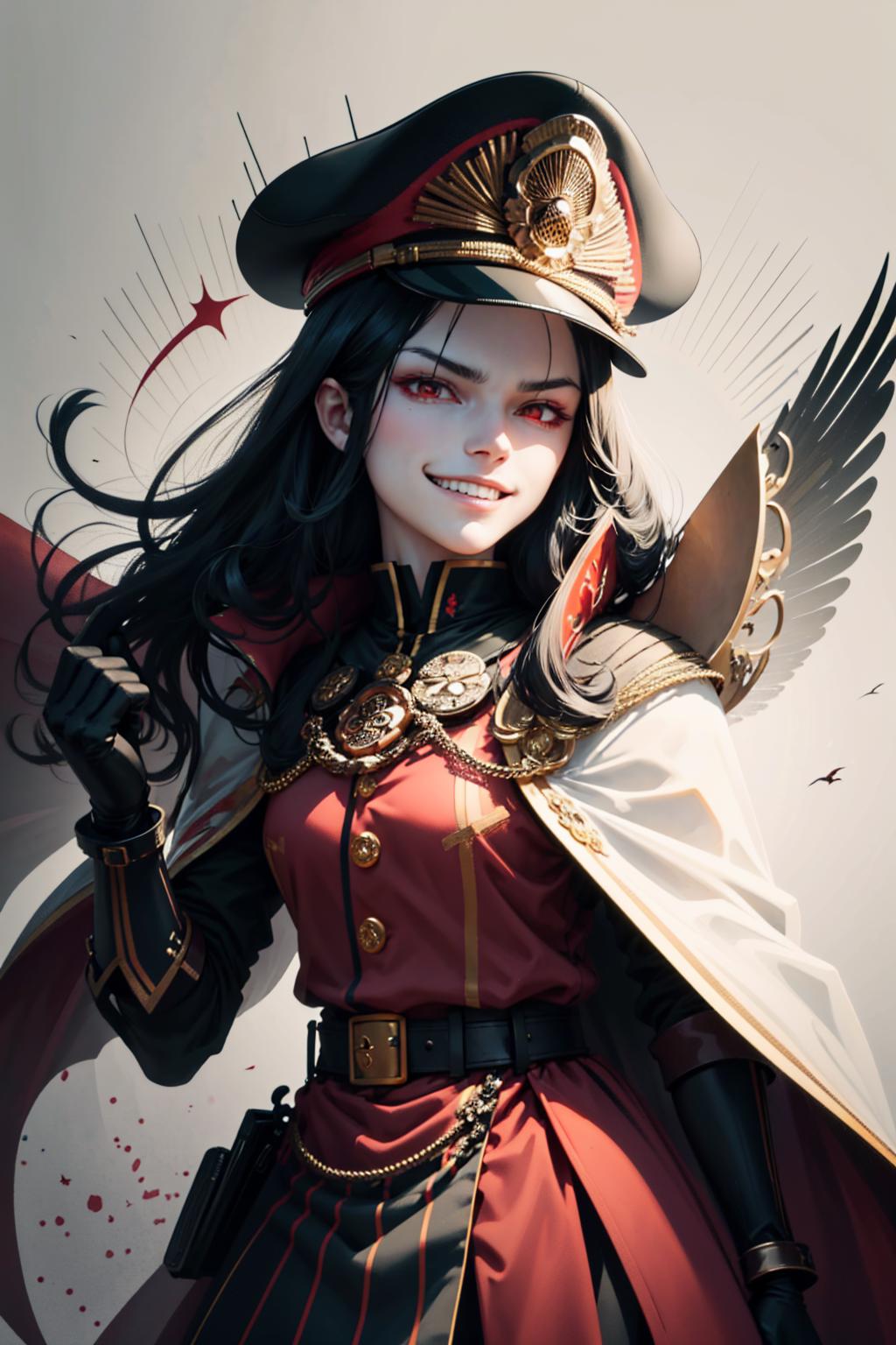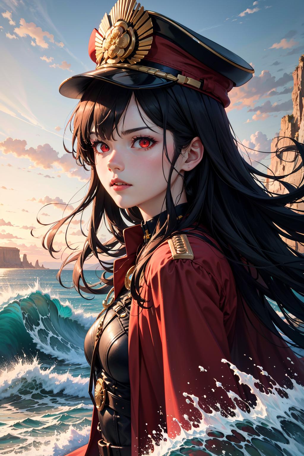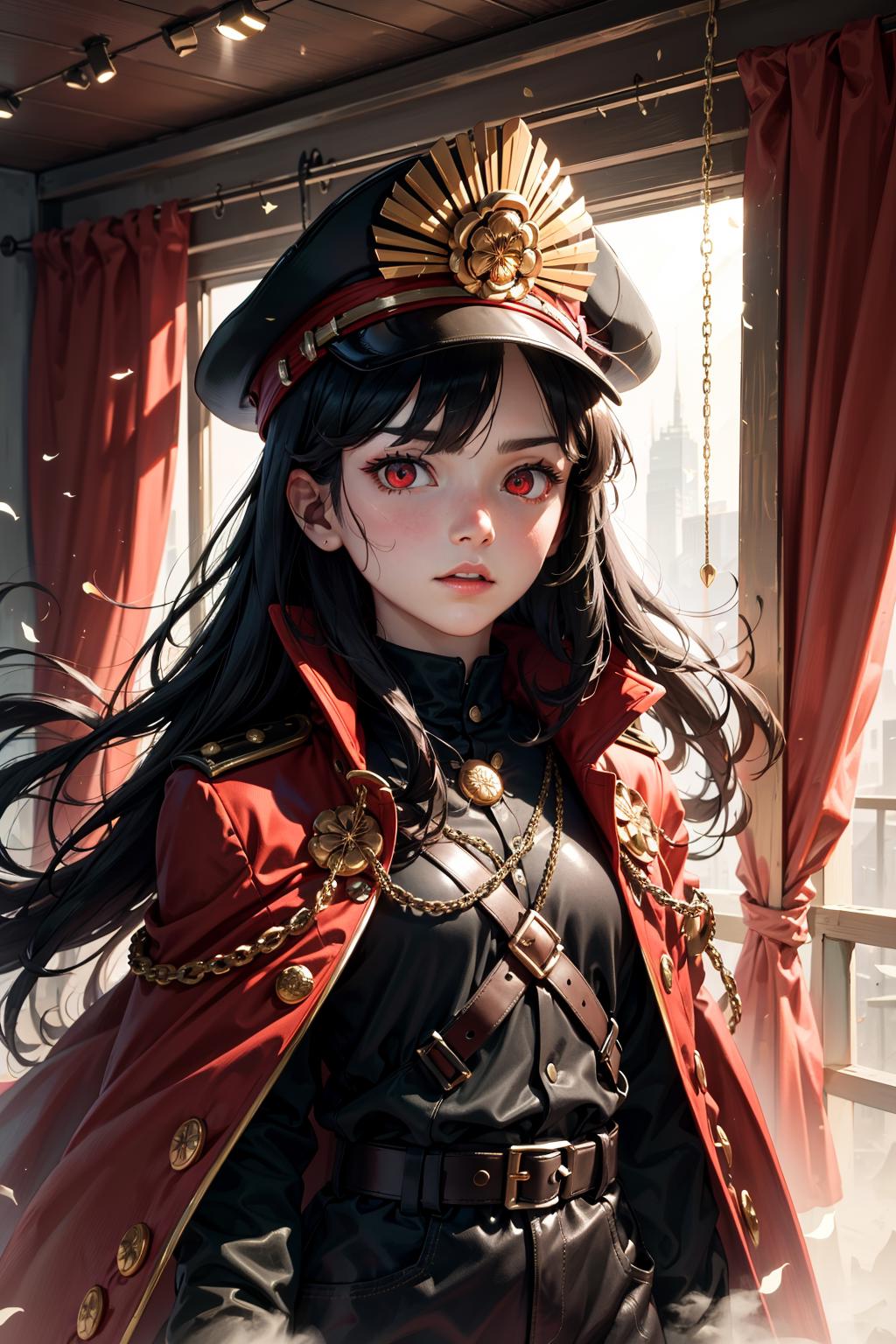 hat,cape, red eyes, military uniform,black hairDemon King Nobunaga: