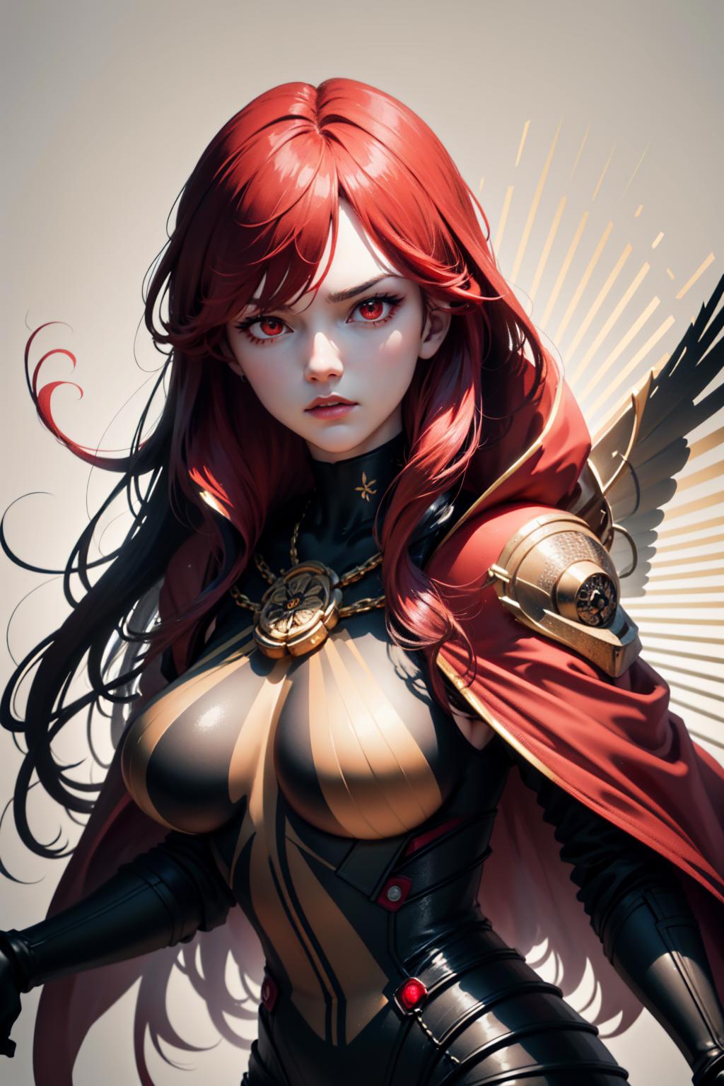 large breasts,red eyes,red hair,black bodysuit,chain,collared cape