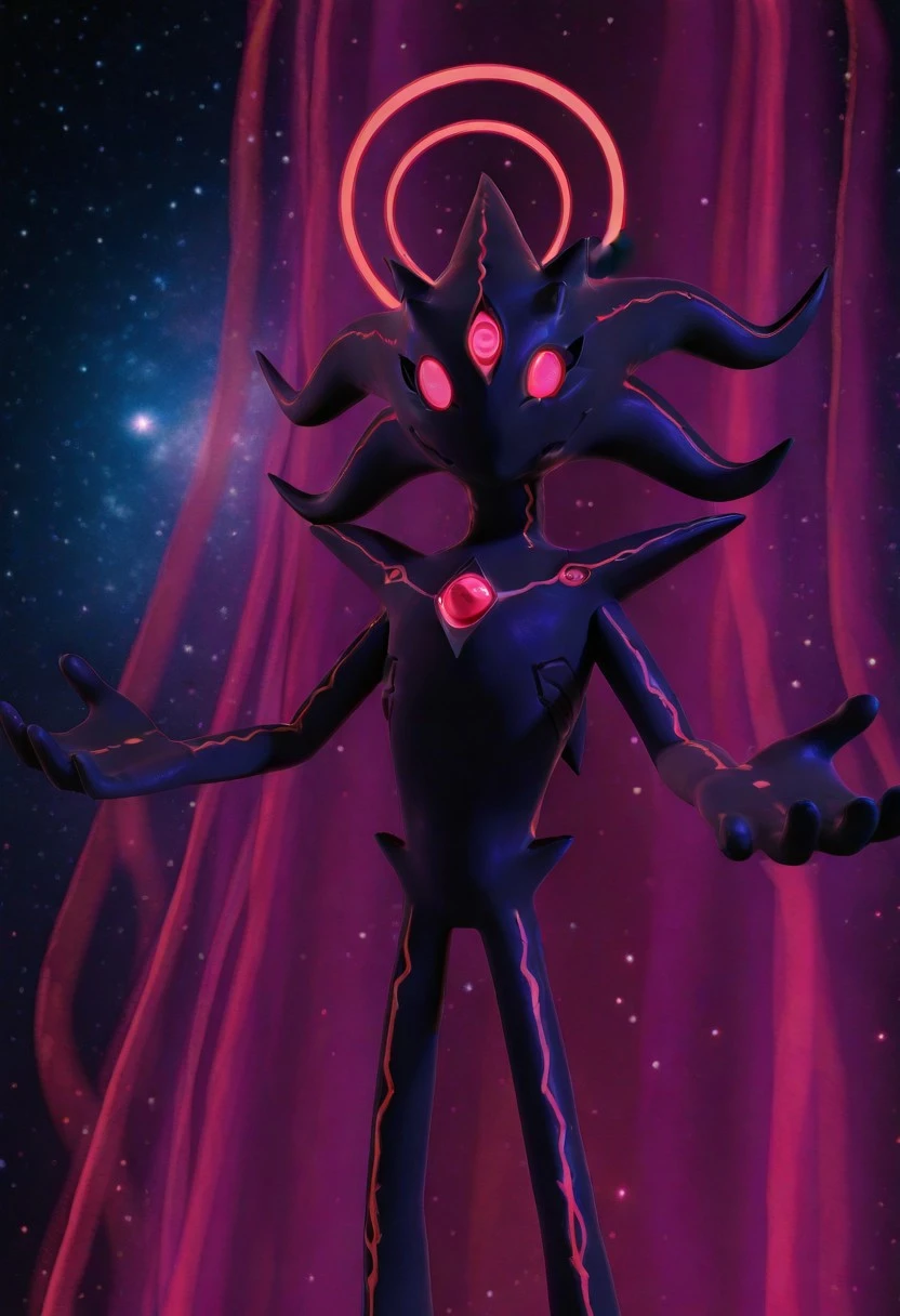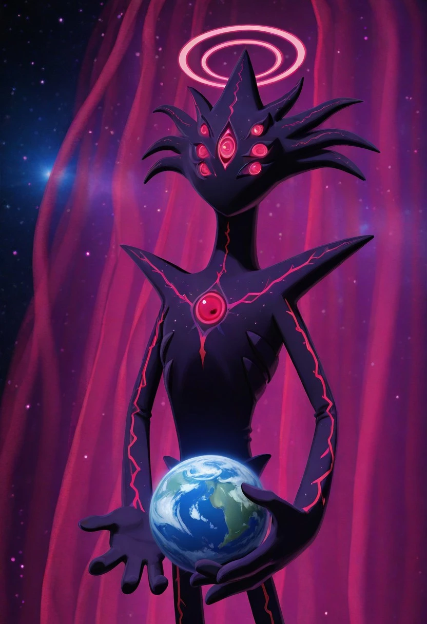 The End, eldritch being, dark purple skin, six eyes, pink sclerae, no pupils, pink diamond symbol in center of face and top of head, no mouth, red markings on body, pink core in chest, dark purple aura, red halo
