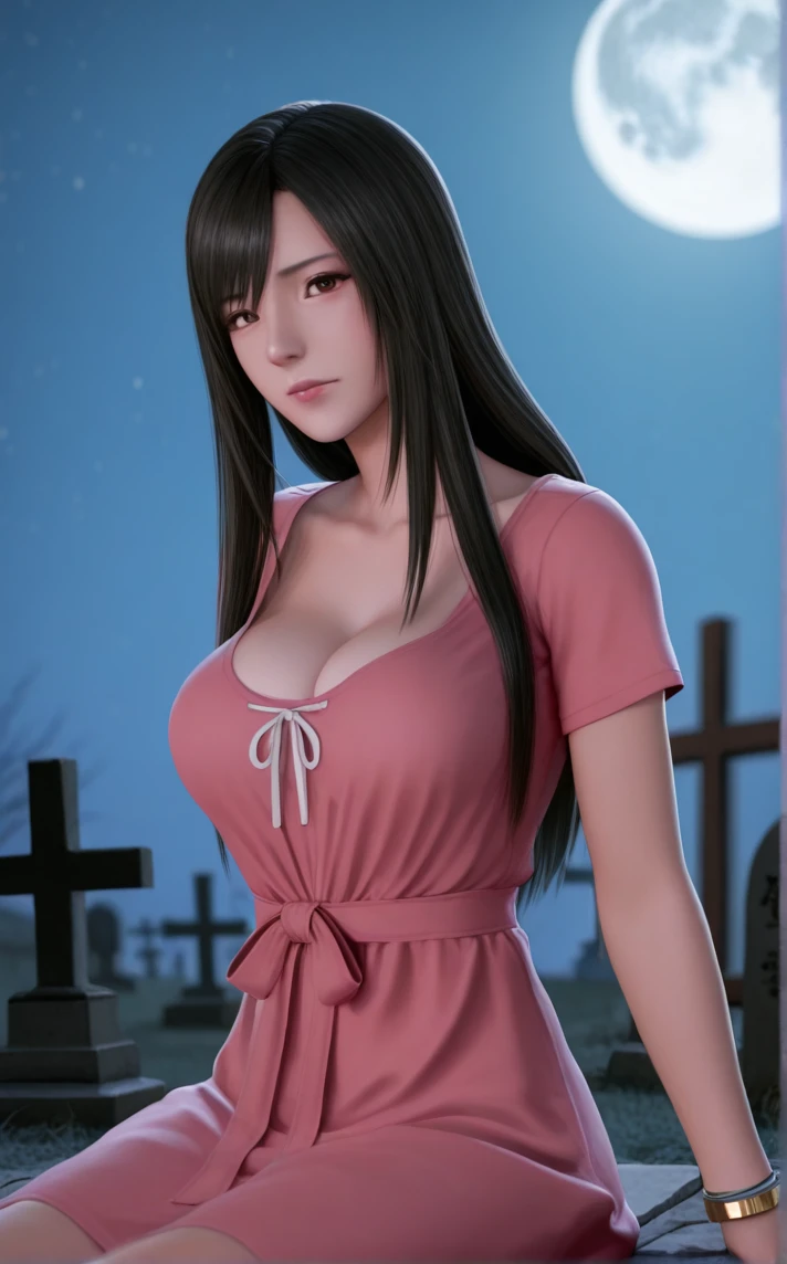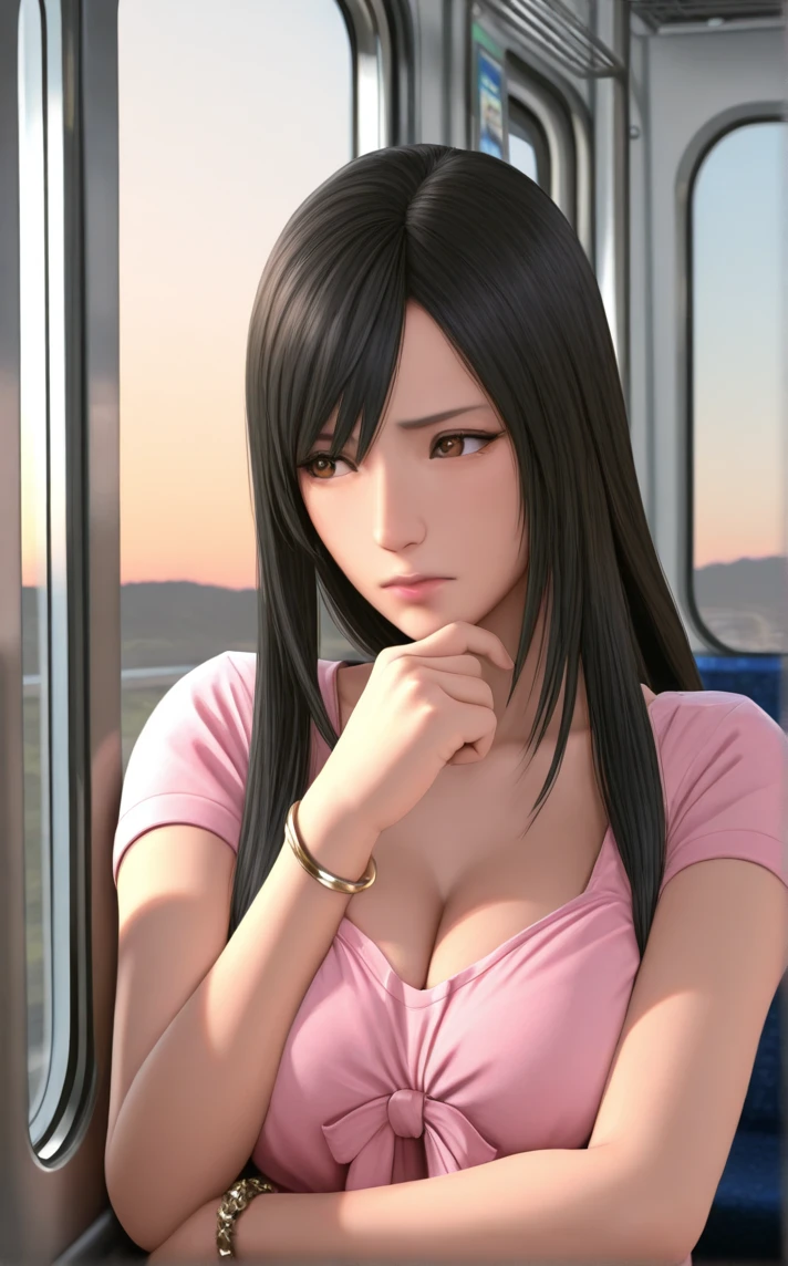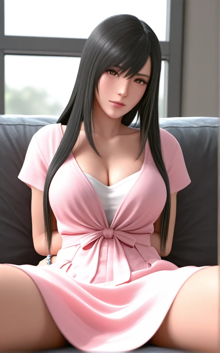 PinkDress_GanzO_ReikaShimohira_ownwaifu, 1girl, 3d, asian, black hair, large breasts, lips, nose, straight hair, long hair, short sleeves, brown eyes, cleavage, front-tie top, pink dress, pink shirt, bracelet, sleeveless,