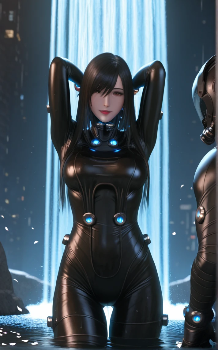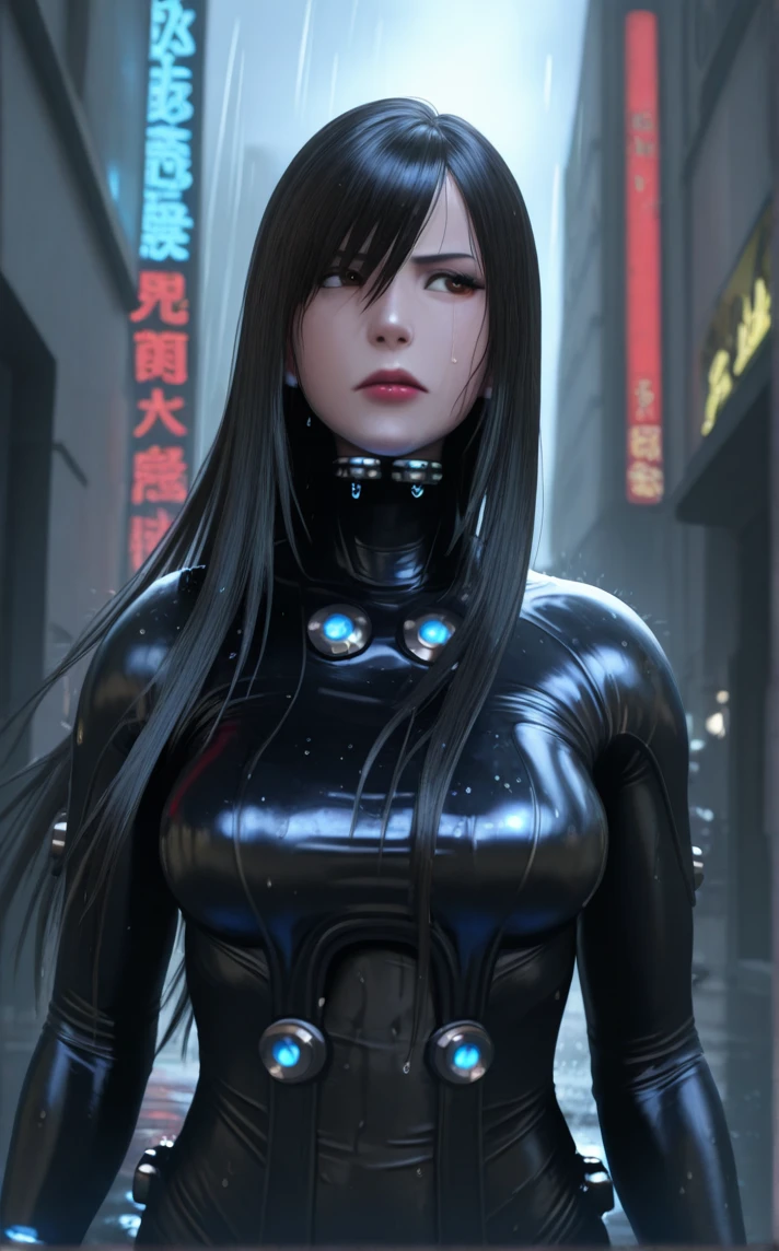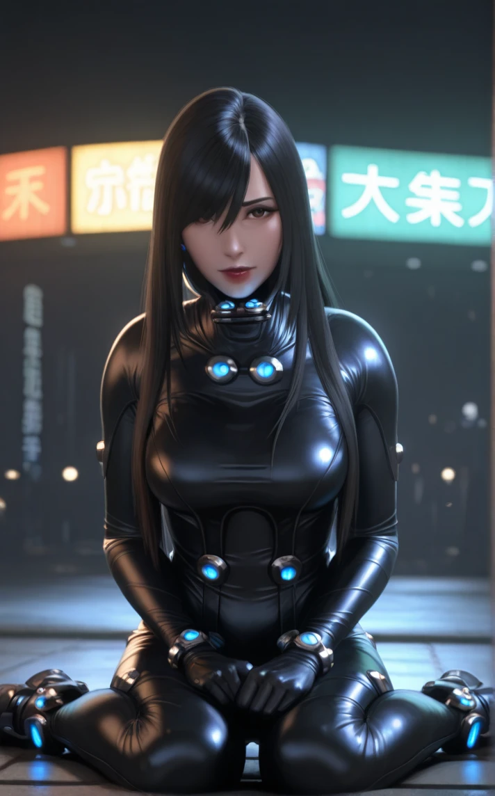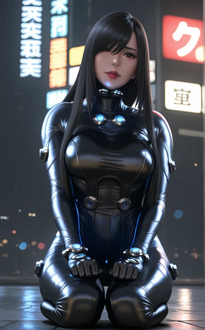 BodySuit_GanzO_ReikaShimohira_ownwaifu, 1girl, 3d, asian, nose, straight hair, lips, long hair, black hair, large breasts, black bodysuit, cyberpunk, medium breasts, jewelry, brown eyes, hair over one eye, skin tight, bangs, neon trim, armor, neon lights, hair between eyes, gem, swept bangs, latex bodysuit, turtleneck, power armor, black gloves, hair over eyes, red lips, collar, goggles around neck, light, makeup, bracelet, thigh gap, brooch, tall female, buttons, eyepatch, lipstick,