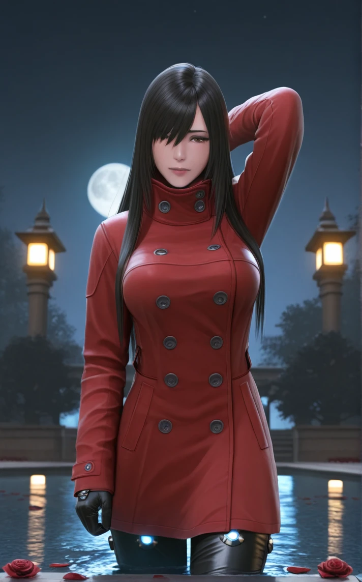 RedJacket_GanzO_ReikaShimohira_ownwaifu, 1girl, 3d, asian, long hair, nose, straight hair, lips, large breasts, black hair, red coat, red jacket, buttons, long sleeves, black gloves, bangs, brown eyes, turtleneck, double-breasted, jewelry, trench coat, high collar, cyberpunk, hair over eyes, black pants, hair between eyes, hair over one eye, winter clothes, long coat, bodysuit, neon trim, sleeves past wrists, goggles around neck, hair down, leather gloves, leather pants,