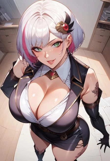 Promts: TopazNk, white hair, multicolored hair, green eyes, clothing cutout, short hair, hair ornament, black jacket, white collared shirt, cleavage, detached sleeves, black elbow gloves, belt, black knee boots, tattoos,wide hips,