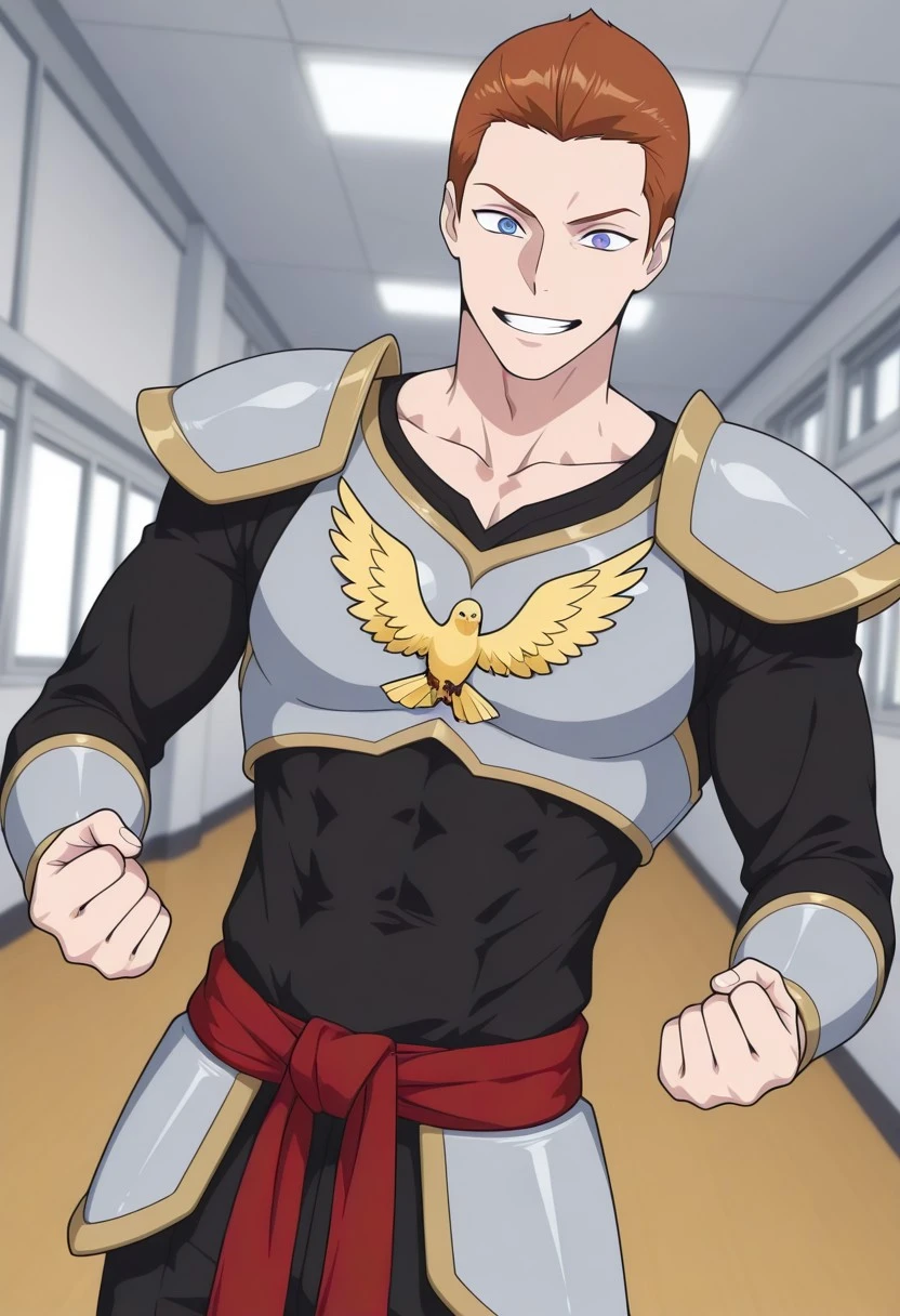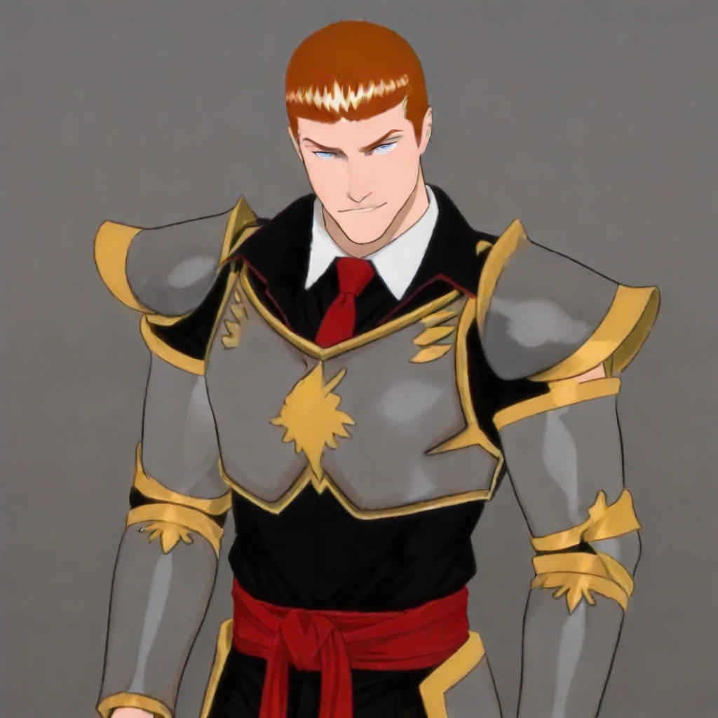black pants, silver-gray armor, gold trim, black shirt, a red sash tied around his waist, gold bird symbol on Chestplate,