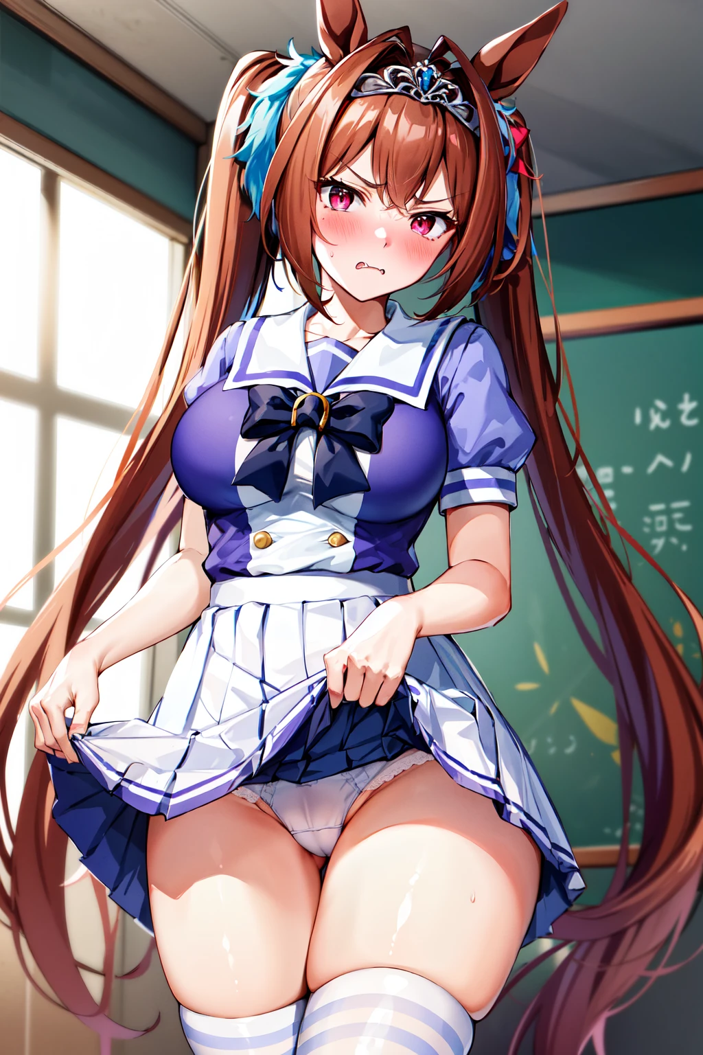 1girl, horse ears, solo, daiwa scarlet (umamusume), tracen school uniform, white thighhighs, white skirt, twintails, sailor shirt, puffy short sleeves, horse tail, very long hair, brown hair, bow, sailor collar, bowtie, purple shirt, hair intakes, tiara, fang, red eyes, large breasts, bangs