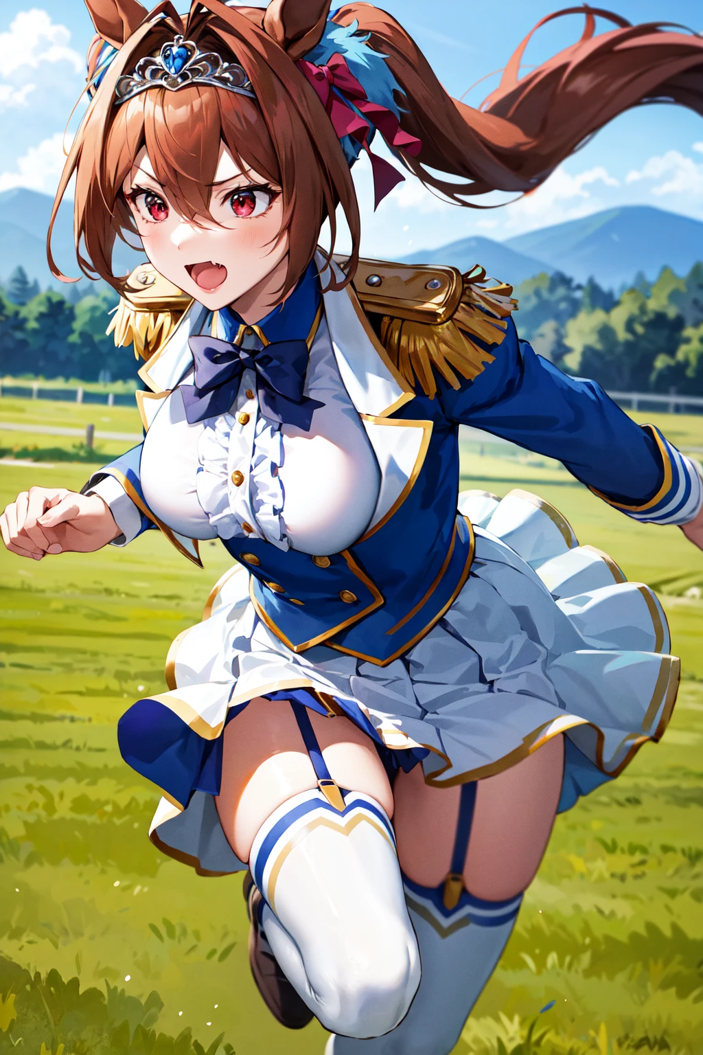 1girl, solo, daiwa scarlet (umamusume), horse ears, twintails, tiara, horse tail, long hair, brown hair, epaulettes, garter straps, long sleeves, breasts, fang, red eyes, bowtie, bangs, blue jacket, white thighhighs, white shirt, white skirt, hair bow