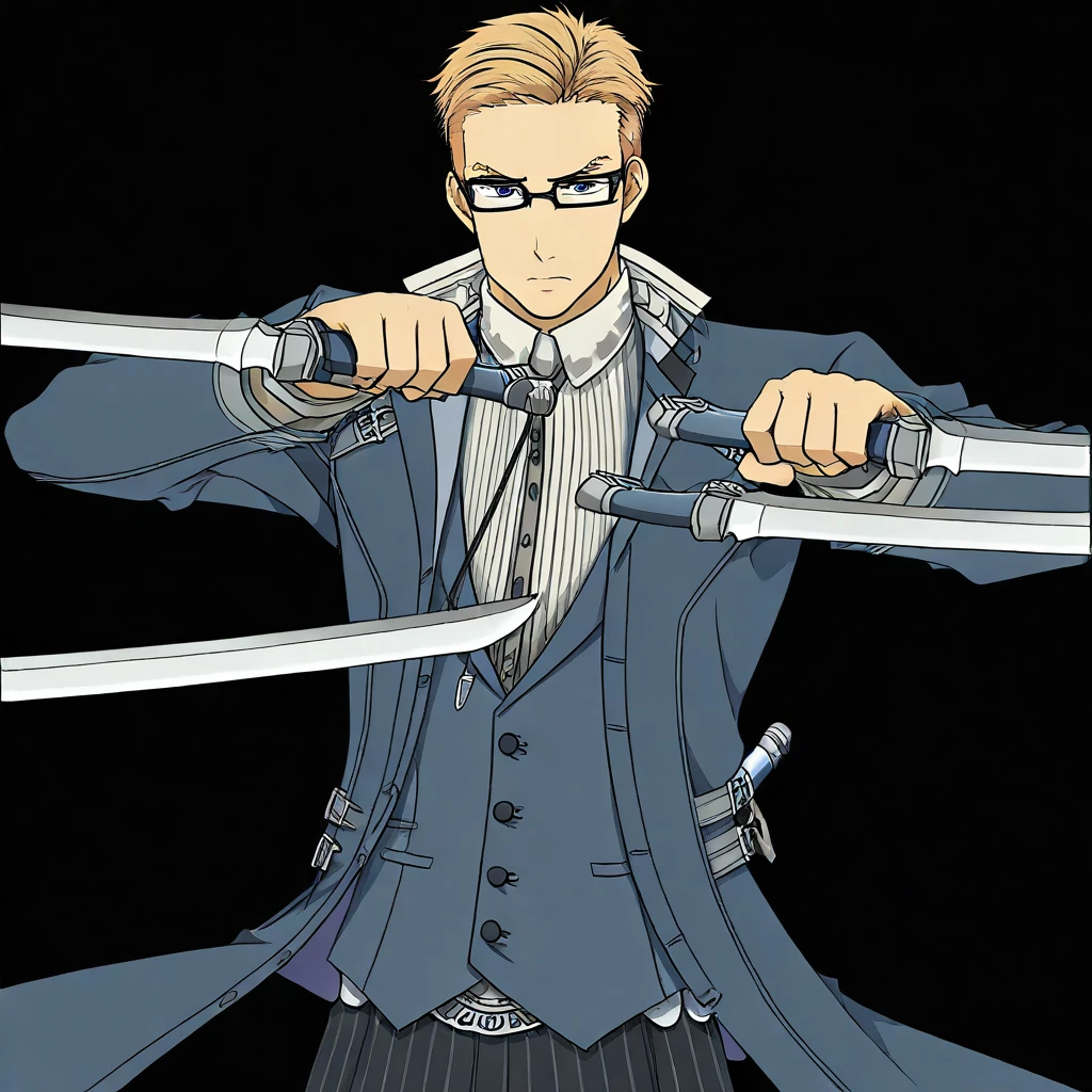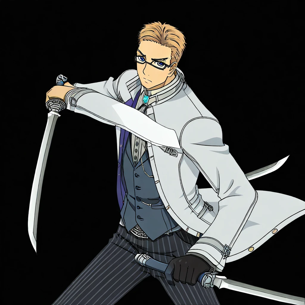 Julius, brown hair, undercut, blue eyes, glasses, white jacket, formal undershirt, striped pants