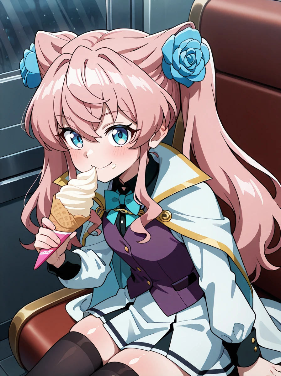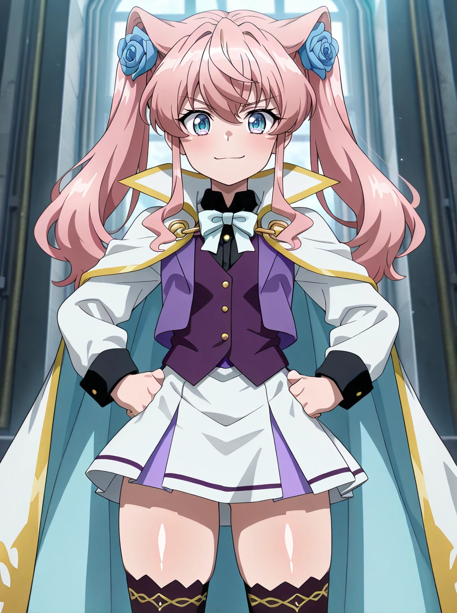 anothermariacasual, cape black_thighhighs, black_shirt purple_vest blue eyes, gold_chain, bowtie, white sleeves, hair flower