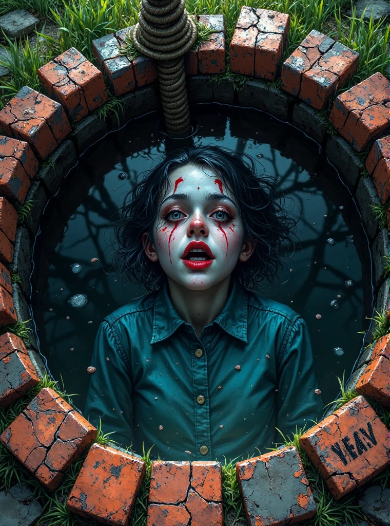 In the dimly lit room, old dolls scattered on the ground, with a one eyed doll sitting on a rocking chair, staring ahead with hollow eyes. The wall next to it is covered in blood handprints, the ceiling chandelier sways, and the lights flicker on and off. In the corner, a girl's figure appeared faintly, her long hair covering her face, slowly walking towards the camera, as if she would break through the frame in the next second