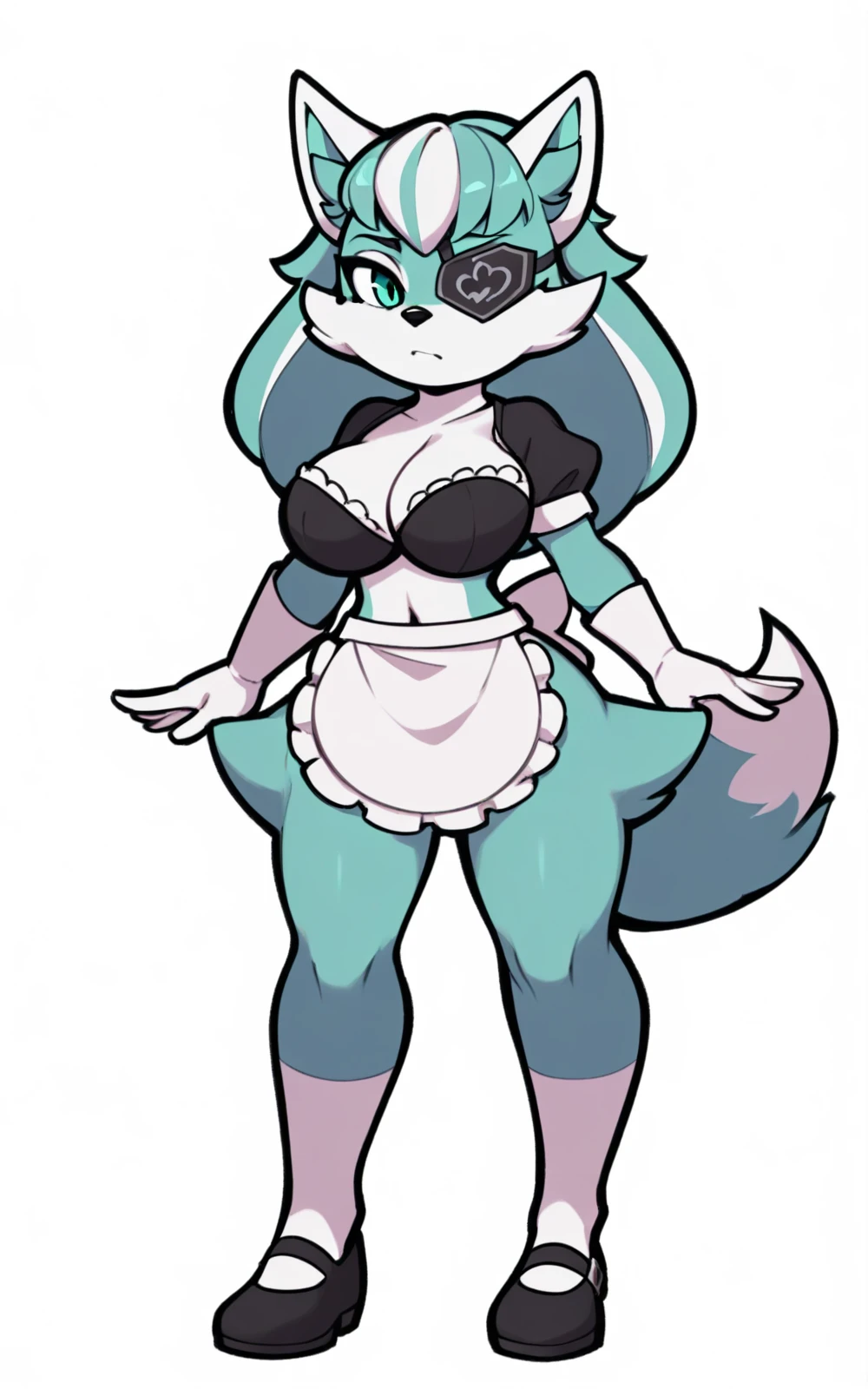 For her Outfit: mary janes, shoes, maid apron, apron, white apron, midriff, bra, black bra, short sleeves, puffy short sleeves, gloves, white gloves, eyepatch