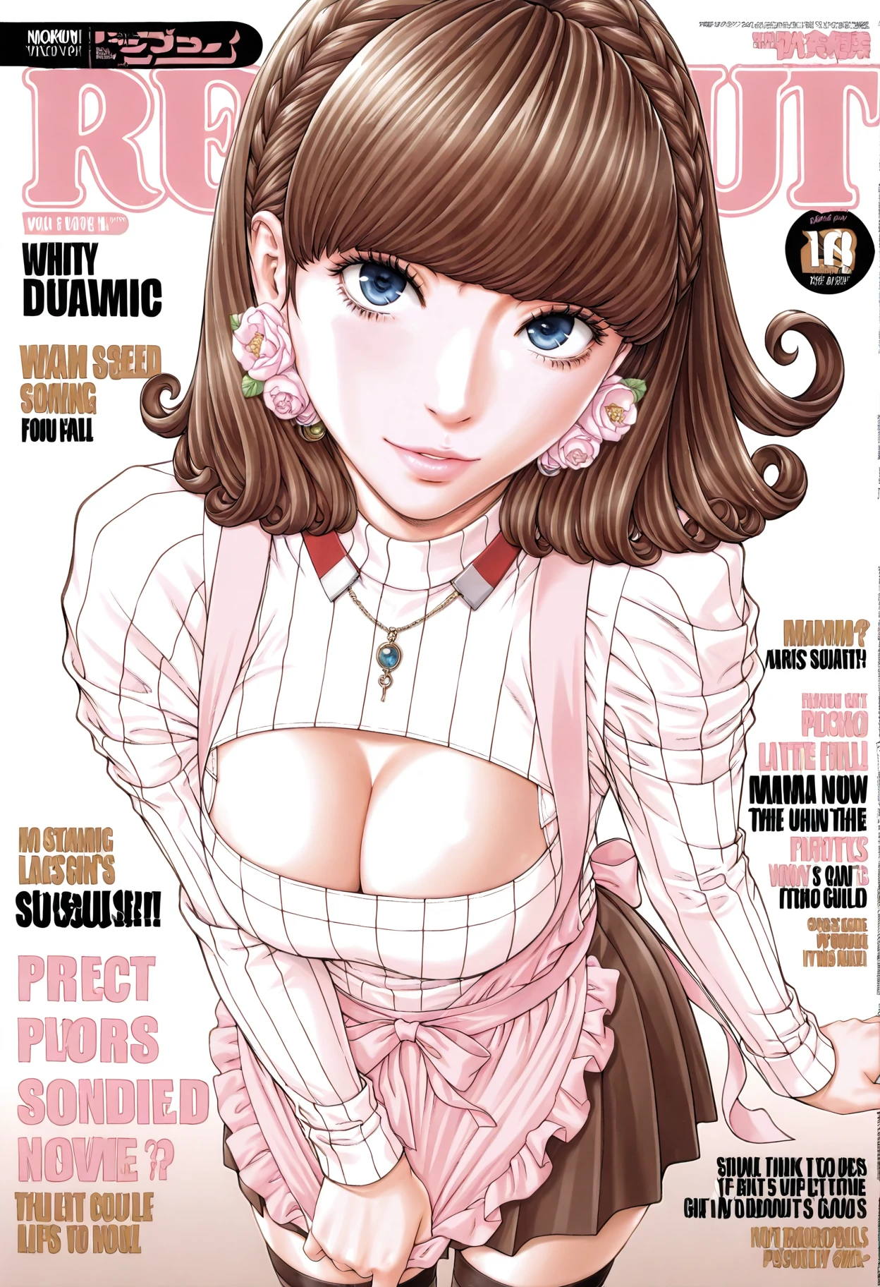 jewelry,earrings,cleavage cutout,clothing cutout,sweater,apron,necklace,skirt,thighhighs,ribbed sweater,dress,large breasts,flower earrings,turtleneck,shoes,open-chest sweater,pleated skirt