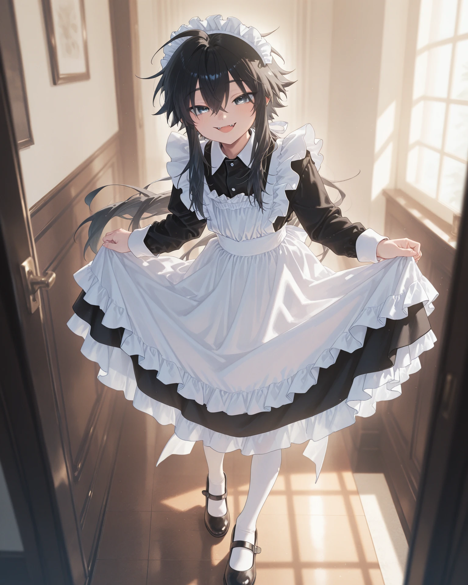 Clothes: male maid, otoko no ko, crossdressing, maid headdress, maid apron, black collared dress, mary janes