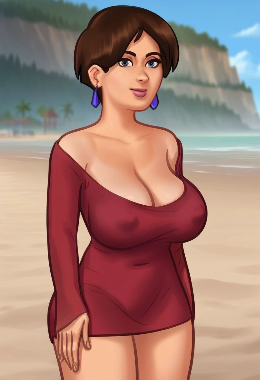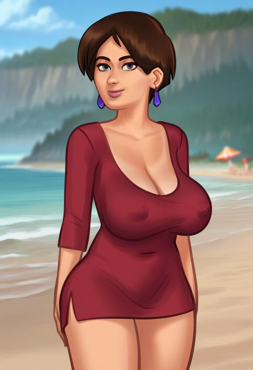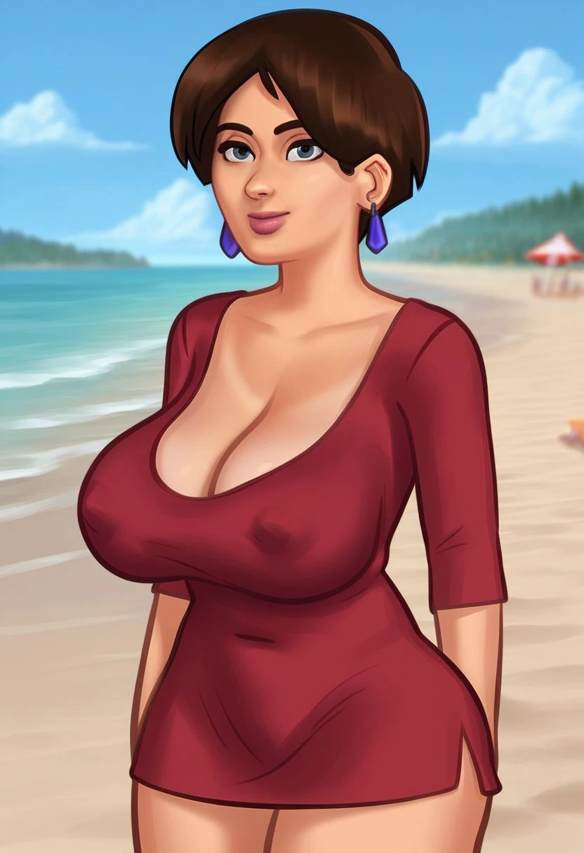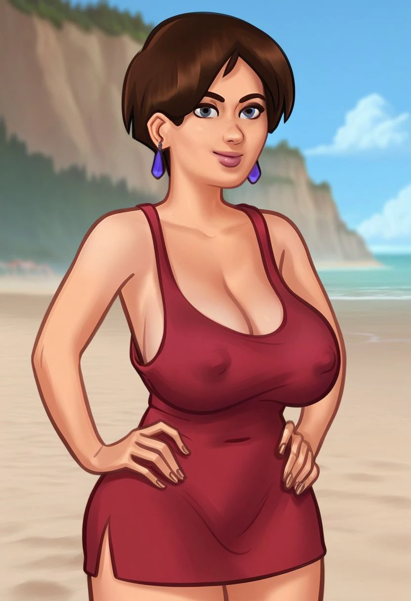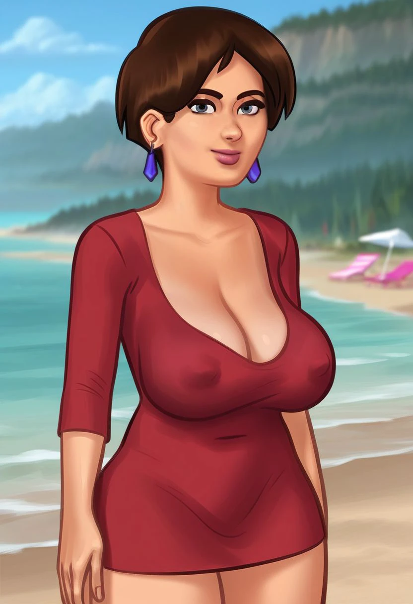 red dress, short dress, no bra, cleavage, covered nipples, sleeves