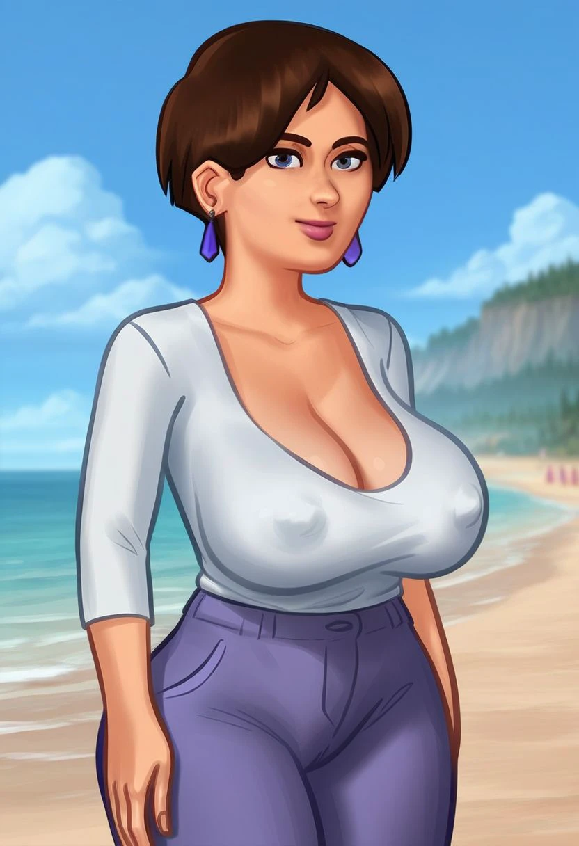 white shirt, no bra, cleavage, covered nipples, purple pants