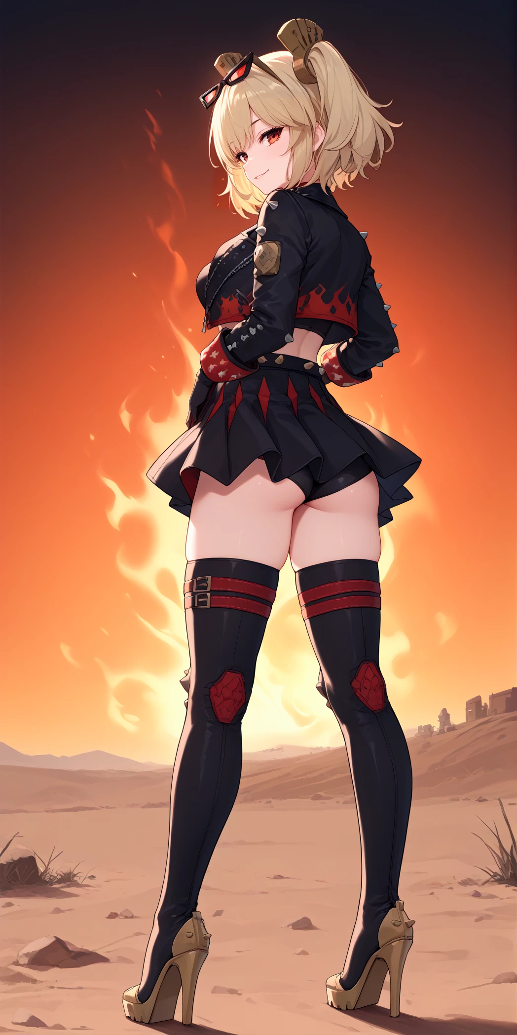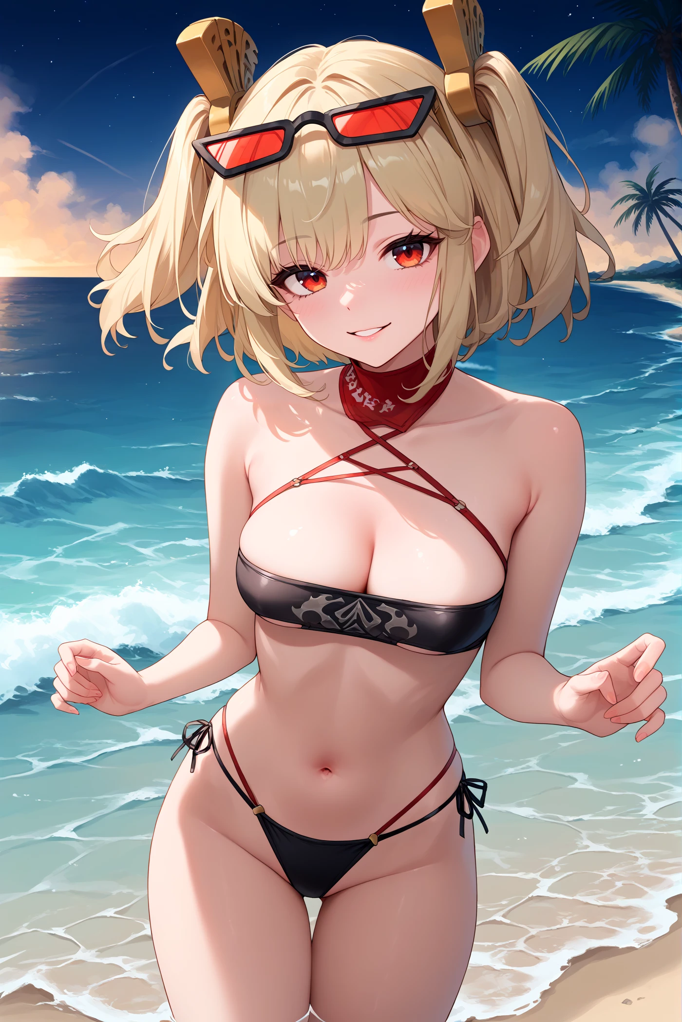 Base prompt: 8urn1c3, blonde hair, twintails, red eyes, eyewear on head