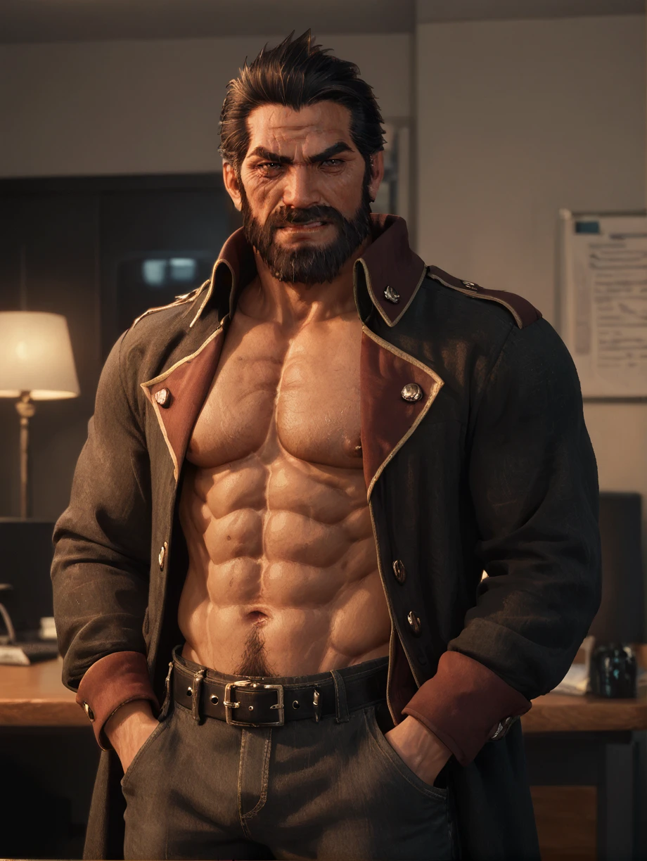 Heidegger, short hair, facial hair, wrinkles, mature male, black suit, red tie, officer's coat