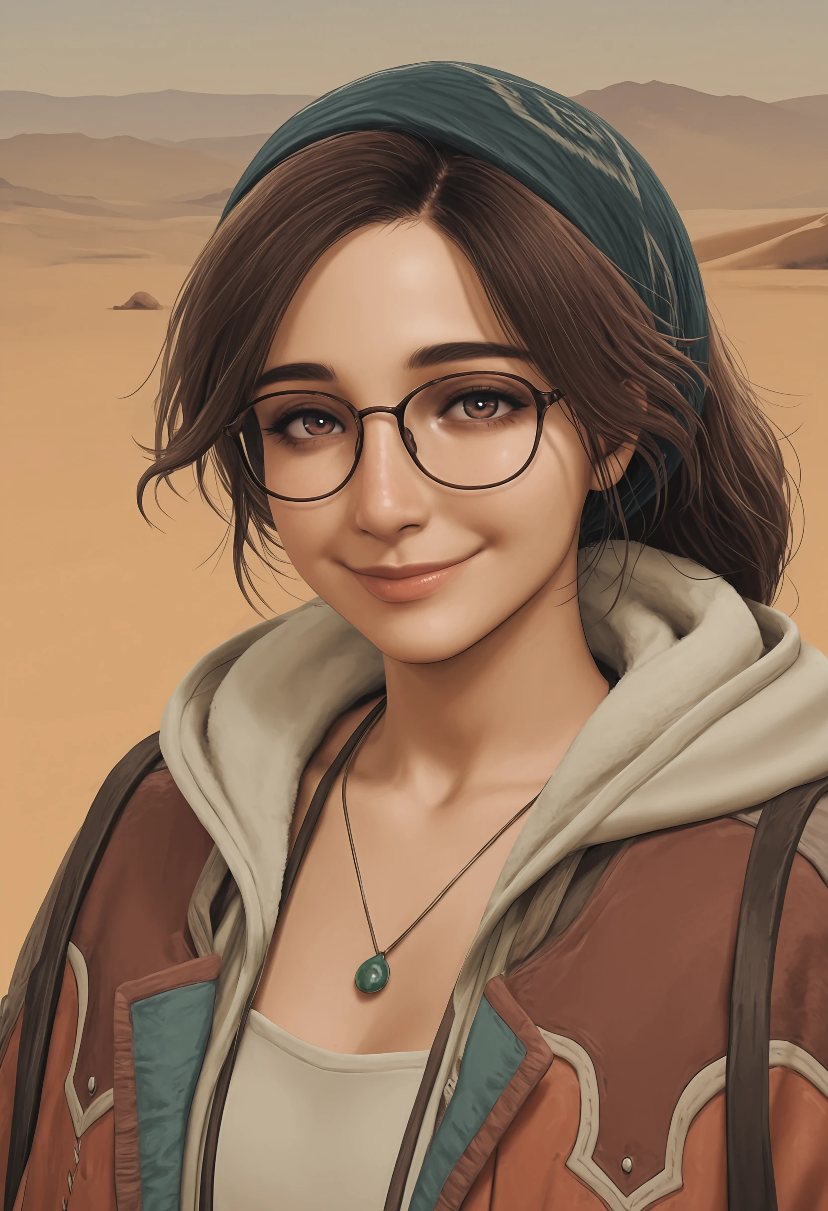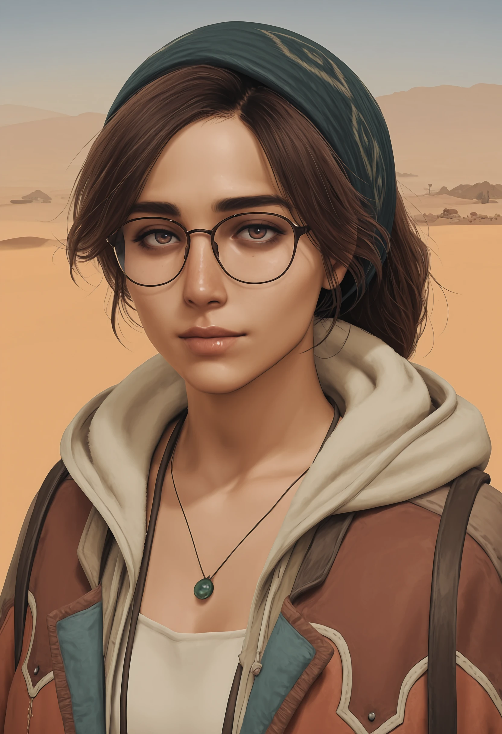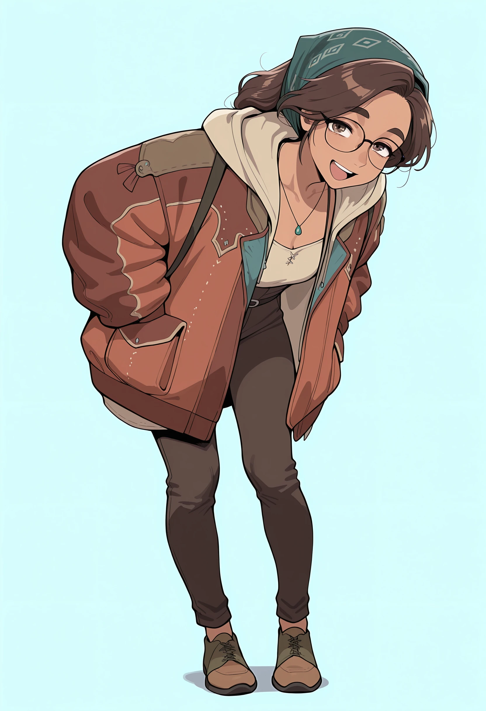 brown hair, brown eyes, bandana, glasses, necklace, jacket