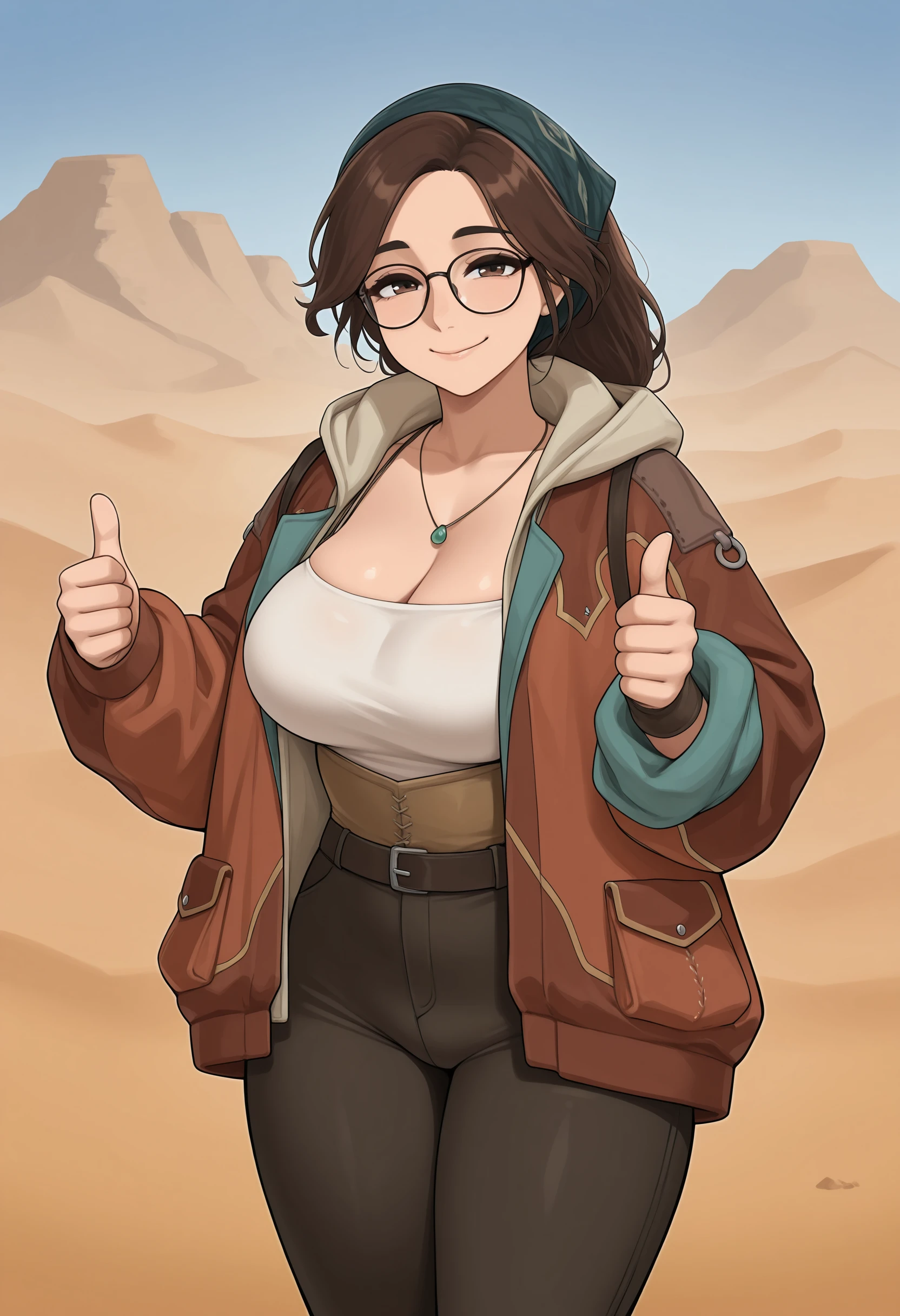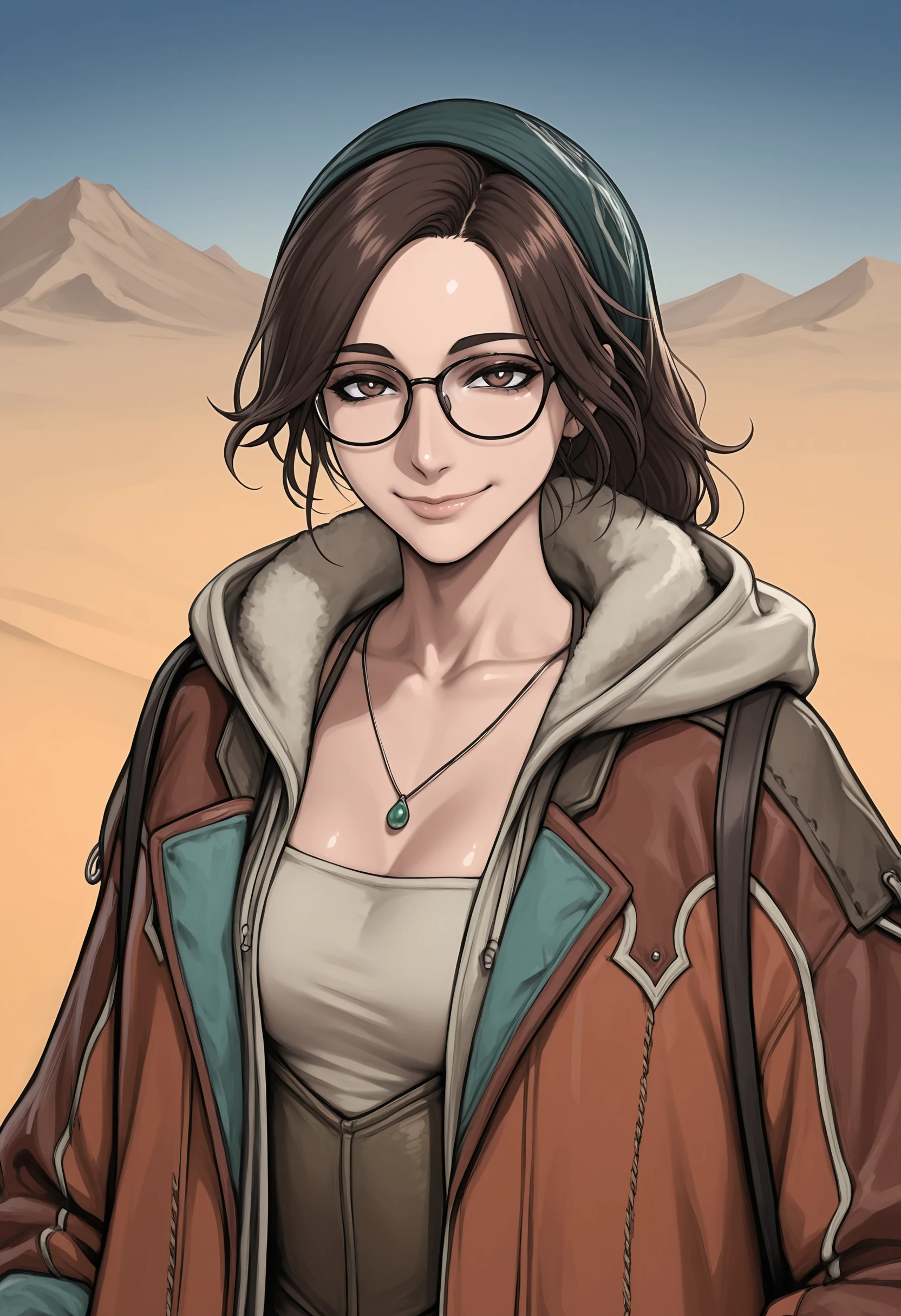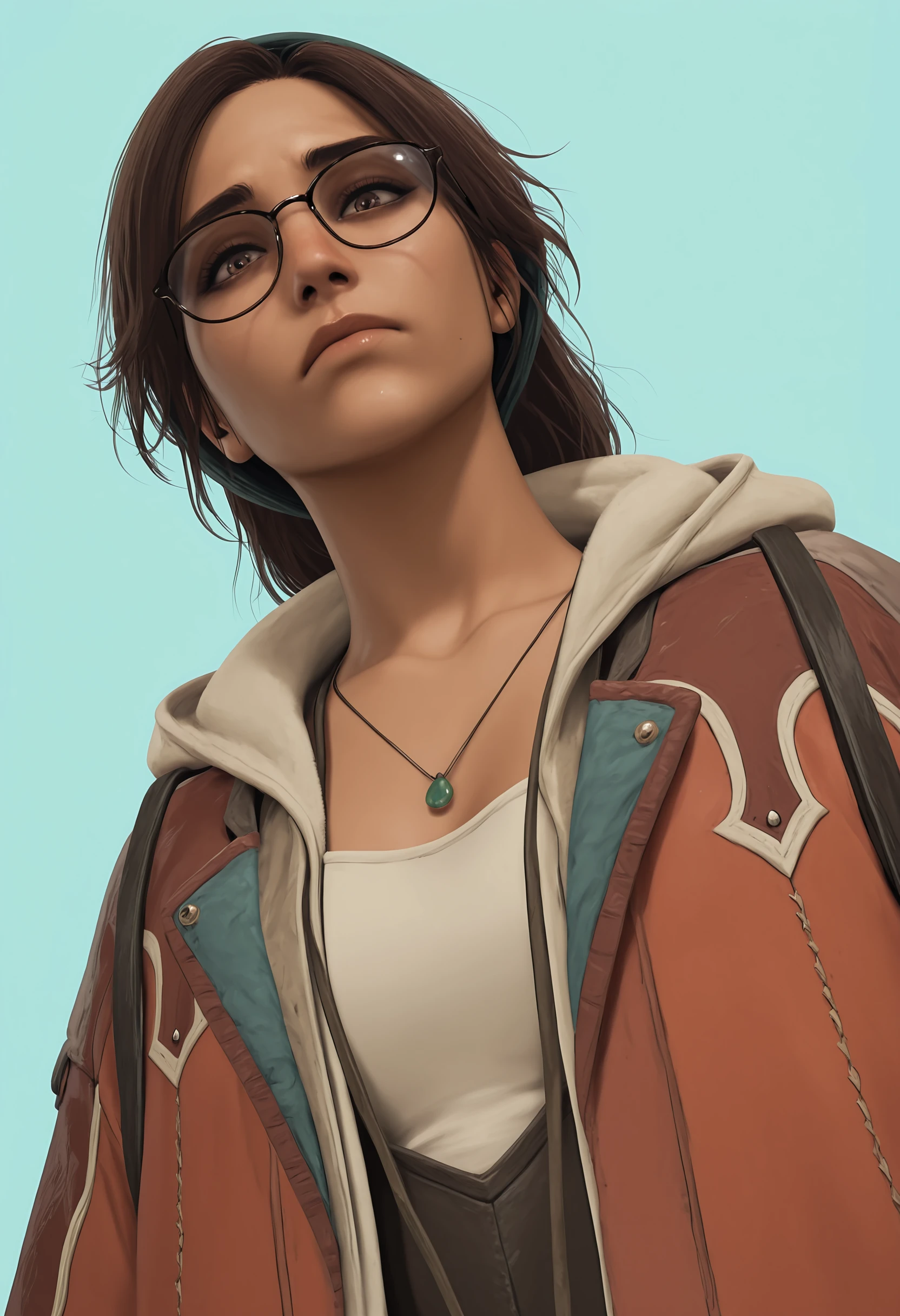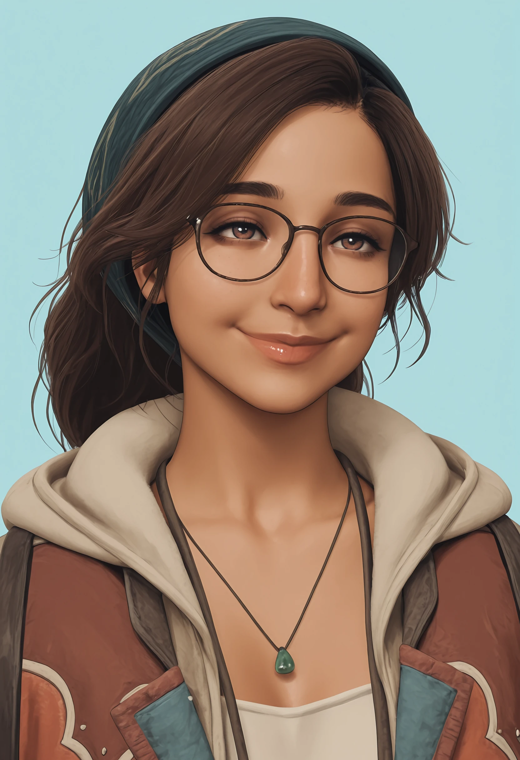 brown hair, brown eyes, bandana, glasses, necklace, jacket