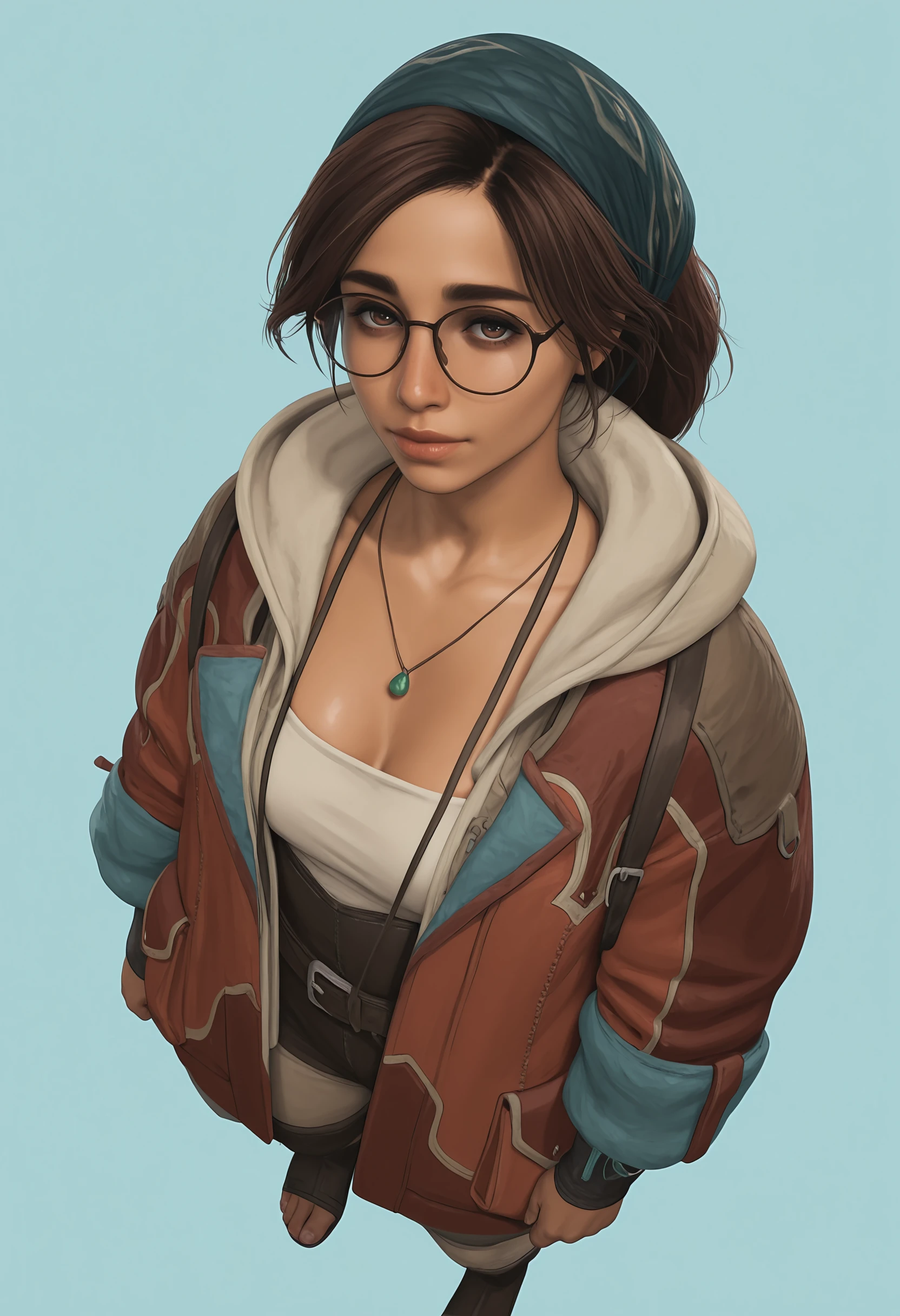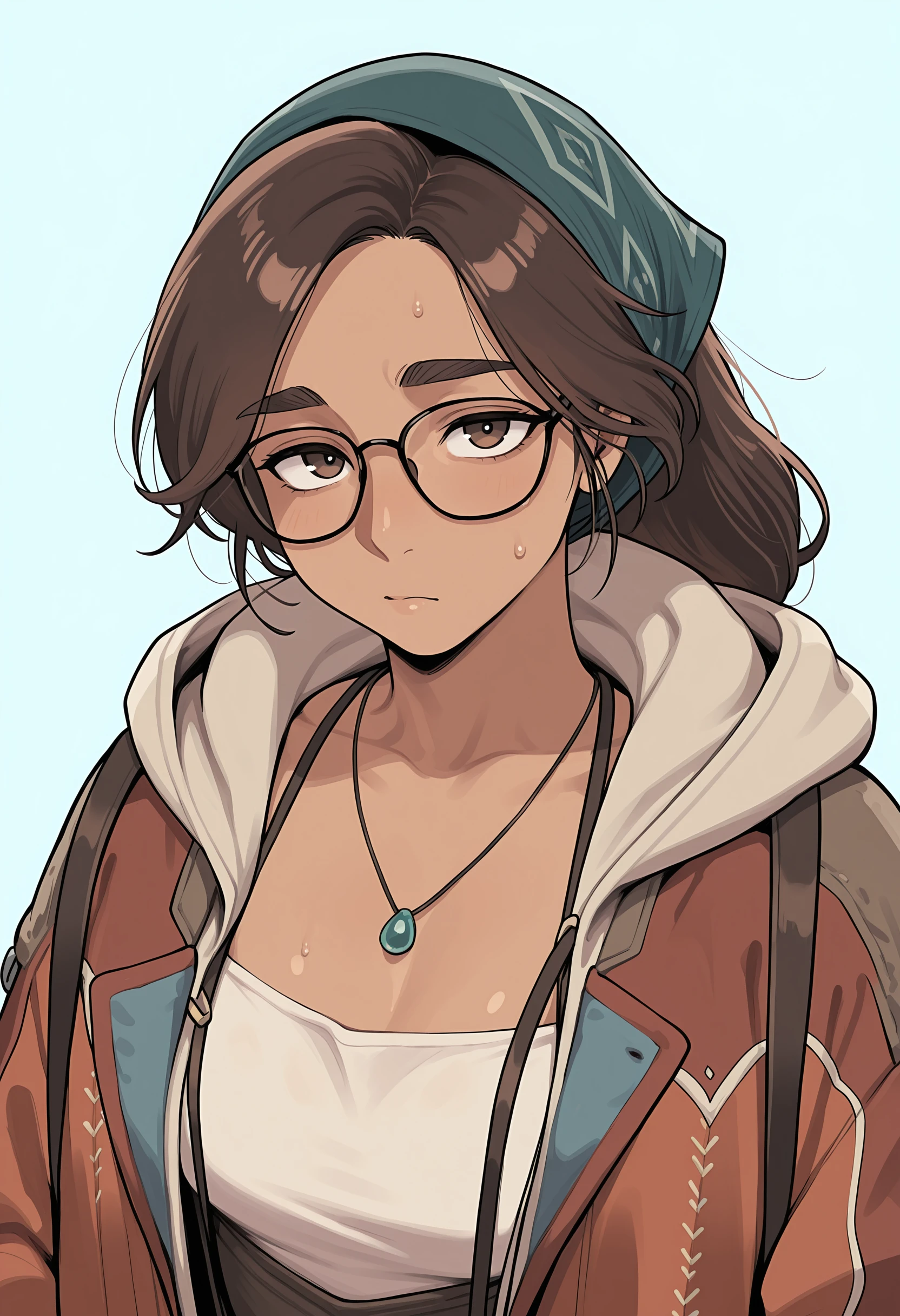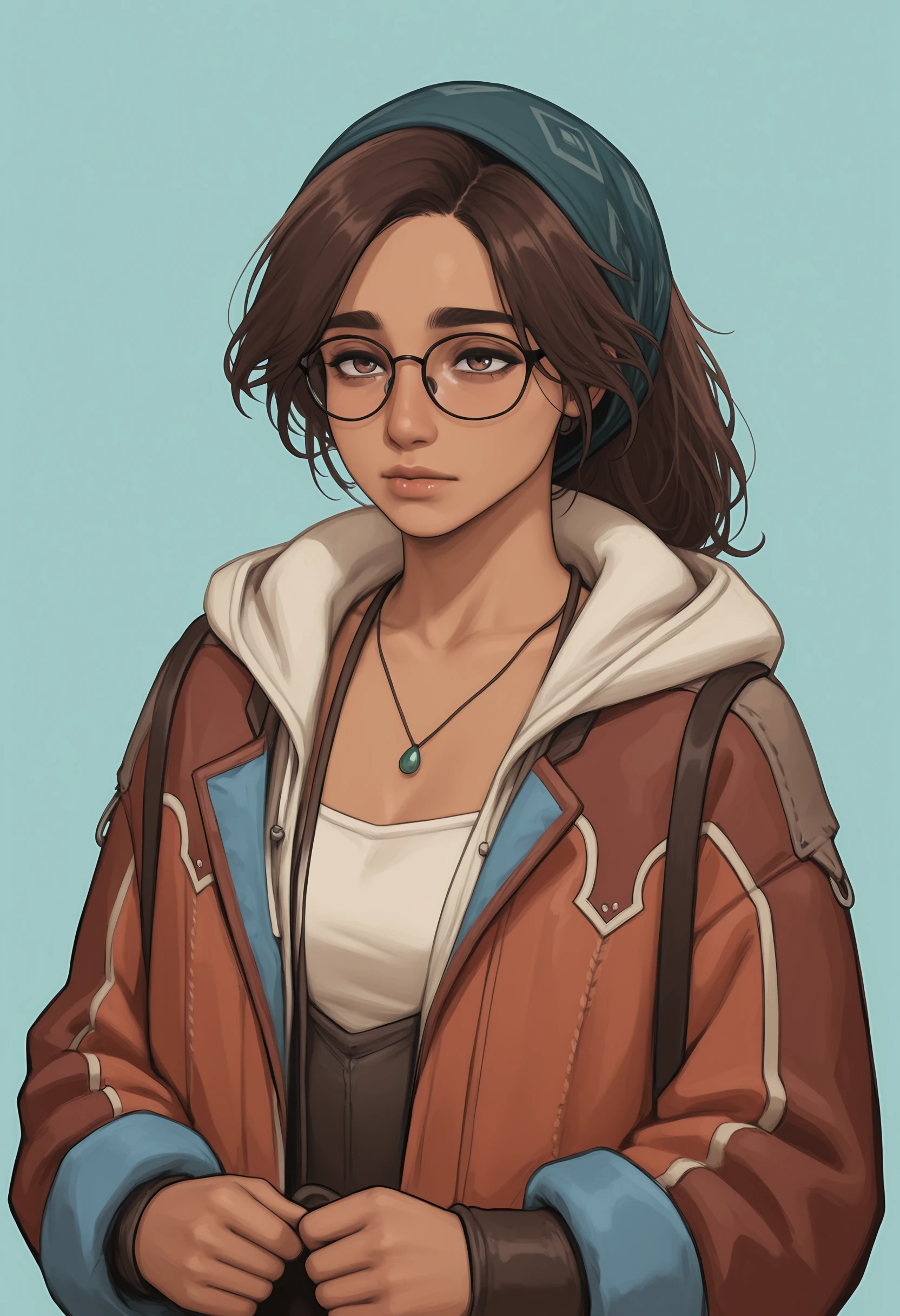 alwilf, brown hair, brown eyes, bandana, glasses, necklace, jacket