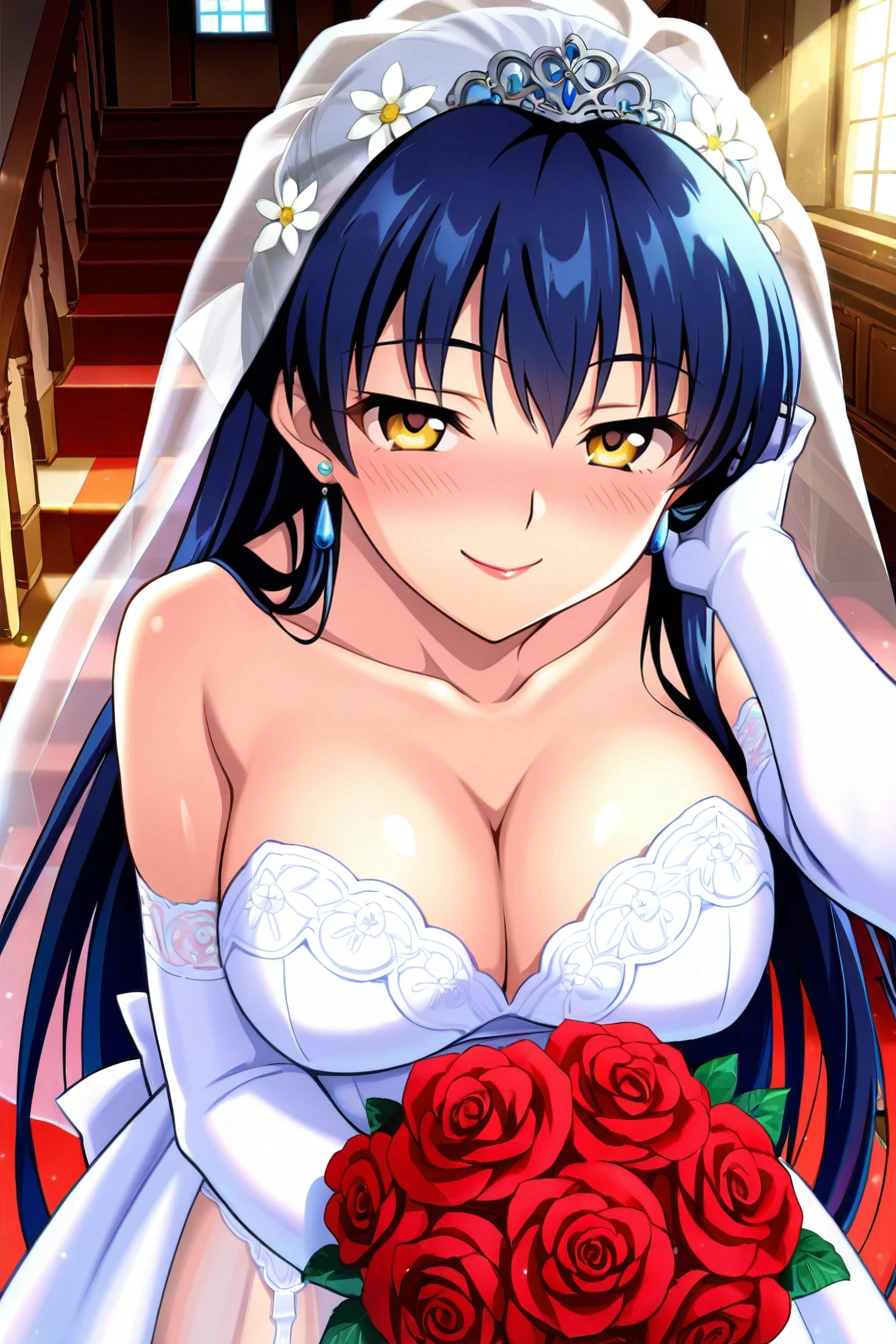 blue hair,long hair,hair bangs,half updo,yellow eyes,red bow,hair bow